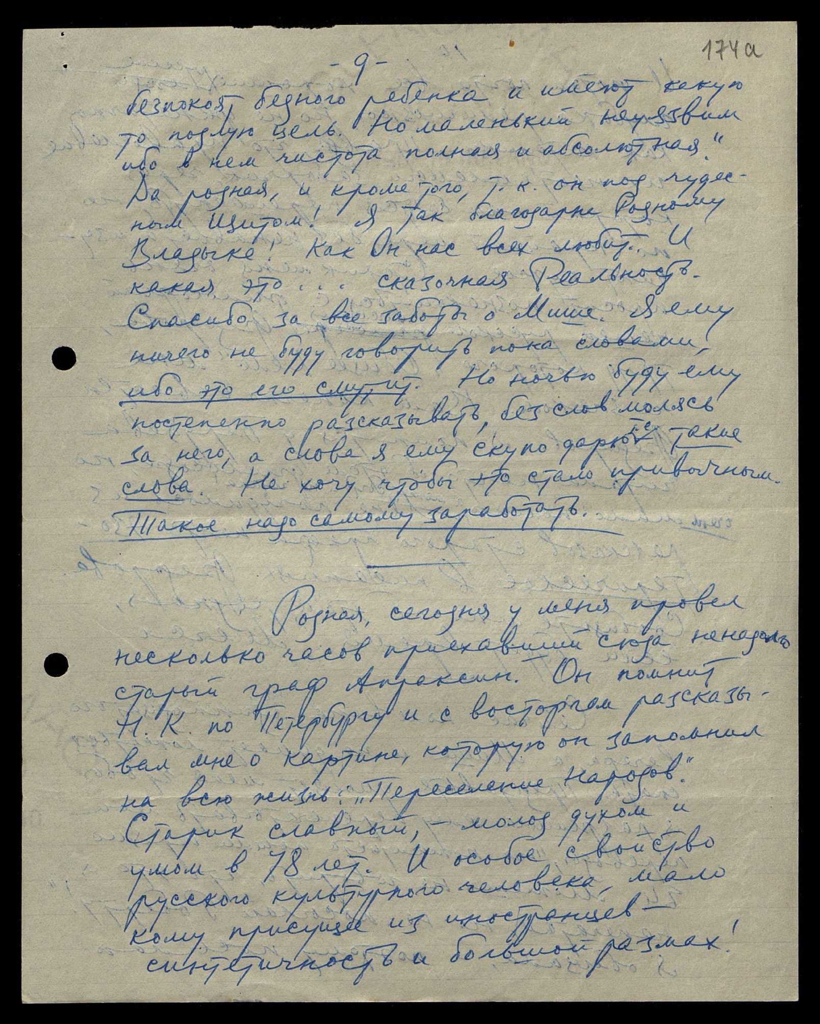 Родная, сегодня у меня провёл несколько часов приехавший сюда на неделю старый граф Апраксин. Он помнит Н[иколая] К[онстантиновича] по Петербургу и с восторгом рассказывал мне о картине, которую он запомнил на всю жизнь: «Переселение Народов». Старик славный, — молод духом и умом в 78 лет. И особое свойство русского культурного человека, мало кому присущее из иностранцев, — синтетичность и большой размах!