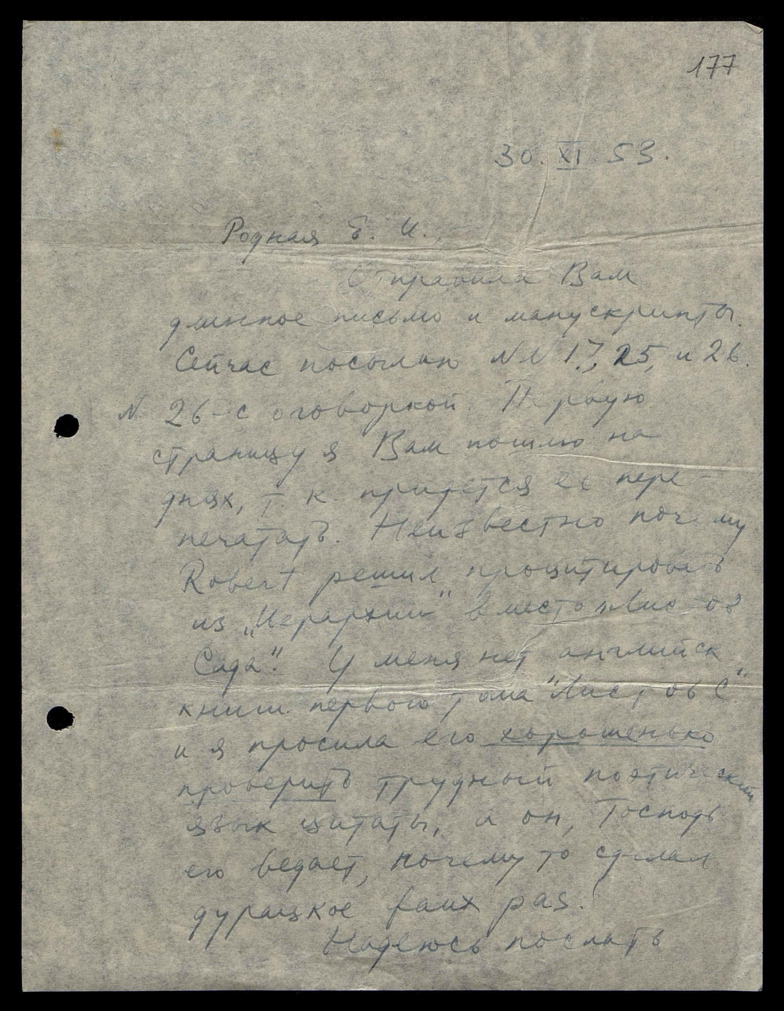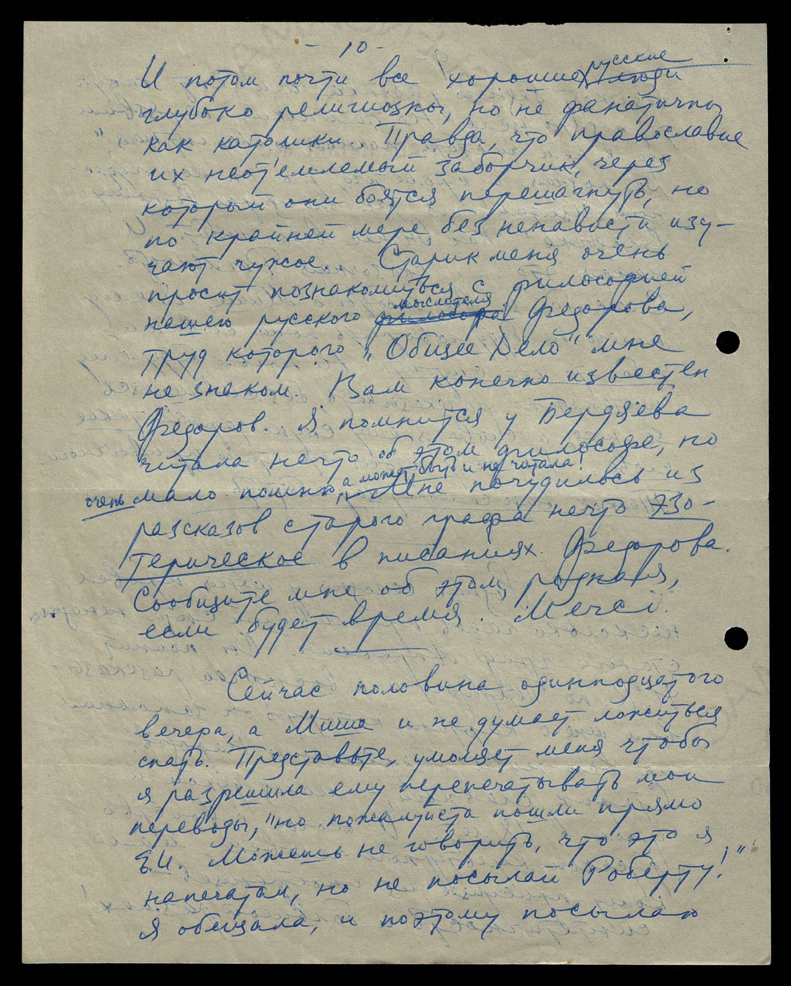 Отправила Вам длинное письмо и манускрипты. Сейчас посылаю №№ 17, 25, и 26. № 26 — с оговоркой. Первую страницу я Вам пошлю на днях, так как придётся её перепечатать. Неизвестно почему Robert решил процитировать из "Иерархии" вместо "Листов Сада". У меня нет английск[ой] книги первого тома "Листов С[ада]", и я просила его хорошенько проверить трудный поэтический язык цитаты, а он, Господь его ведает, почему-то сделал дурацкое faux pas [англ.: ошибка]!
