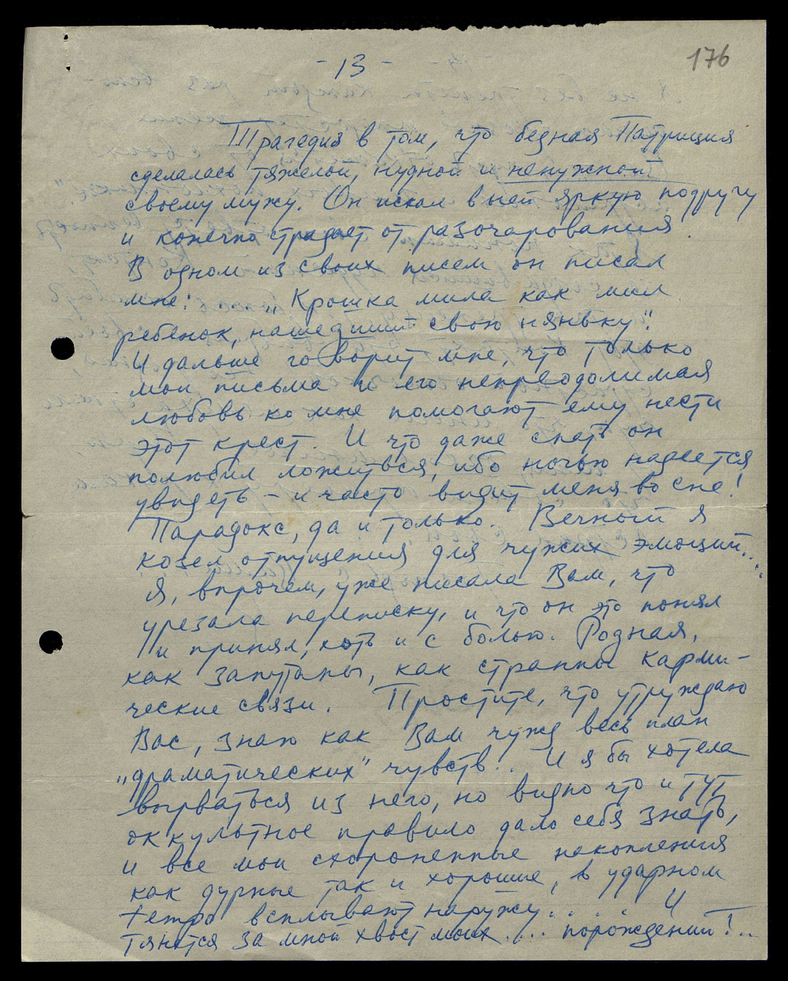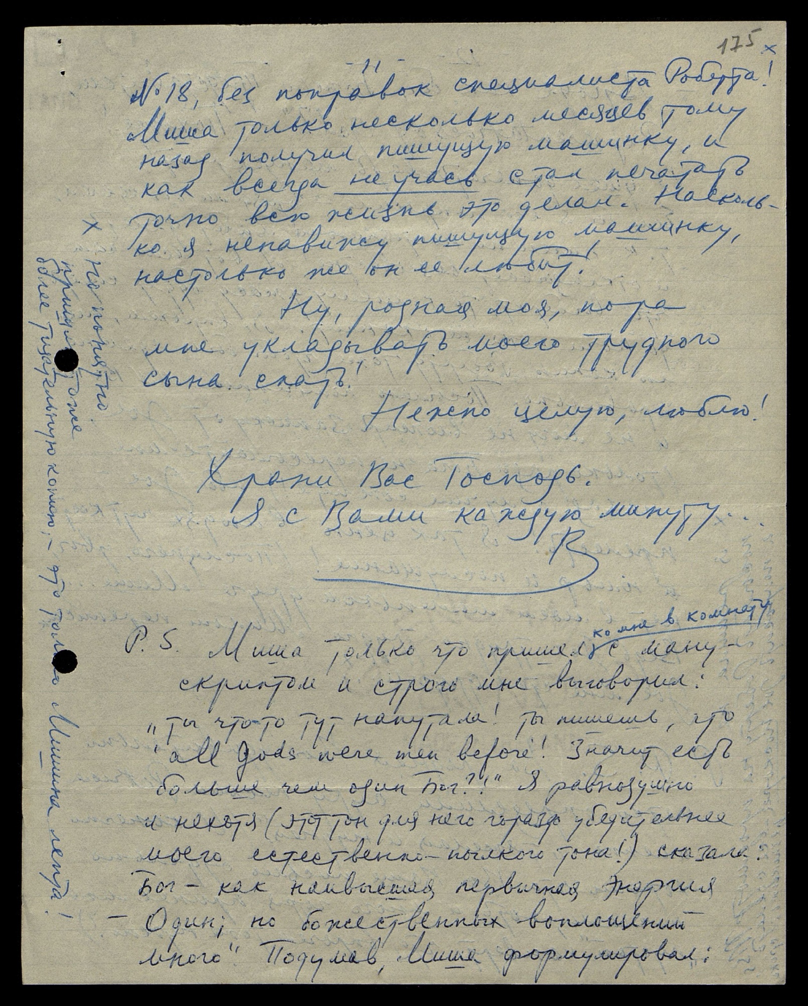 P.P.S. Да, родная Вы удивительно метко определили ауру письма Patricia — именно «тяжёлая и нудная». (И, конечно, хорошо, что Вы Ваше письмо отдельно послали, хоть и много горя принёс мне «пустой» конверт, что, впрочем, тоже нужно!)