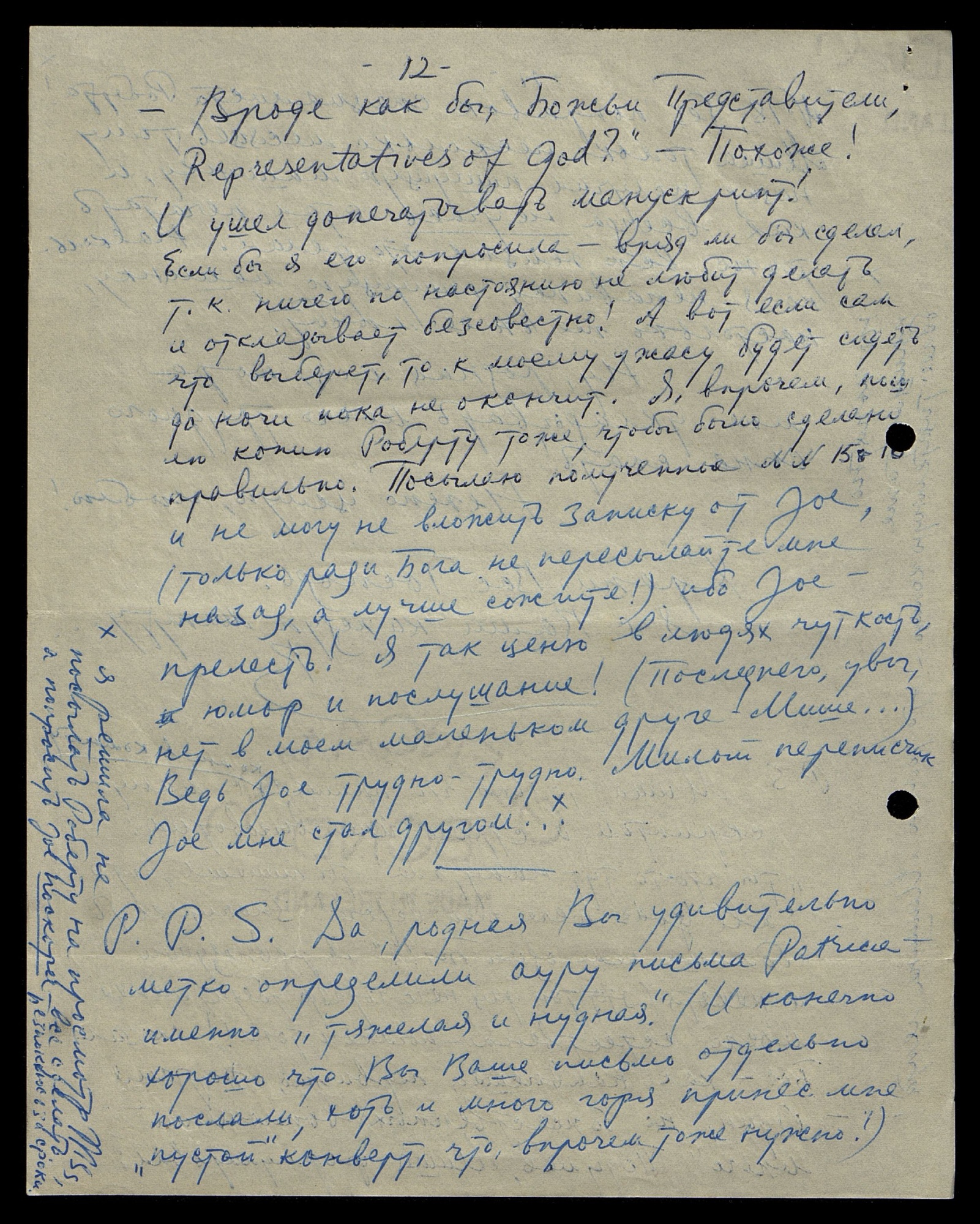 "Вроде как бы Божьи Представители, Representatives of god? [англ.: Представители бога?]" — "Похоже!" И ушёл допечатывать манускрипт! Если бы я его попросила — вряд ли бы сделал, так как ничего по настоянию не любит делать и откладывает бессовестно! А вот если сам что выберет, то к моему ужасу будет сидеть до ночи, пока не окончит. Я, впрочем, пошлю копию Роберту тоже, чтобы было сделано правильно. Посылаю полученное №№ 15-[номер отсутствует] и не могу не вложить записку от Joe, (только ради Бога, не пересылайте мне назад, а лучше сожгите!), ибо Joe — прелесть! Я так ценю в людях чуткость, юмор и послушание! (Последнего, увы, нет в моём маленьком друге — Мише…) Ведь Joe трудно-трудно. Милый переписчик Joe мне стал другом…*