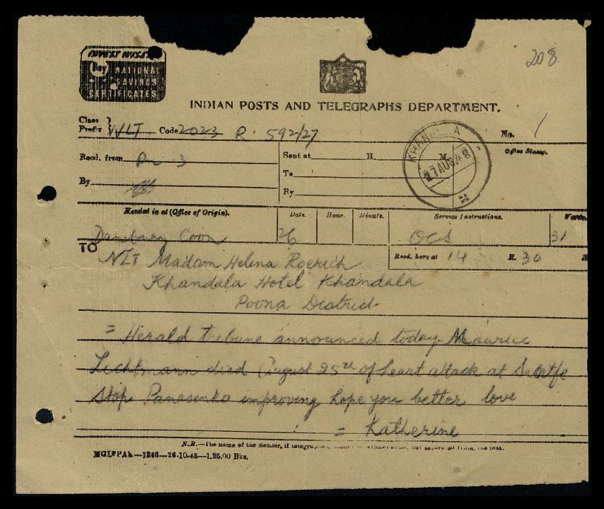 Кому: Елене Рерих, отель "Кхандала", Кхандала, [Индия]