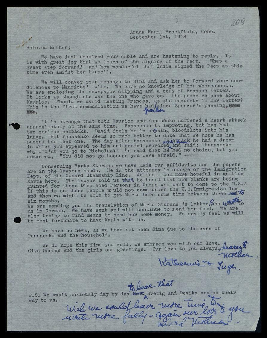 P.S. We await anxiously day by day to hear that Svetic and Devika are on their way to us. Wish we could have more time to write more fully—again our love to you Beloved Mother.
