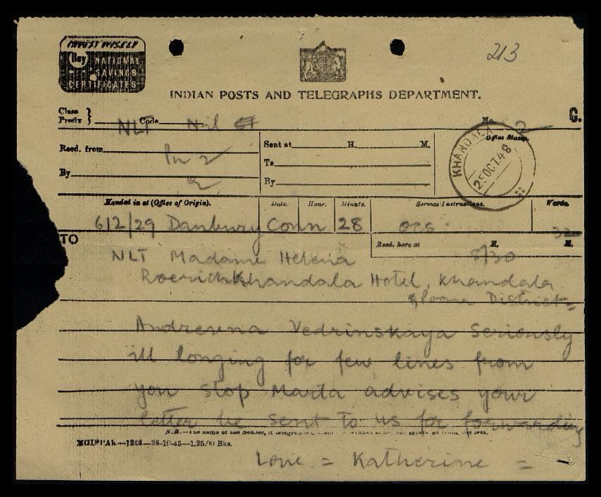 Сегодня мы отправили Вам следующую телеграмму: “Андревна Ведринская серьёзно больна, жду от Вас нескольких строк, Марта [Стуранс] советует отправить Ваше письмо нам для пересылки. С любовью, Кэтрин”.