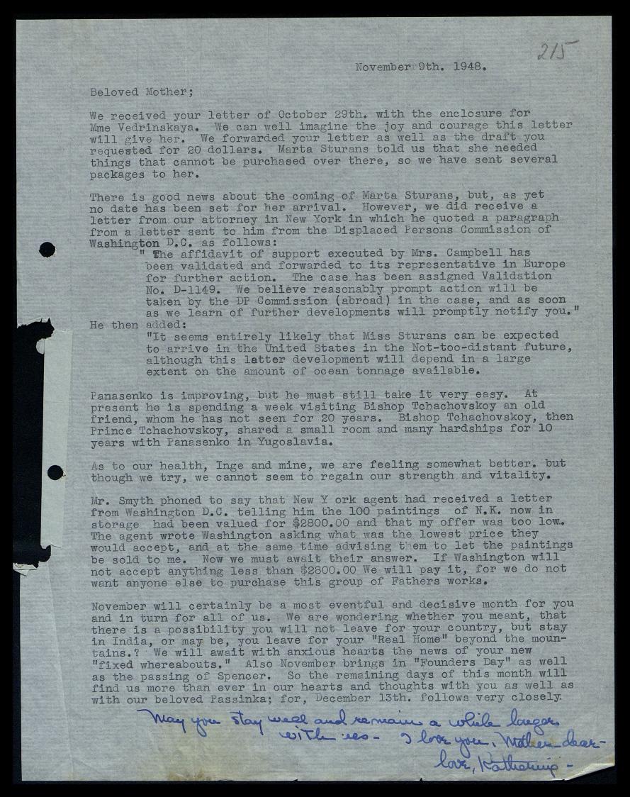 Please, please when you write to E. I. Roerich, please ask her to write a few words to Vedrinskaya. That would be the best medicine. She waits with longing for a sign of life from E.I. That would give her the courage to live. E.I. could send her note to you and you could send it to Wuerzburg, Central D. P. Camp, Block 7, or to D. P. Hospital, Wuerzburg, Northern Camp. Today, I received your twenty dollars. I bought a syringe and ampoules and will bring it to the sick. Many thanks. Yours Marta”.