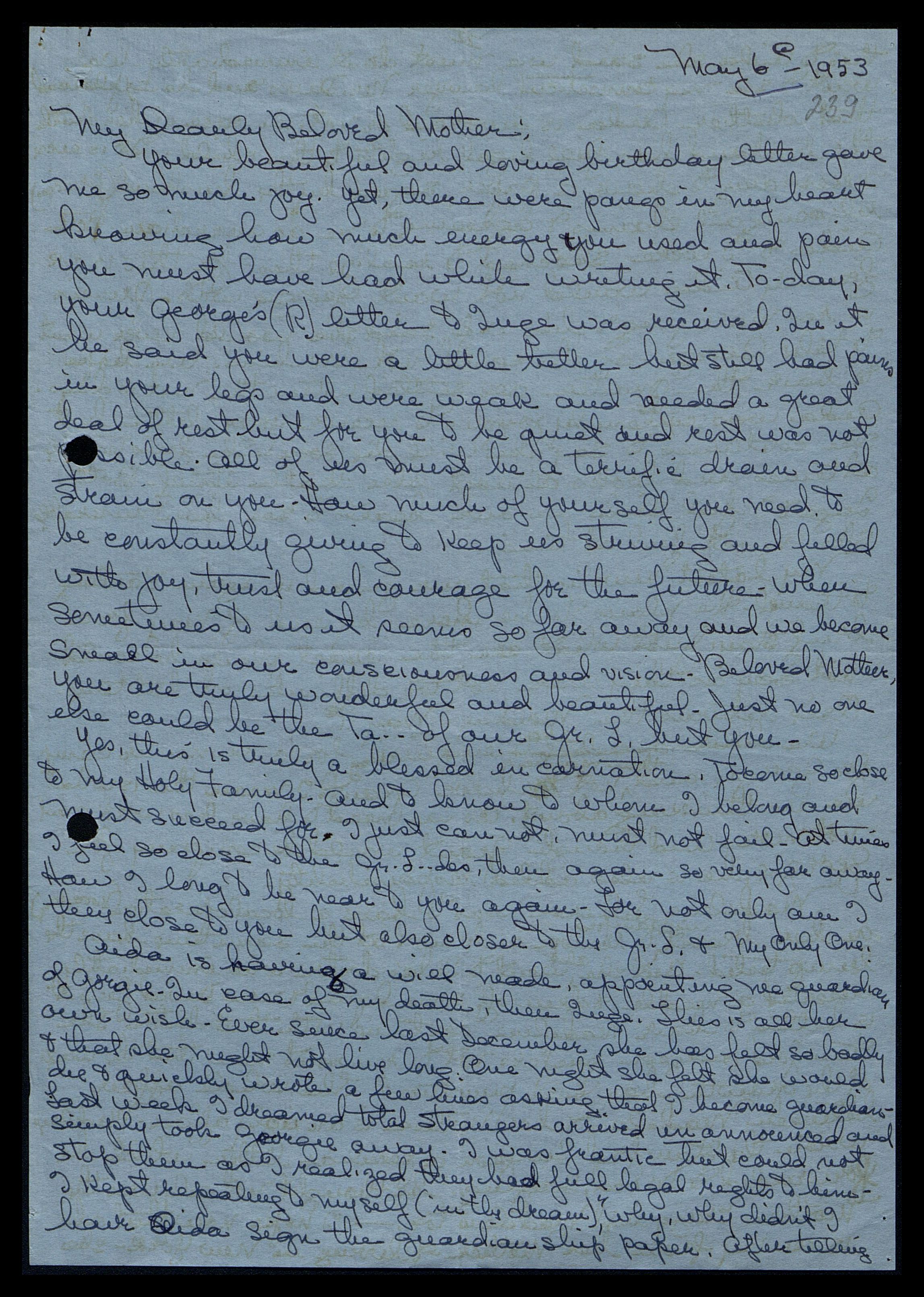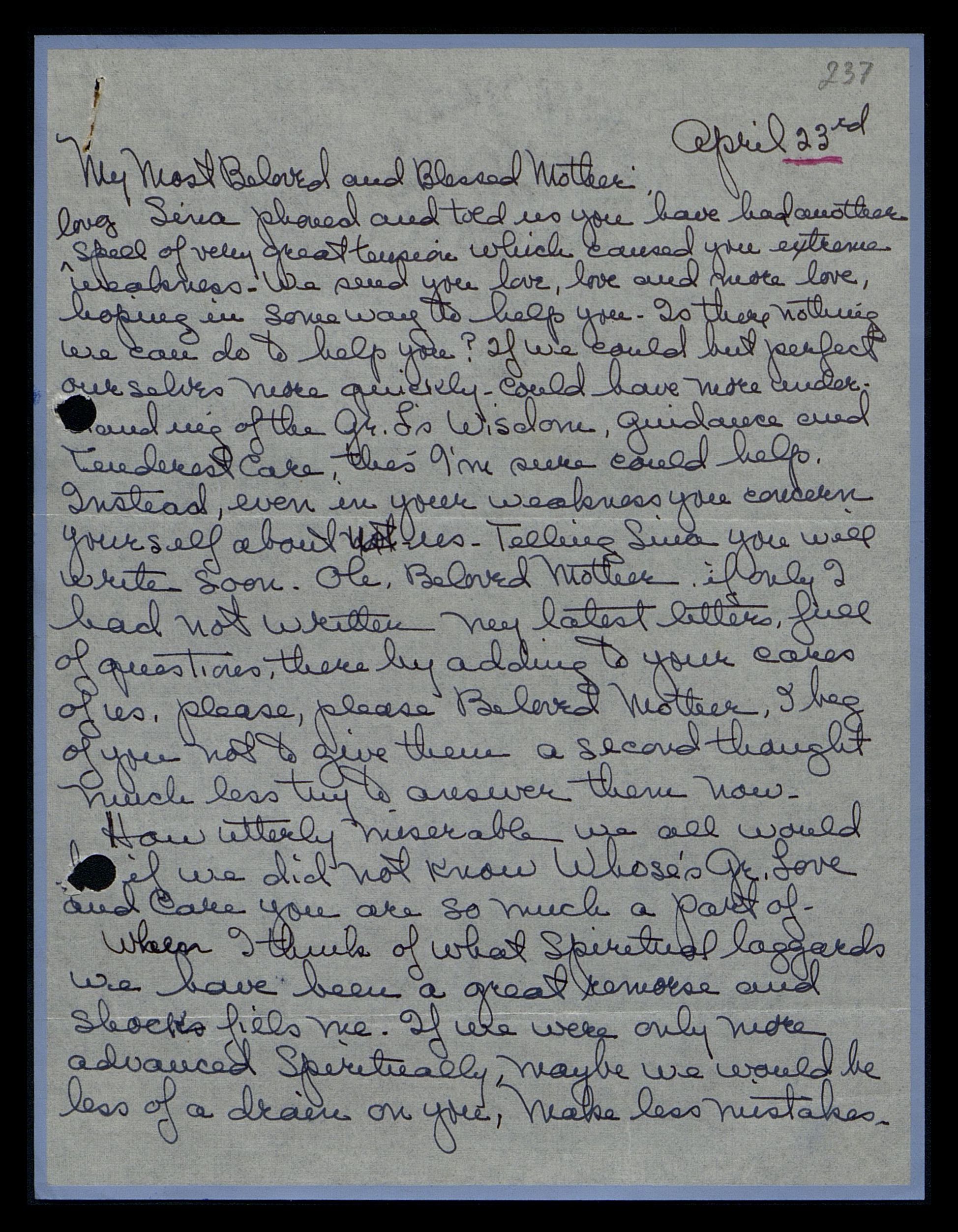 Sina [Fosdick] phoned and told us you have had another long spell of very great tension, which caused you extreme weakness. We send you love, love, and more love, hoping in some way to help you. Is there nothing we can do to help you? If we could but perfect ourselves more quickly and have more understanding of the Gr[eat] L[ord]’s Wisdom, Guidance, and Tenderest Care, this, I’m sure, could help. Instead, even in your weakness, you concern yourself about us telling Sina you will write soon. Oh, Beloved Mother, if only I had not written my latest letters full of questions, thereby adding to your cares of us. Please, please, Beloved Mother, I beg of you not to give them a second thought, much less try to answer them now.