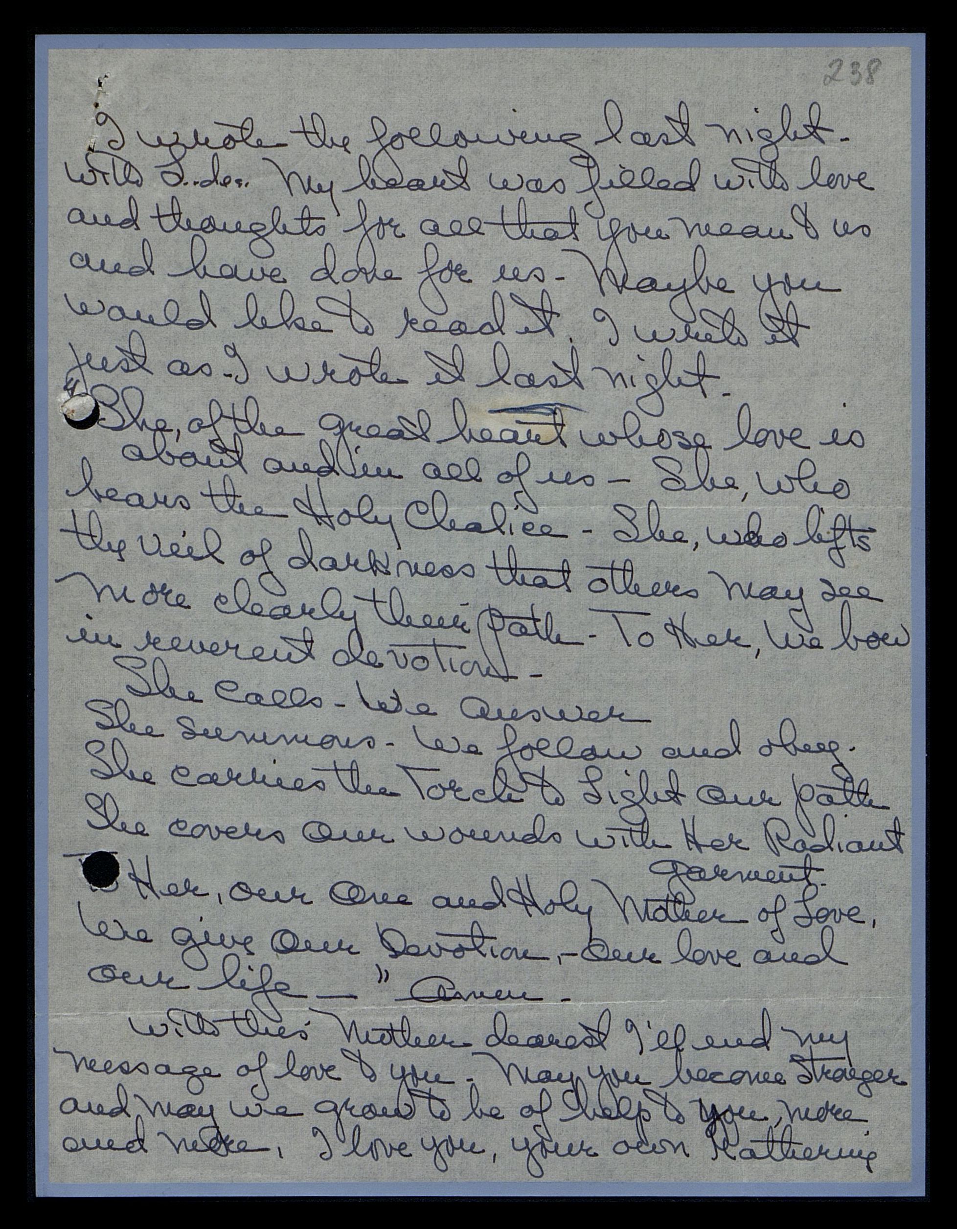 I wrote the following last night with L[eoni]das. My heart was filled with love and thoughts for all that you mean to us and have done for us. Maybe you would like to read it. I write it just as I wrote it last night: She of the great heart whose love is about and in all of us; She who hears the Holy Chalice; She who lifts the veil of darkness that others may see more clearly their path. To her, we bow in reverent devotion.