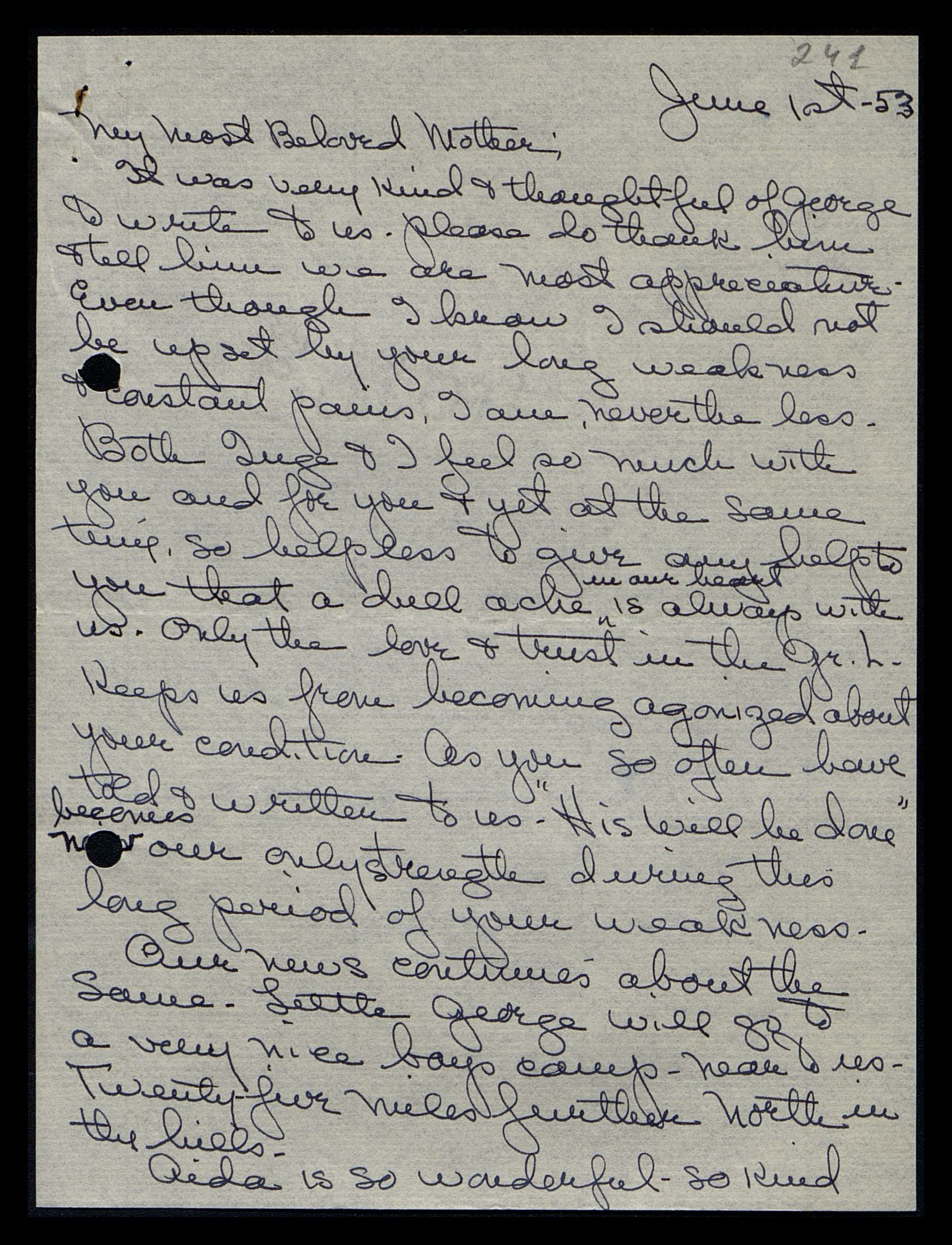 Thank you, Beloved Mother, for thinking to send through George your love and news about your health. We were beginning to really get over anxious. But by repeating to ourselves, “Thy will, oh Lord, be done,” our fears became less, and we became more calm.