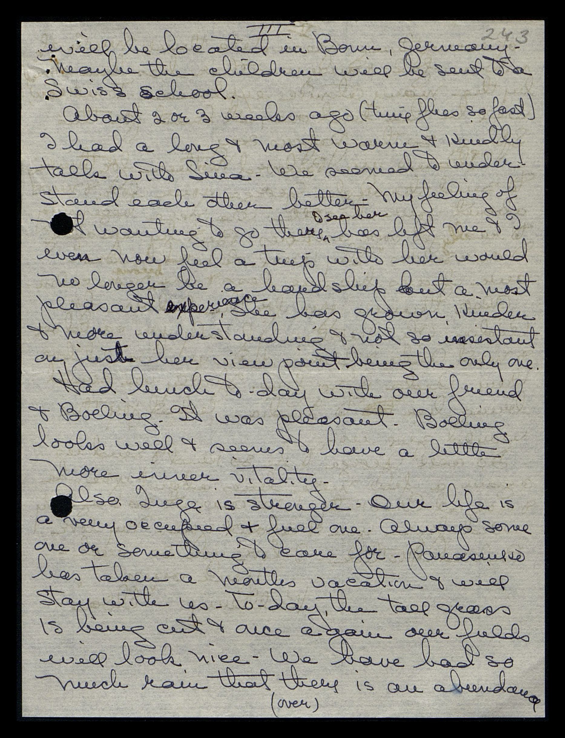 About two or three weeks ago (time flies so fast), I had a long, most warm, and kind talk with Sina [Fosdick]. We seemed to understand each other better. My feeling of not wanting to go there to see her has left me, and I even now feel a trip with her would no longer be a hardship but a most pleasant experience. She has grown kinder and more understanding, and [she is] not so insistent on just her viewpoint being the only one.
