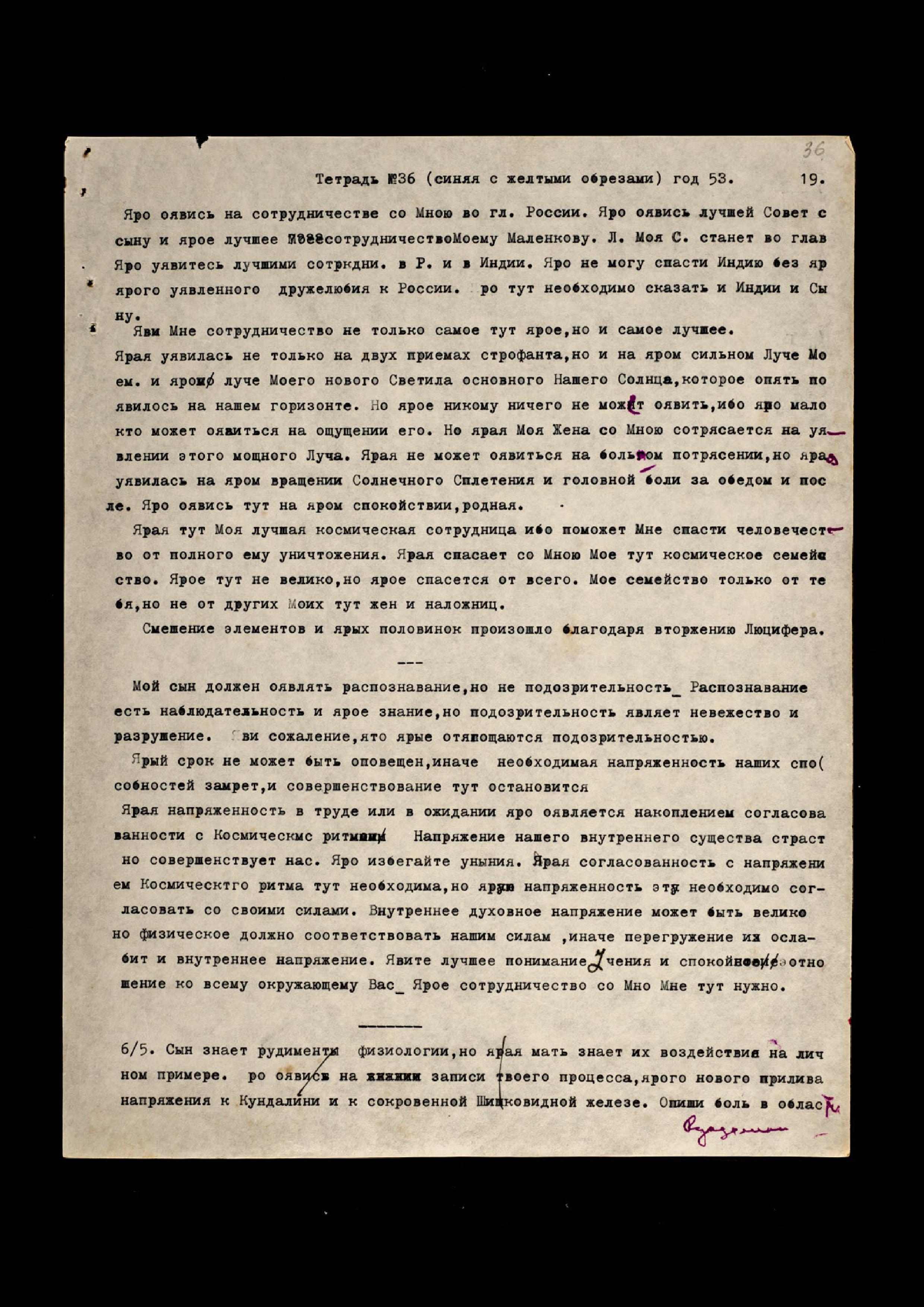 Яро оявись на сотрудничестве со Мною во гл[аве] России. Яро ояви лучший Совет сыну и ярое лучшее сотрудничество Моему Маленкову. Л[юбимая] Моя С[трана] станет во глав[е]. Яро уявитесь лучшими сотрудниками в Р[оссии] и в Индии. Яро не могу спасти Индию без ярого уявленного дружелюбия к России. Яро тут необходимо сказать и Индии, и Сыну.