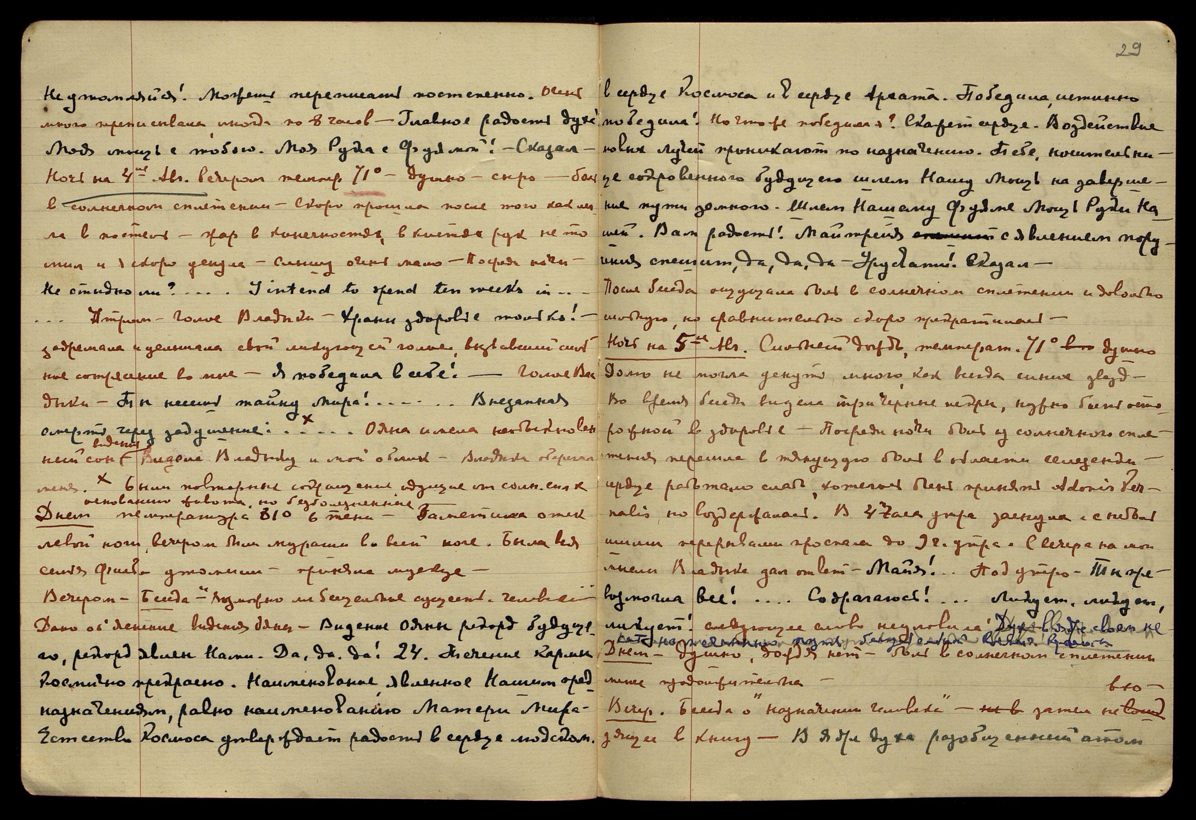 Ночь на 4-е августа. Вечером темпер[атура] 71°, душно, сыро, боль в солнечном сплетении. Скоро прошла после того, как легла в постель. Жар в конечностях, в кистях рук не томил и скоро уснула. Слышу очень мало. Посреди ночи: "Не стыдно ли?.. I intend to spend ten weeks in [англ.: Я намерен провести десять недель в]..."