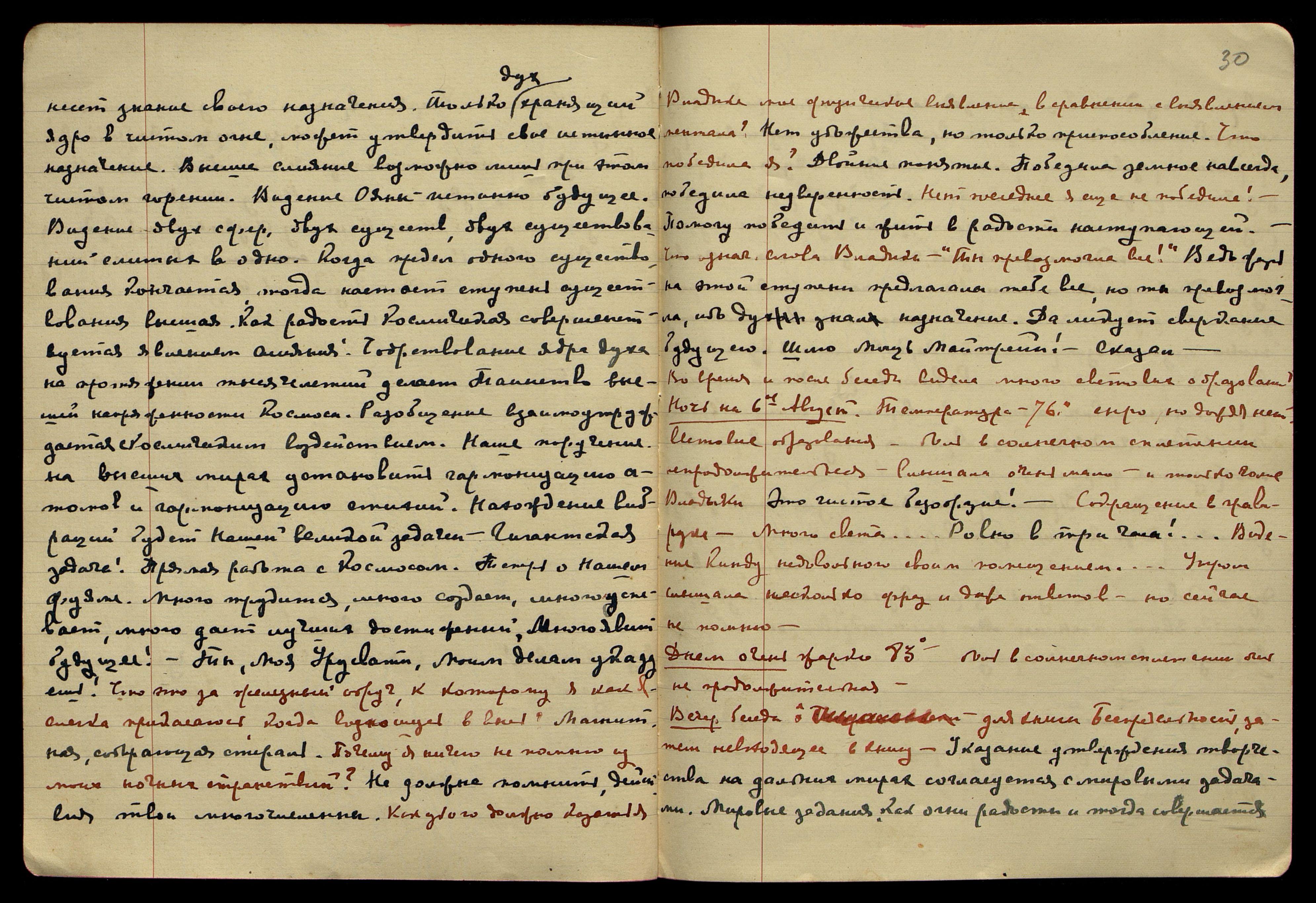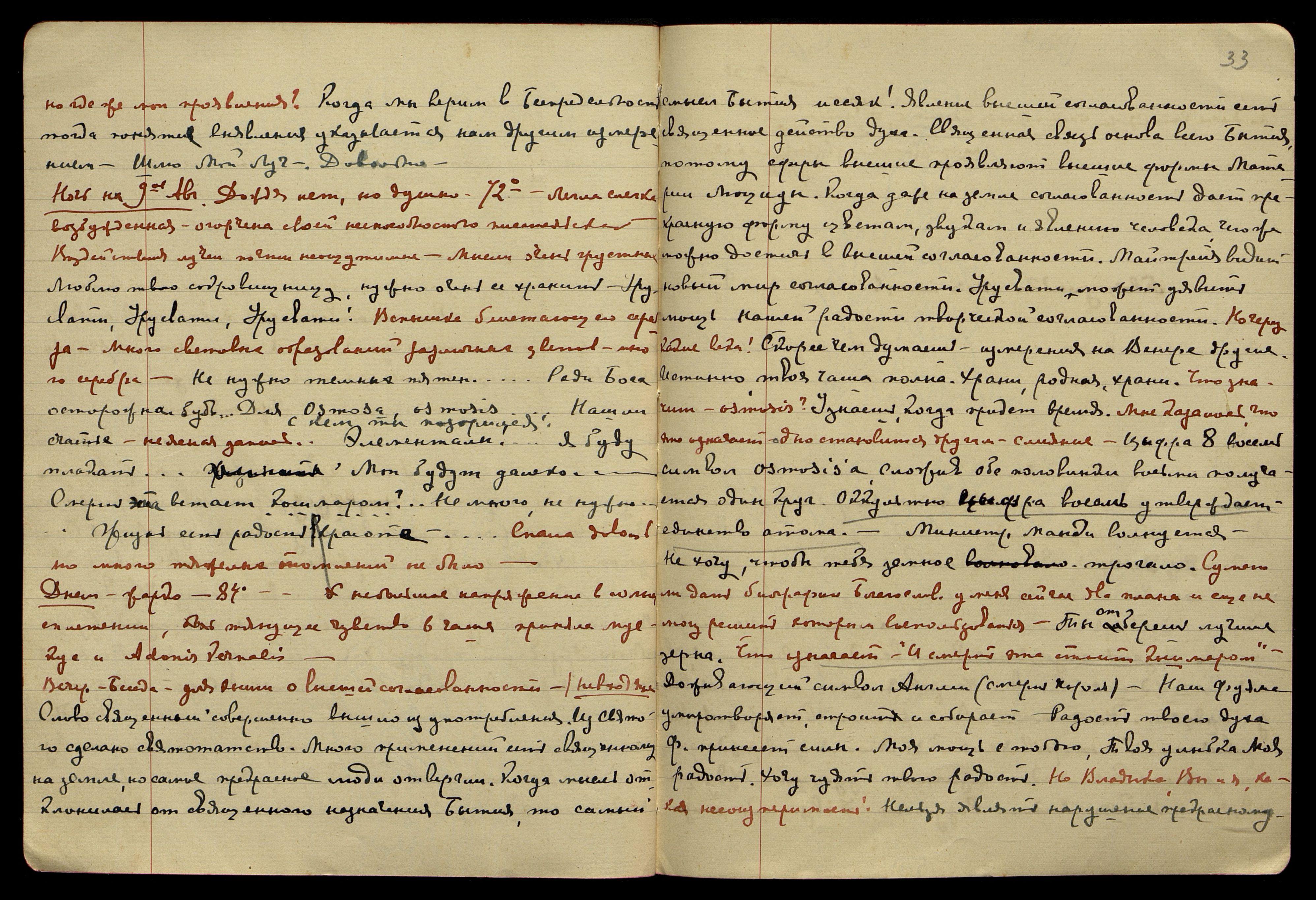 Ночь на 9-ое августа. Дождя нет, но душно − 72°. Легла слегка возбуждённая − огорчена своей неспособностью писательской. Воздействия лучей почти неощутимые. Мысли очень грустные.[/color] "Люблю твою сокровищницу, нужно очень её хранить. Урусвати, Урусвати, Урусвати!" Вспышка блистающего серебра. Много световых образований различных цветов, много серебра. "Не нужно тёмных пятен... Ради Бога, осторожна будь... Для Osmosa, osmosis... Нашли счастье, − неясная запись, − ...С кем ты позорился! Элементалы!.. Я буду плакать... [слово зачёркнуто], Мои будут далеко... Смерть встаёт кошмаром?.. Немного, не нужно... Жизнь есть радость, красота..." Спала довольно много, тяжёлых томлений не было.