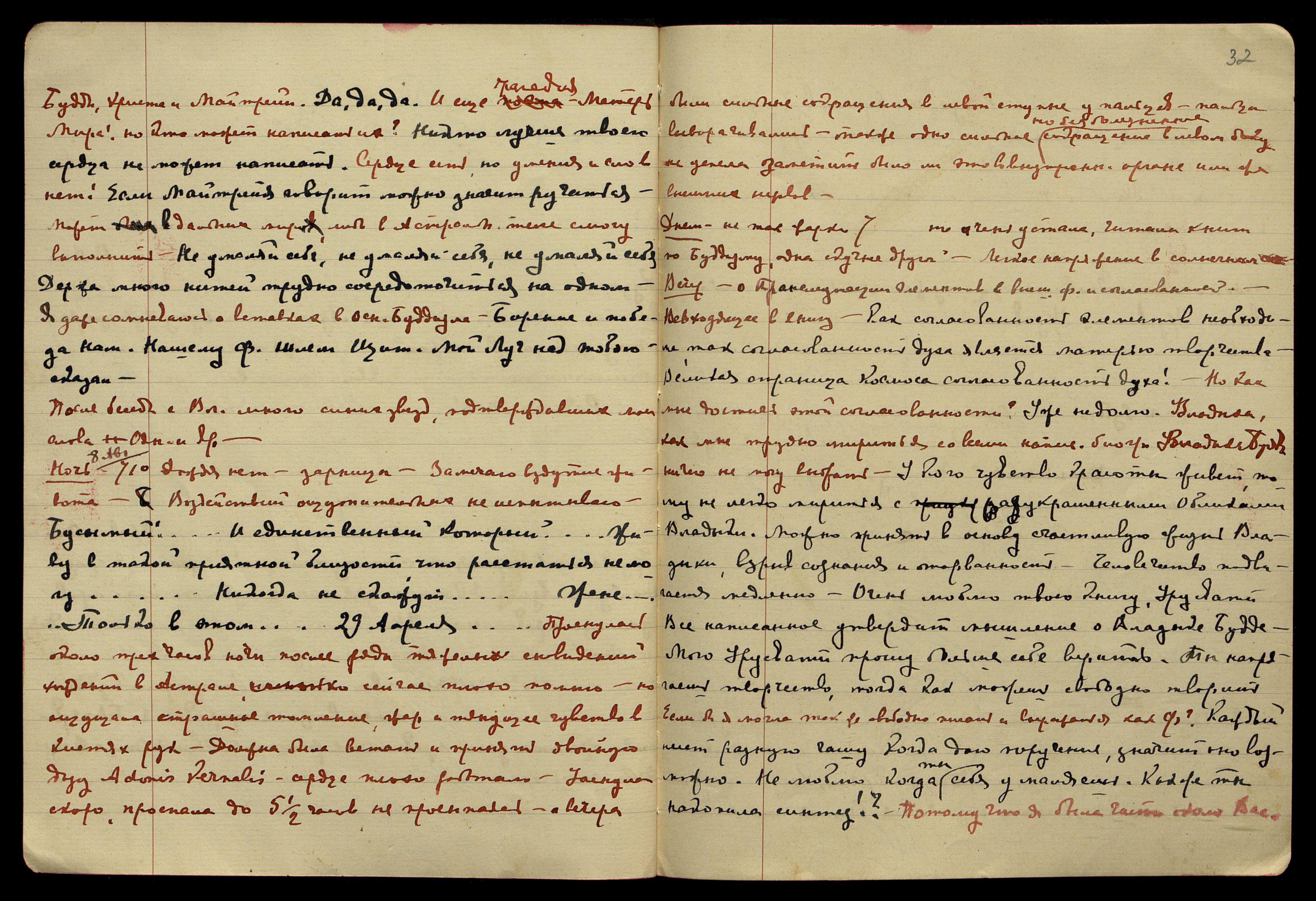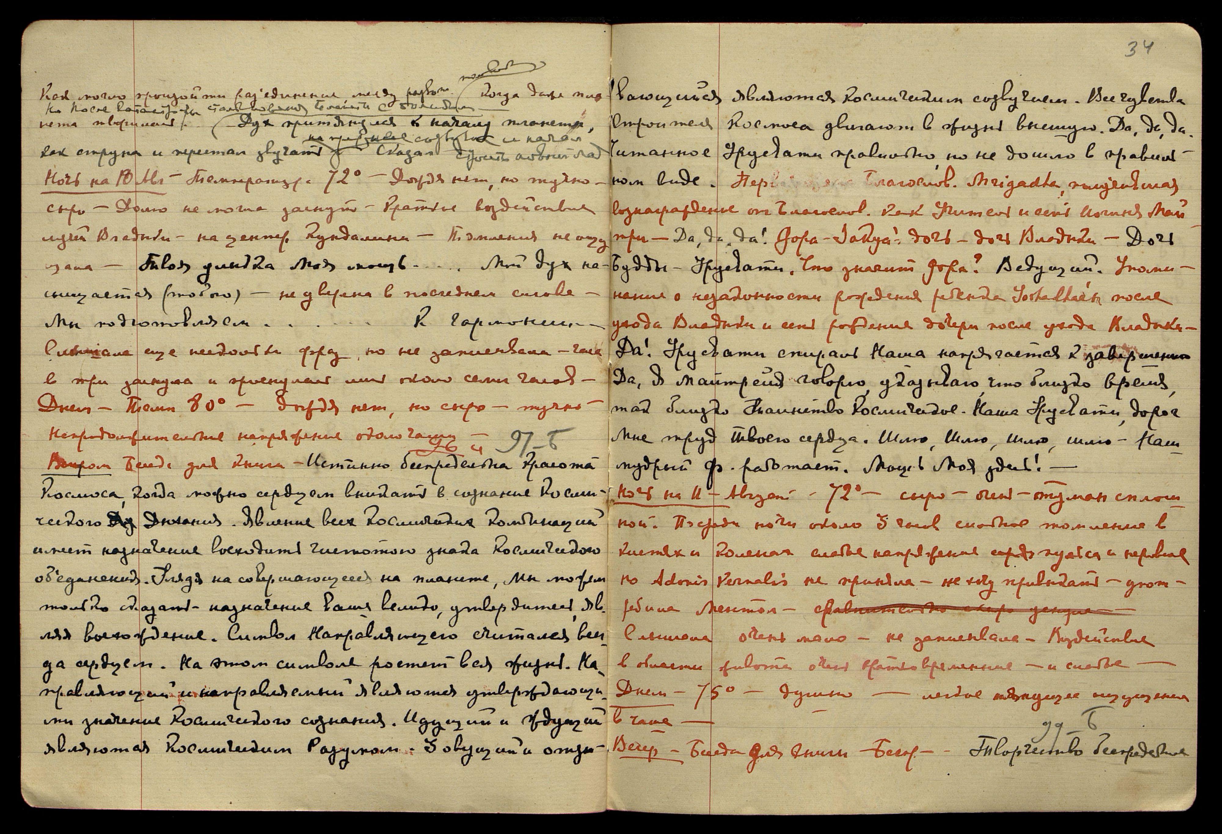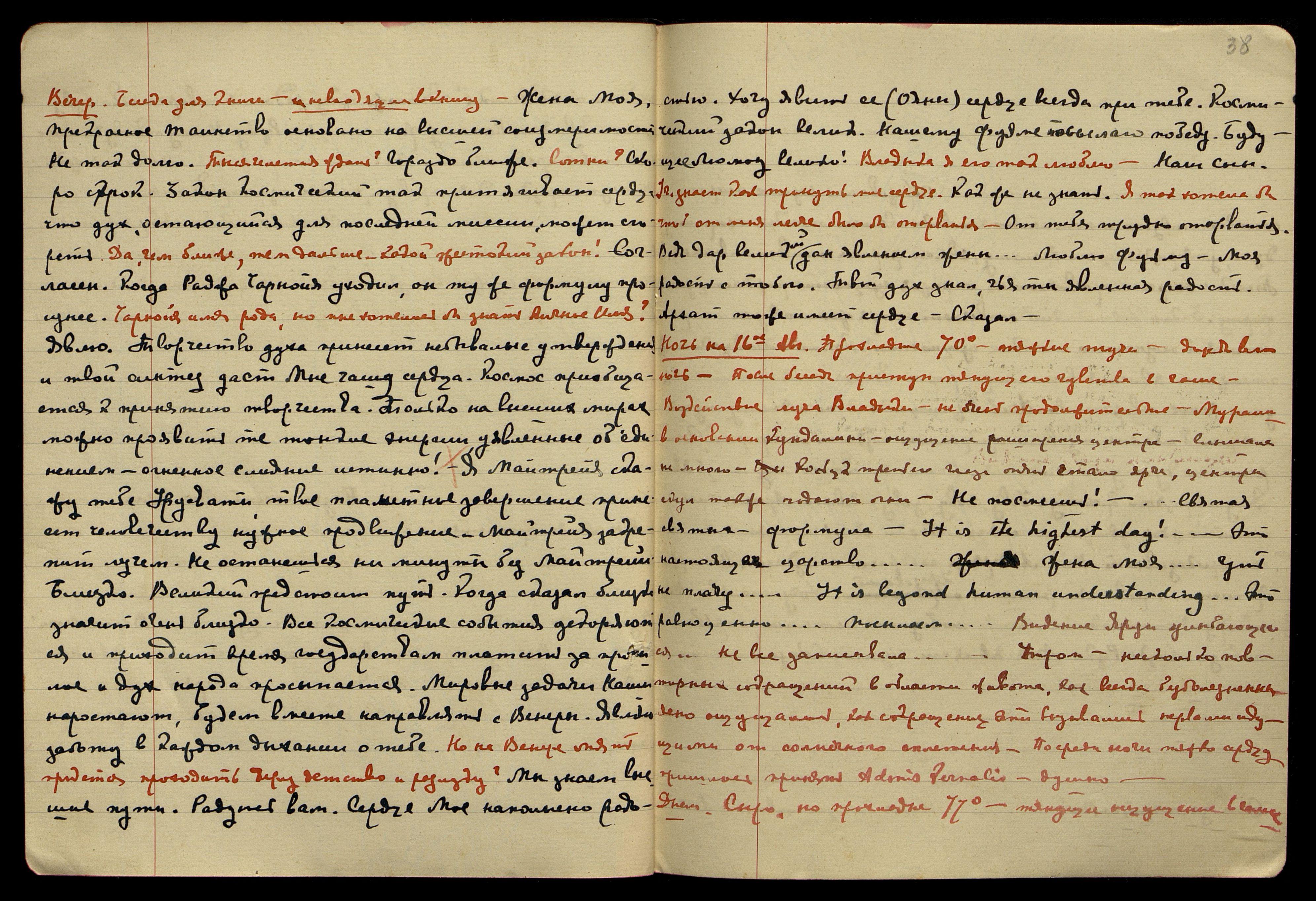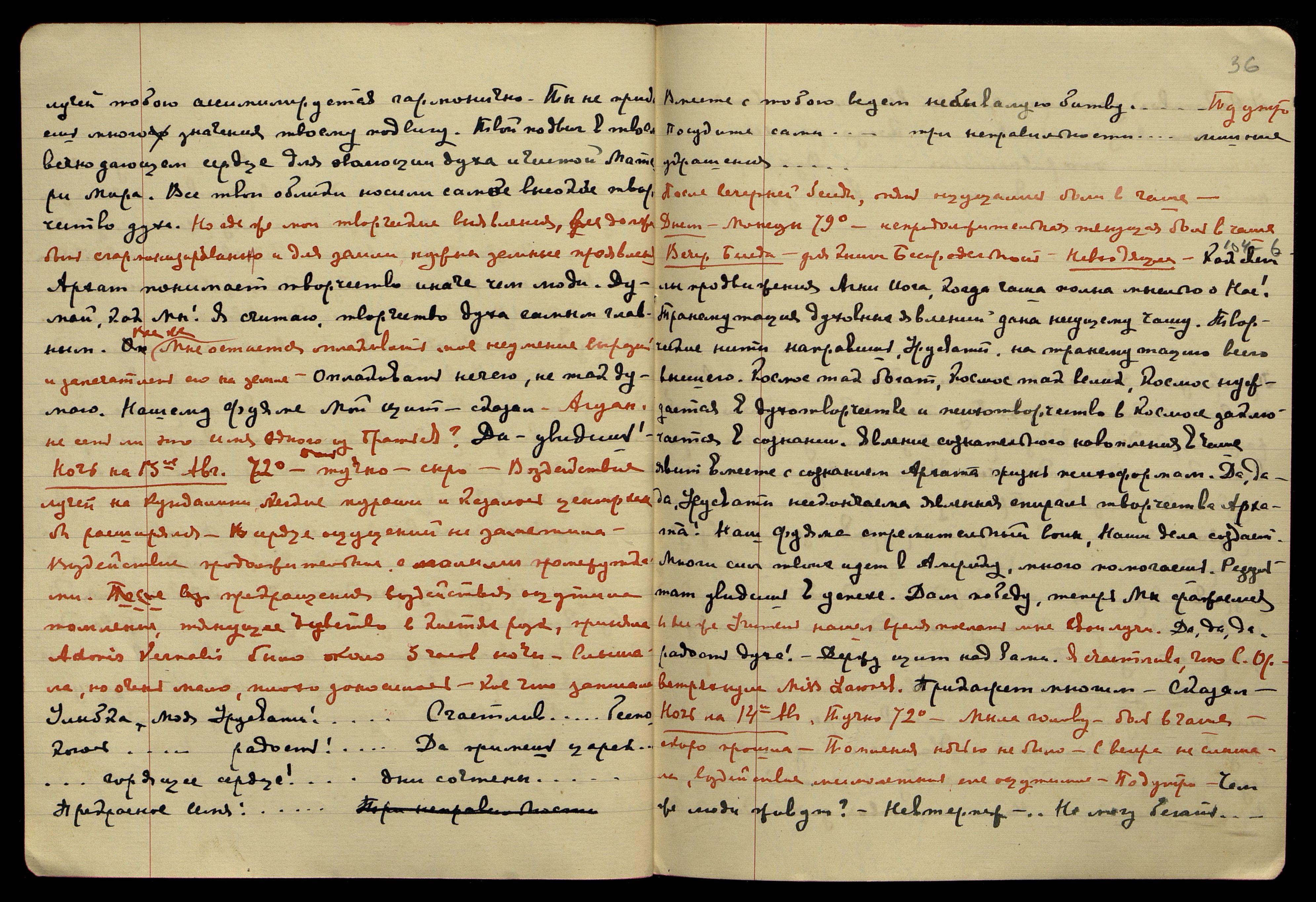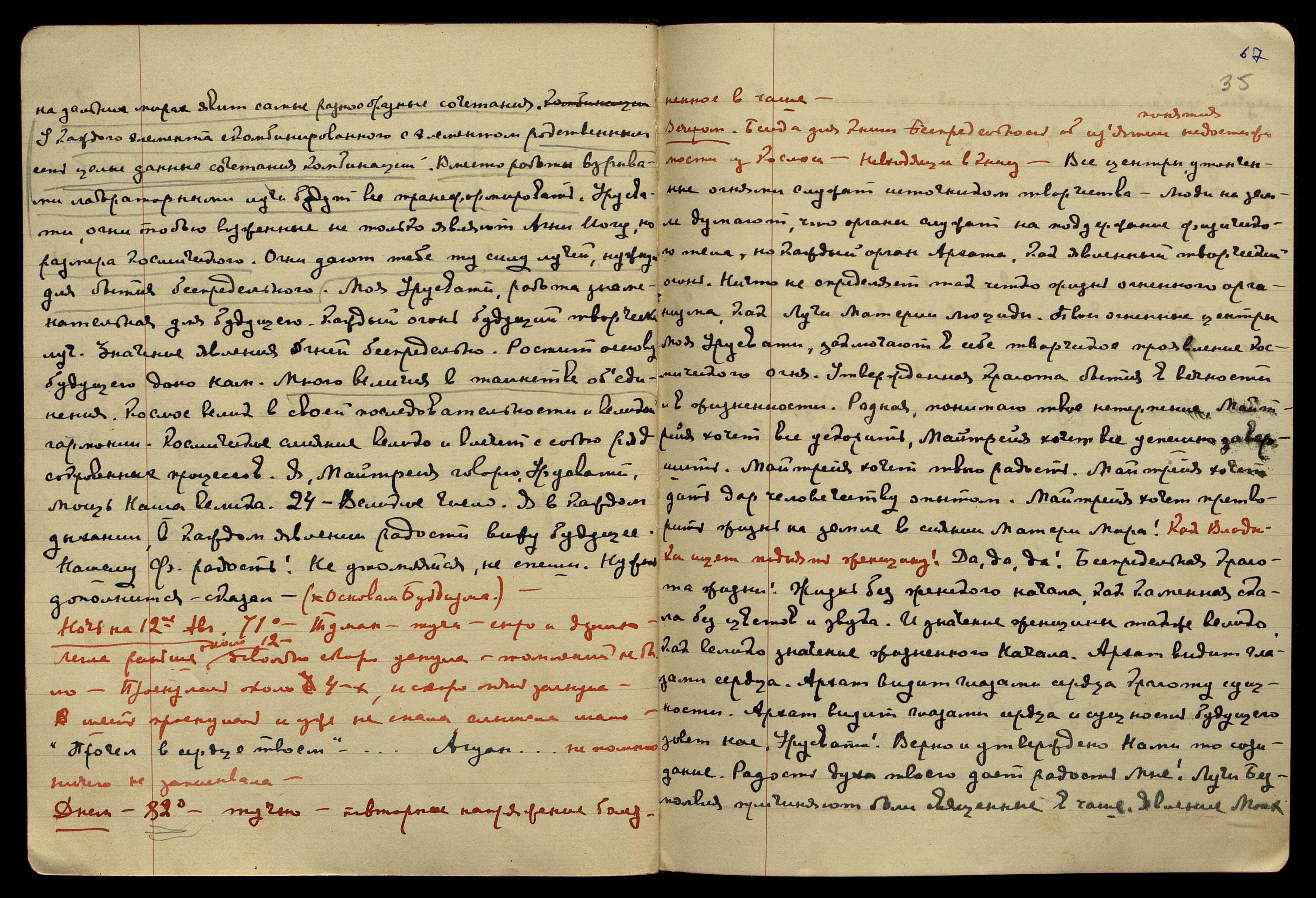 Ночь на 13-е авг[уста]. 72°, тучно, сыро. Воздействие лучей на Кундалини, лёгкие мураши и, казалось, центр как бы расширялся. На сердце ощущений не заметила. Воздействие продолжительные, с малыми промежутками. После прекращения воздействия ощутила томление, тянущее чувство в кистях рук, приняла Adonis Vernalis, было около 3 часов ночи. Слышала, но очень мало, плохо доносилось, кое-что записала. "Улыбка, Моя Урусвати!.. Счастлив... беспокоюсь... радость!.. Да примешь царск... горящее сердце!.. дни сочтены... Прекрасное имя!.. Вместе с тобою ведём небывалую битву..." Под утро: "Посудите сами... три неправильности... лишние украшения..."