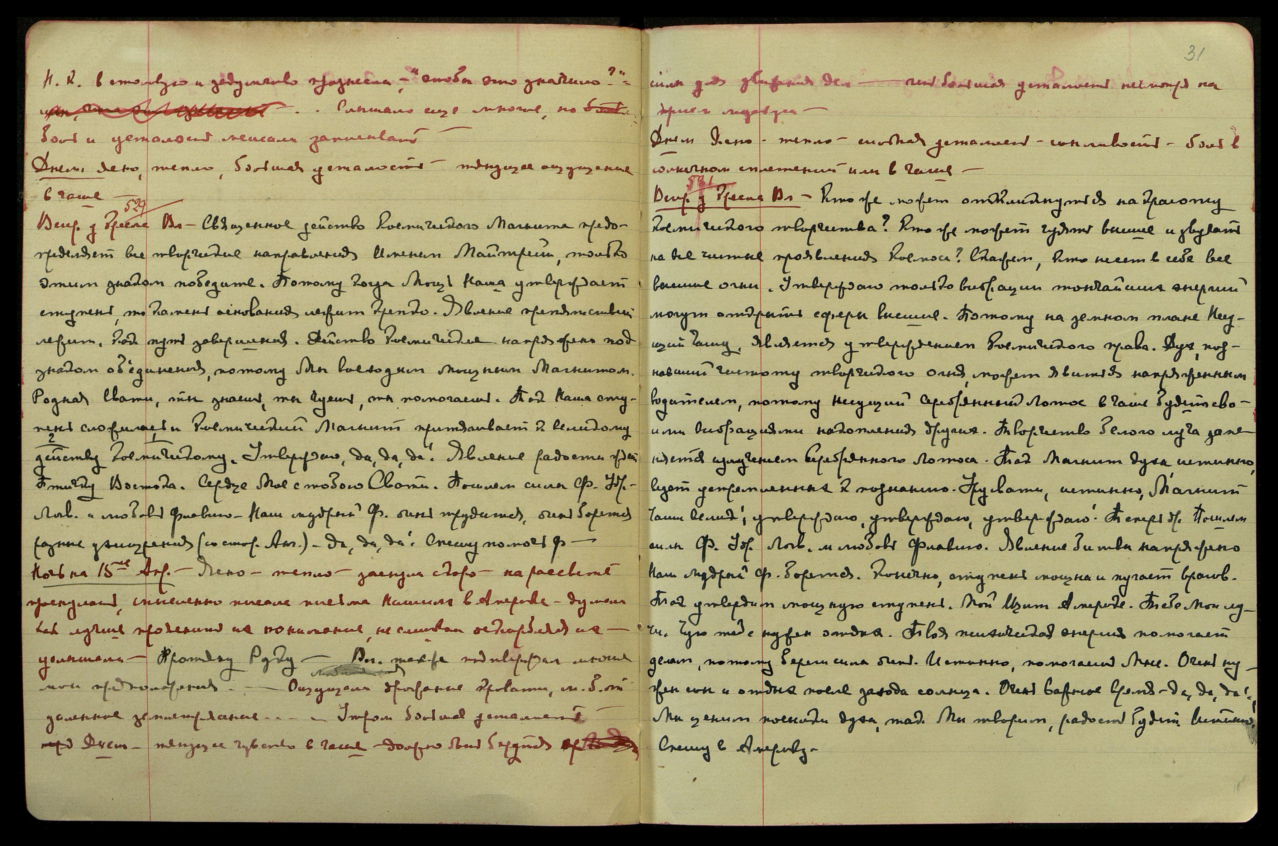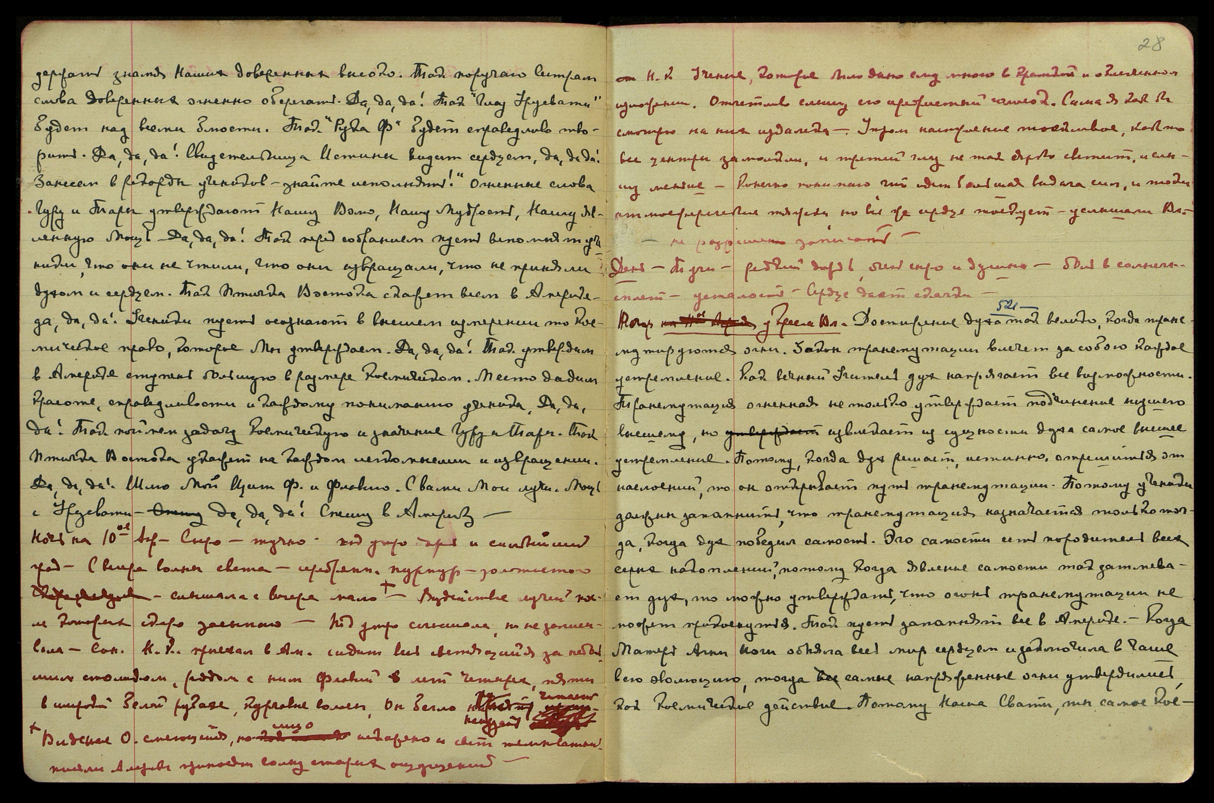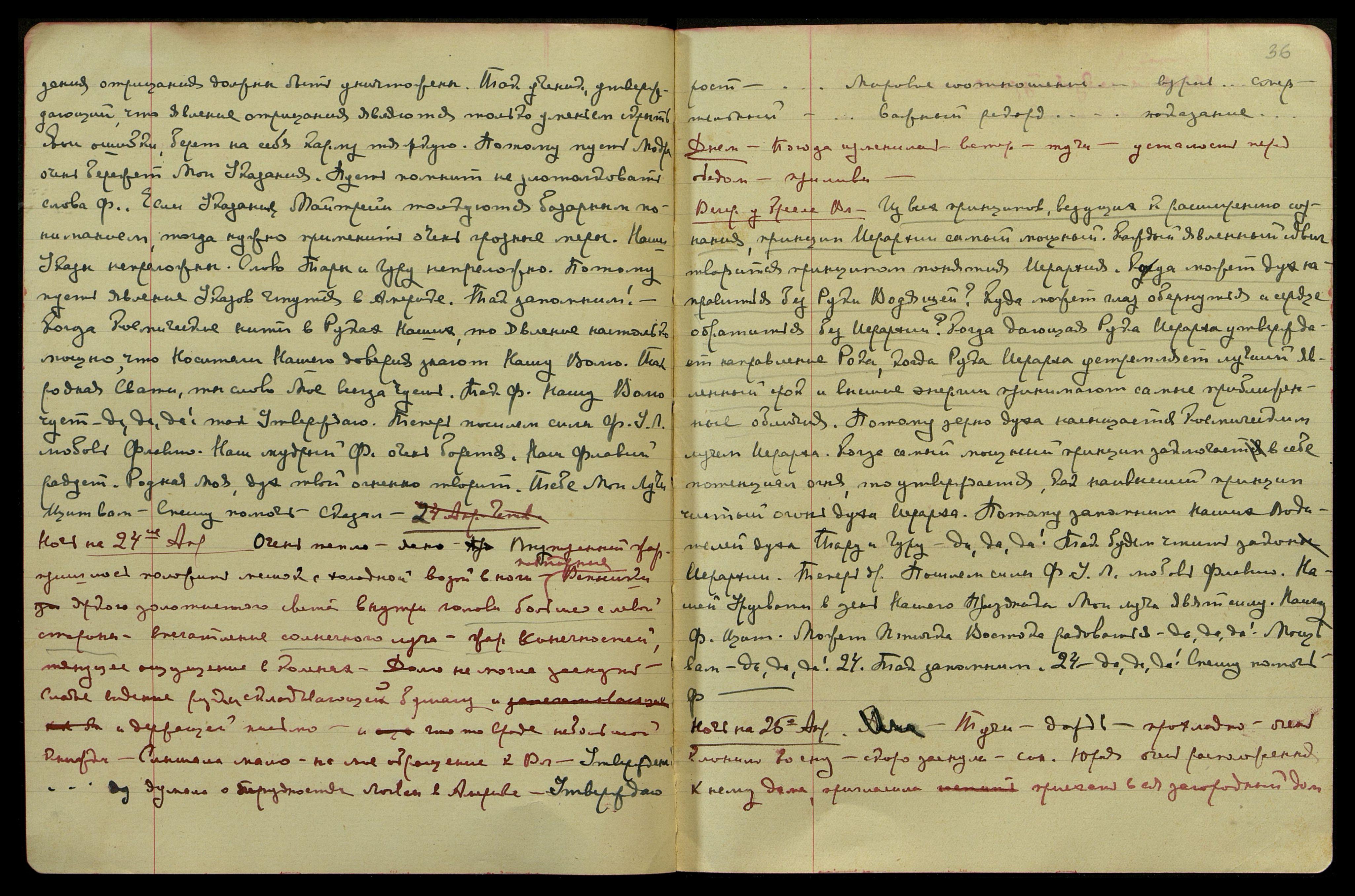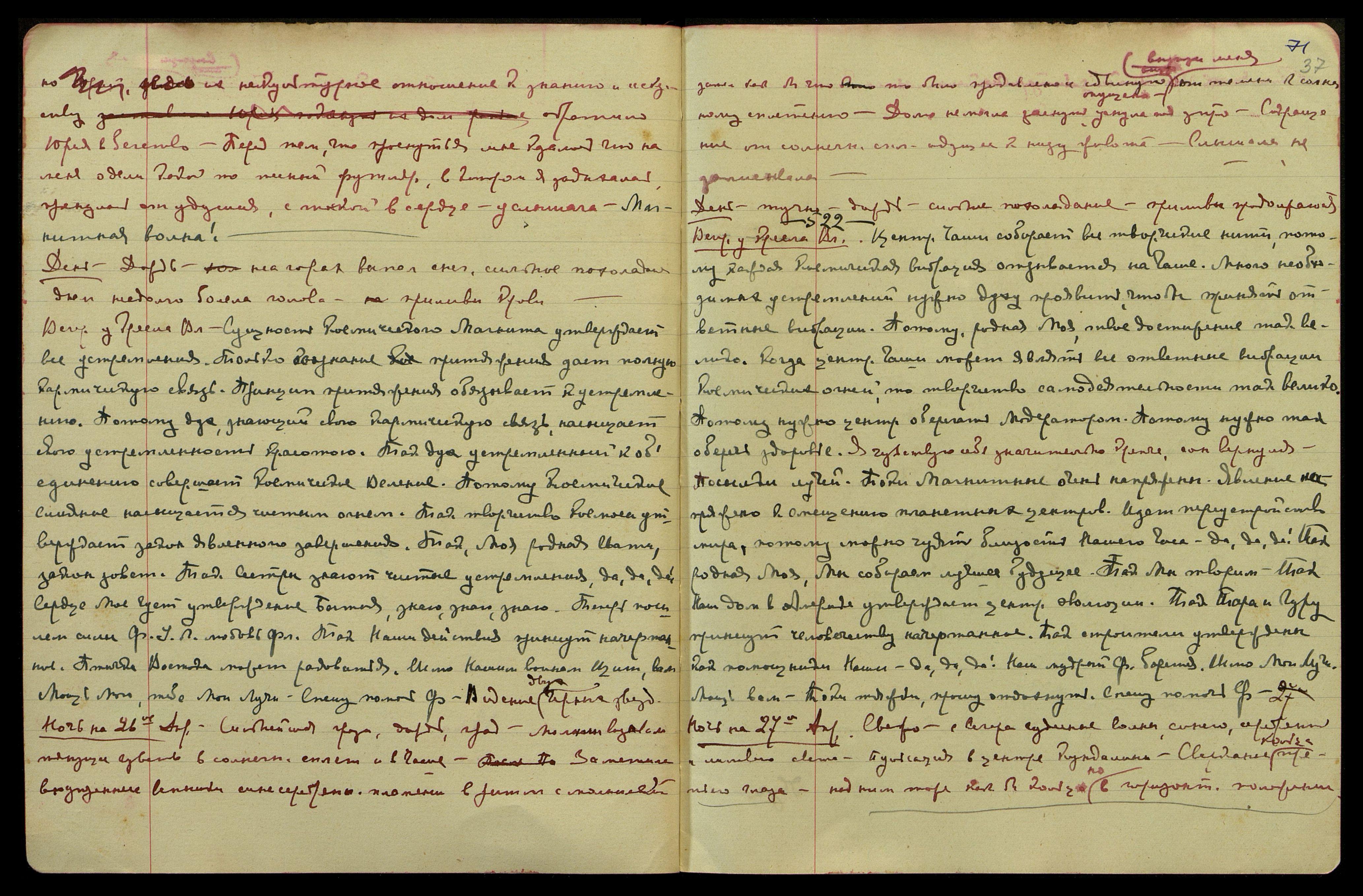 Ночь на 27-е апр[еля]. Свежо, с вечера чудесные волны, синего, серебряного и лилового света. Пульсация в центре Кундалини. Сверкание кольца третьего глаза - под ним тоже как бы кольцо, но в горизонт[альном] положении.