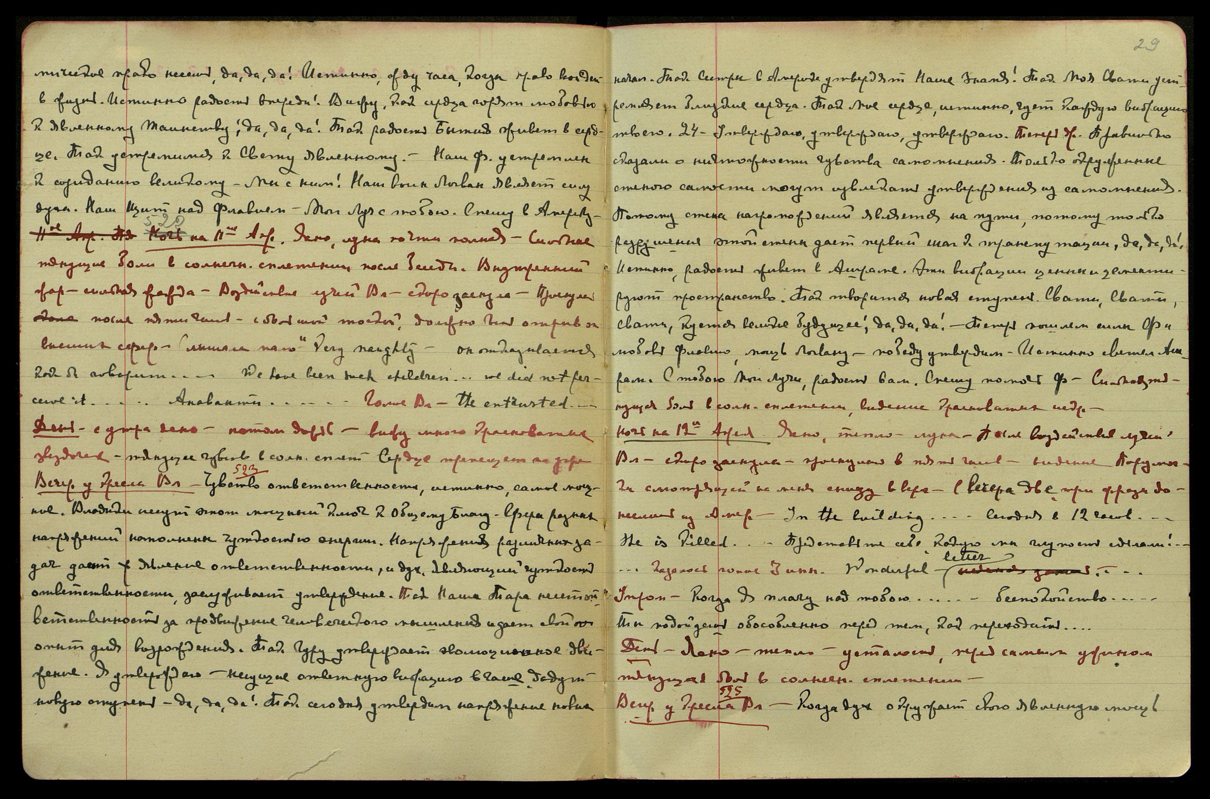 "In the building [англ.: В здании]... Сегодня в 12 часов... She is killed [англ.: Она убита]... Представьте себе, какую мы глупость сделали!..." - казалось голос Зины. "Wonderful letter [англ.: Замечательное письмо]..."