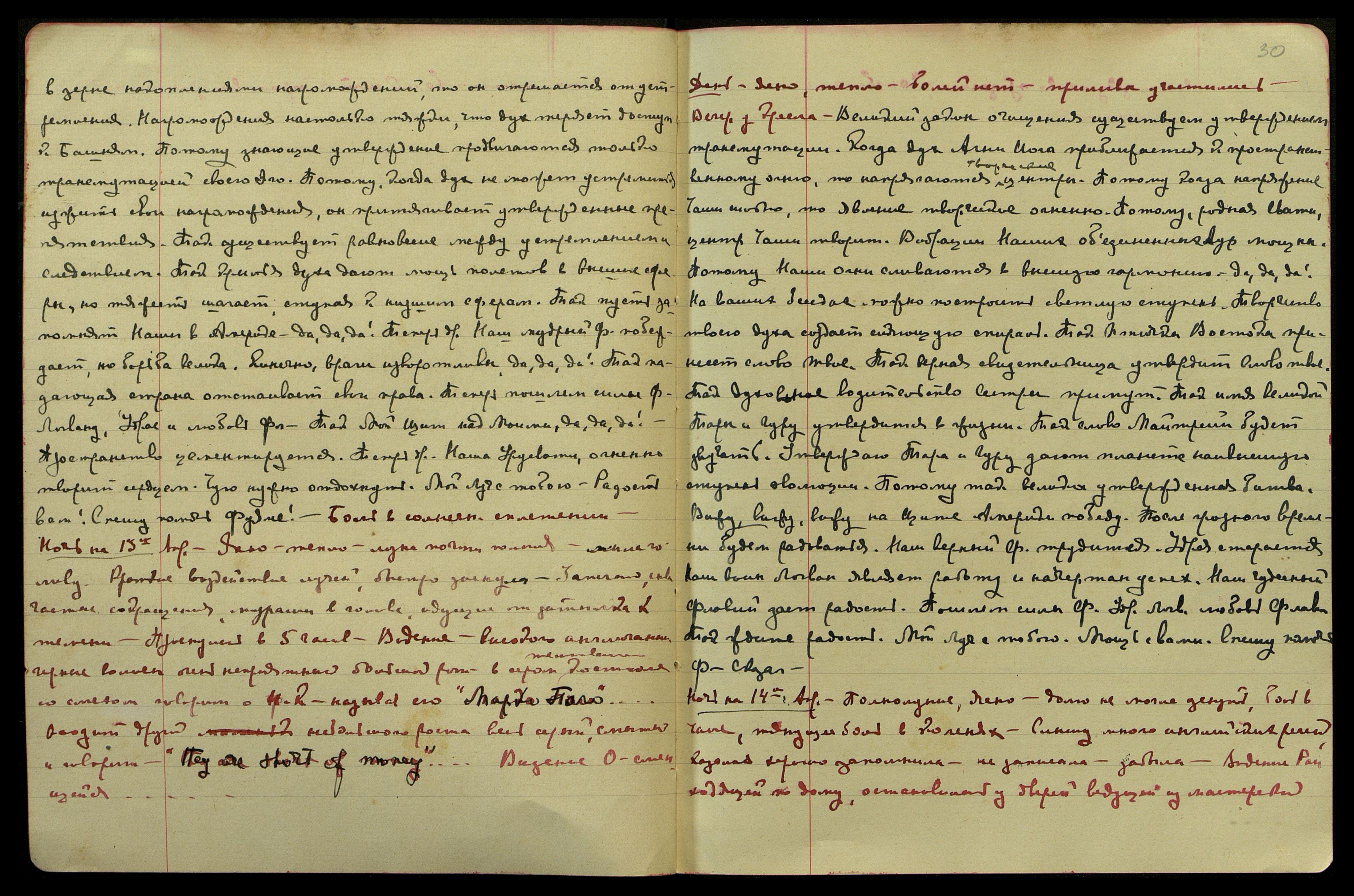 Ночь на 13-ое апр[еля]. Ясно, тепло, луна почти полная. Мыла голову. Краткое воздействие лучей, быстро заснула. Замечаю снова частые сокращения, мураши в голове, идущие от затылка к темени. Проснулась в 5 часов. Видение высокого англичанина, чёрные волосы, очень неприятного, большой рот, в сером, темноватом костюме, со смехом говорит о Н.К., называя его "Марко Поло"... Входит другой, небольшого роста, весь серый, смеётся и говорит: "They are short of money..." [англ.: Им не хватает денег...] Видение О[яны], смеющейся...