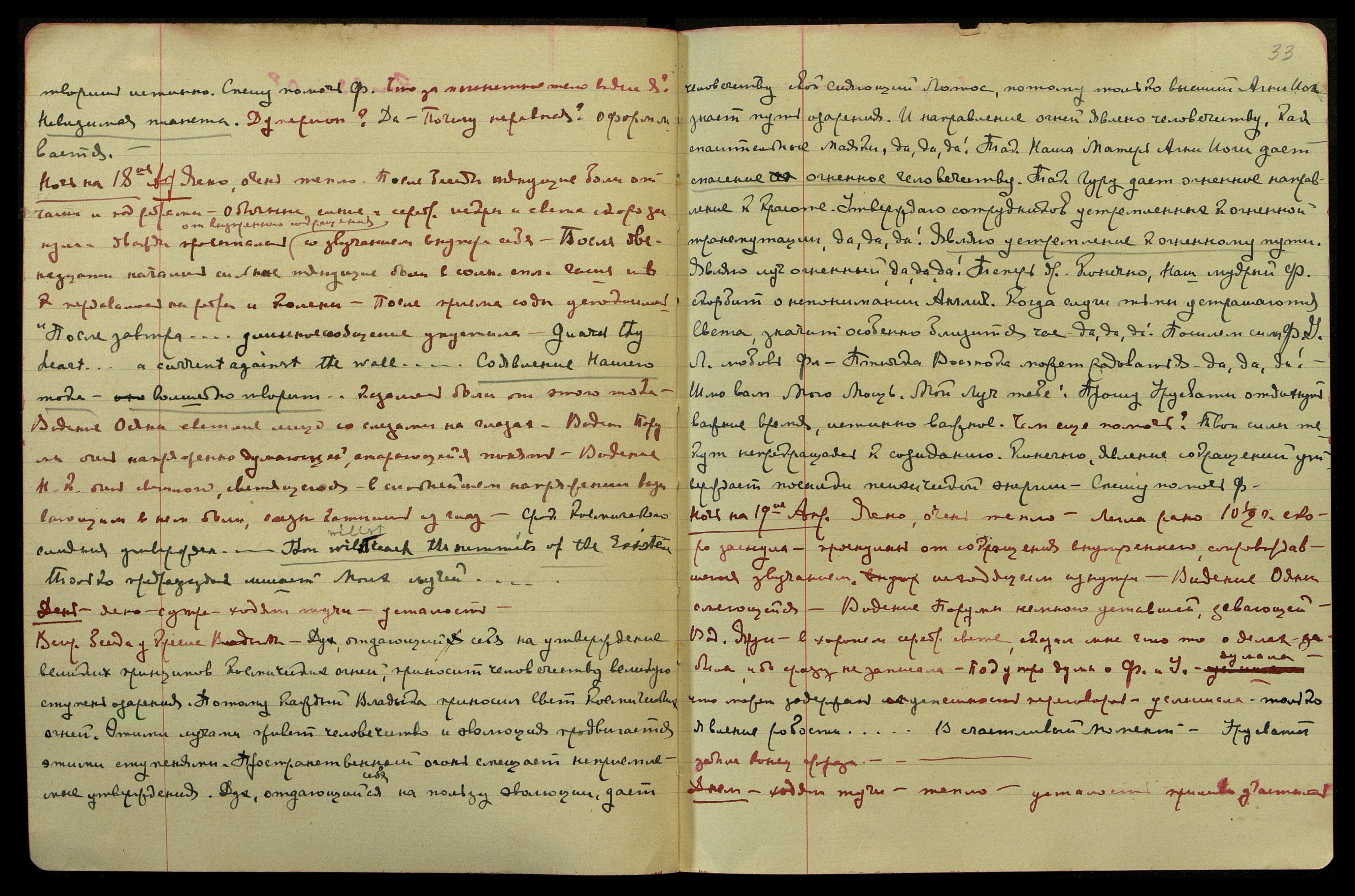 Ночь на 19-ое апр[еля]. Ясно, очень тепло. Легла рано [в] 10 1/2 ч., скоро заснула, проснулась от сокращения внутреннего, сопровождавшегося звучанием, исходящим изнутри. Видение Ояны, смеющейся. Видение Порумы, немного уставшей, зевающей. Вид[ение] Яруи в хорошем серебр[яном] свете, сказал мне что-то о делах - забыла, ибо сразу не записала. Под утро думы о Ф[уяме] и У[драе] - думала, что может задержать успешность переговоров, услышала: "Только явление робости... В счастливый момент. Урусвати..." − забыла конец фразы...