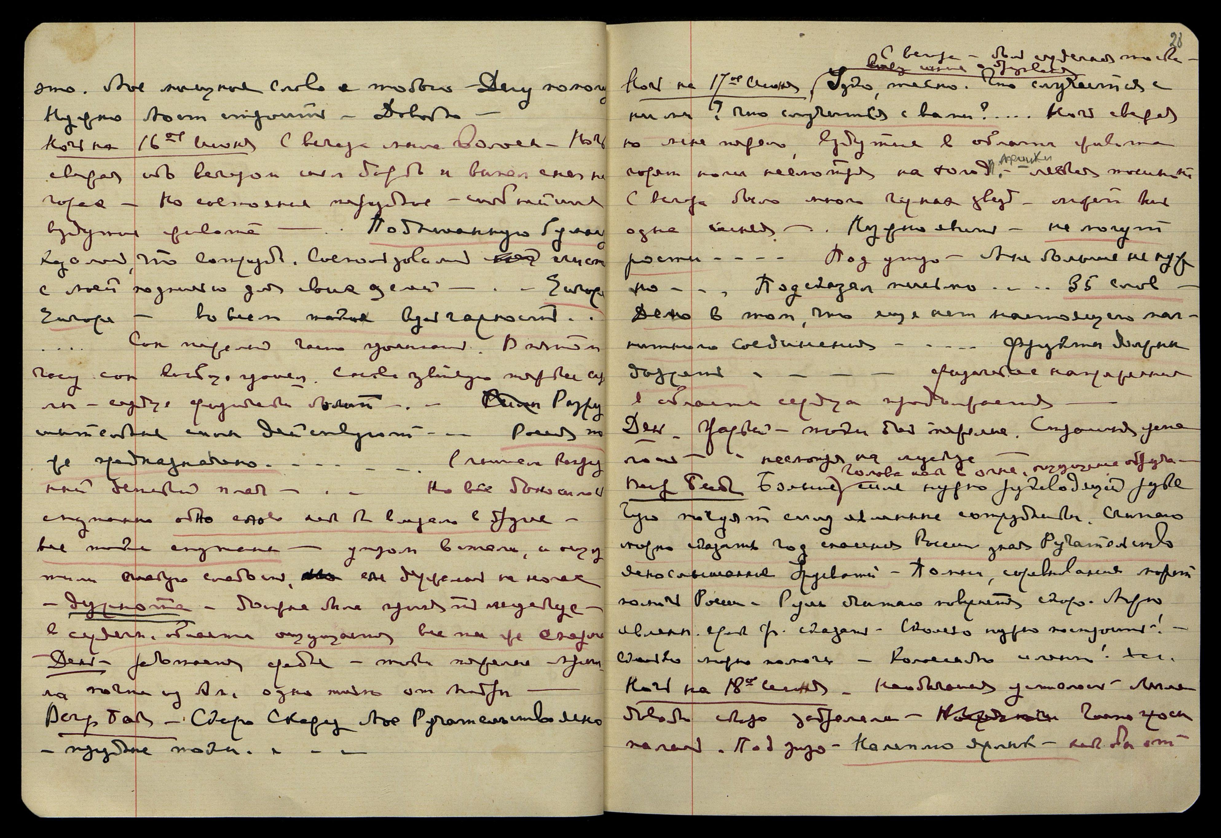 Ночь на 24-е июня. Прохладно. Большая усталость после возмущения поступками сотр[удников]. Донеслись звуки рояля. Один аккорд взят в нисходящей скале. "Коснется и этого пальчика!..." − слышала еще, но быстро ускользало... Задремала, очнулась от слов, сказанных с большой силой и тоской: "Я погубила. Видишь какие потери!.. Я от него, как от чумы ограждала..." − думаю, что эти дружелюбные слова О[яны] относятся к Люмоу... Проснулась [в] половине пятого от сильного сердцебиения с ужасной тоской. Приняла строфант. "Драма какая!.. с вашей стороны... Школа хорошо." Последнее относится к моему вопросу о благополучии Зины...