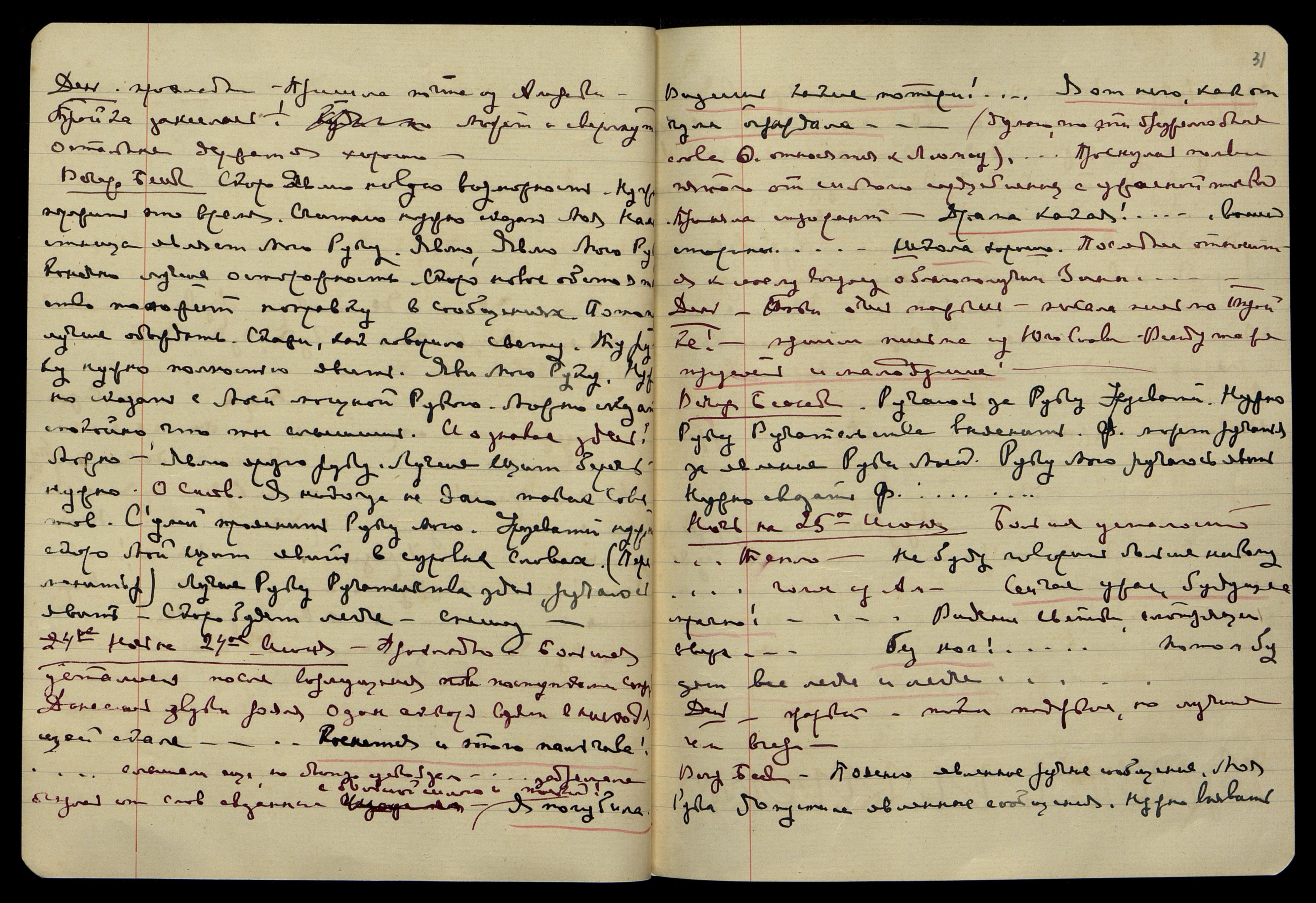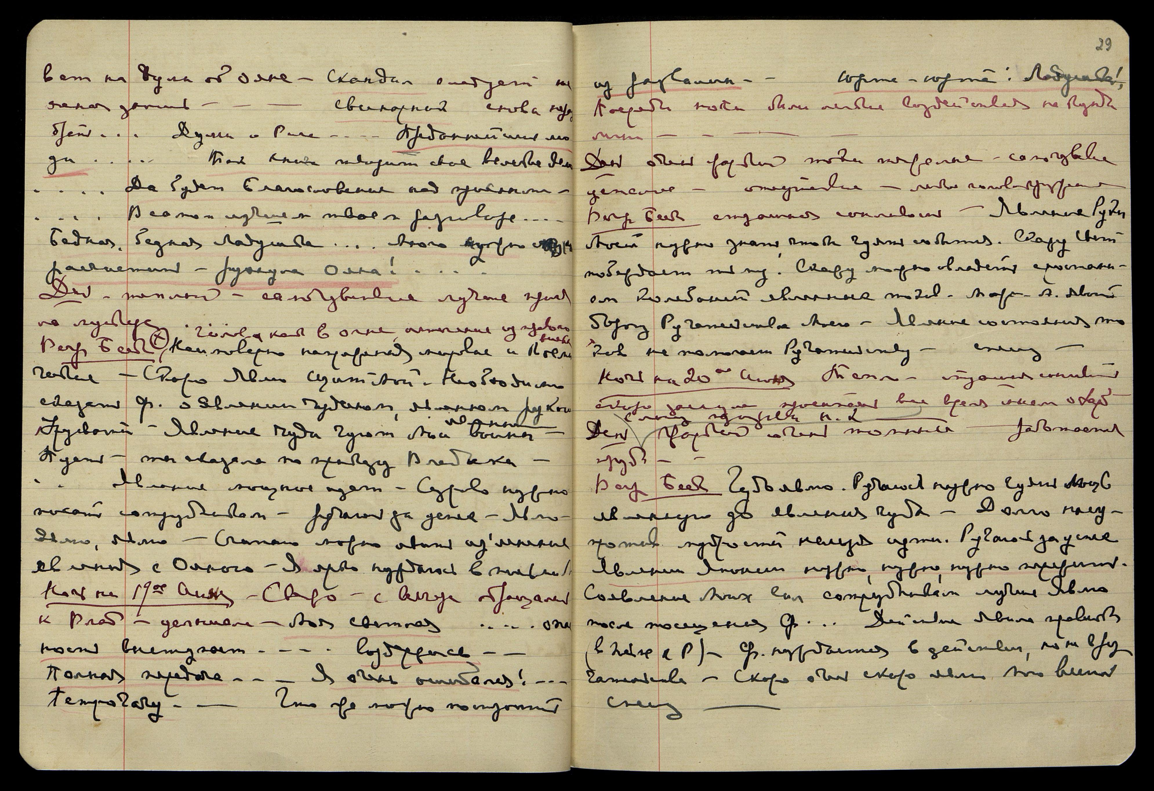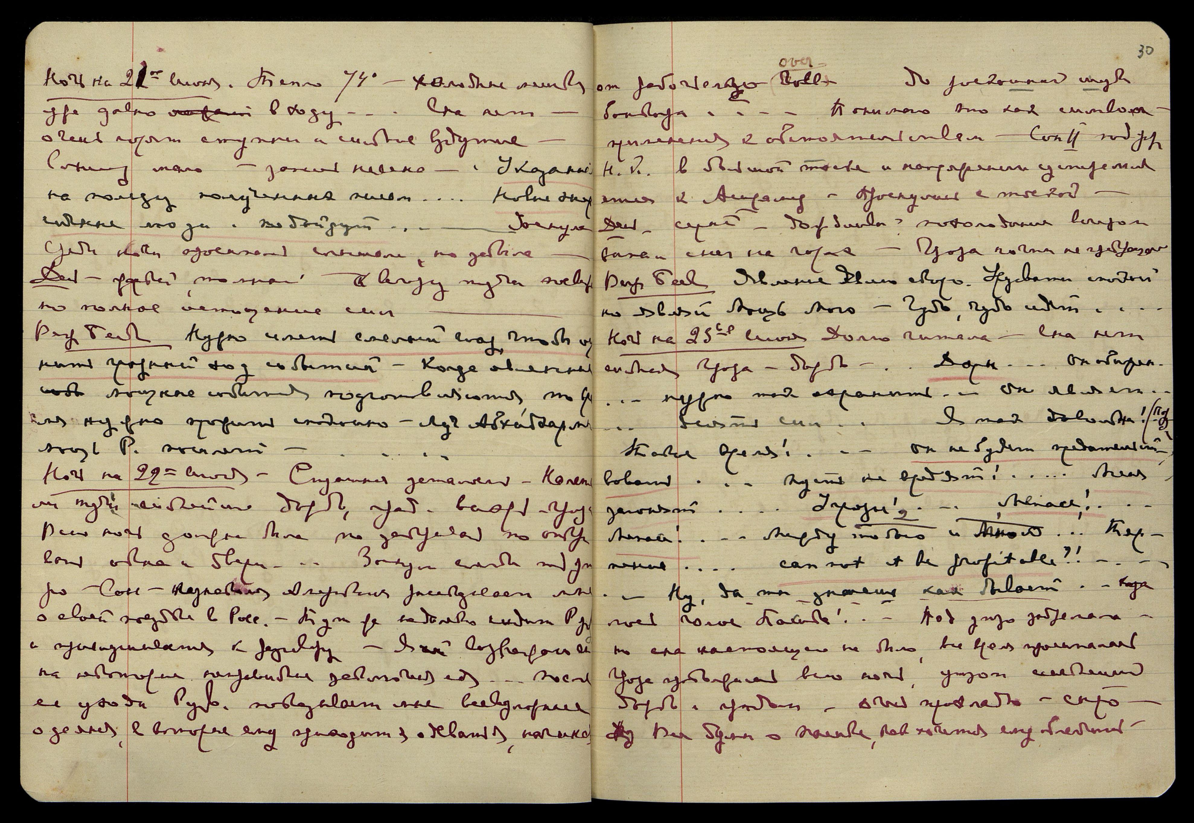 Ночь на 23-е июня. Долго читала. Сна нет, сильная гроза, дождь. "Дары... Он обижен... нужно так сохранить... Он являет... десять сил... Я так довольна! (Пор[ума]). Такое время!.. он не будет предательствовать... пусть не вредят!.. Меня загонят... Угрозы!.. Menace! Menace! [англ.: Угроза! Угроза!] Между Мною и тобою... Терпение... can not it be profitable?! [англ.: не может быть выгодно?!]... Ну, да ты знаешь как бывает..." − казалось голос Пасика!... Под утро задремала, но сна настоящего не было, всё время просыпалась. Гроза продолжалась всю ночь, утром сильнейший дождь с градом. Очень прохладно, сыро. Все думы о Пасике, как хочется ему облегчить.