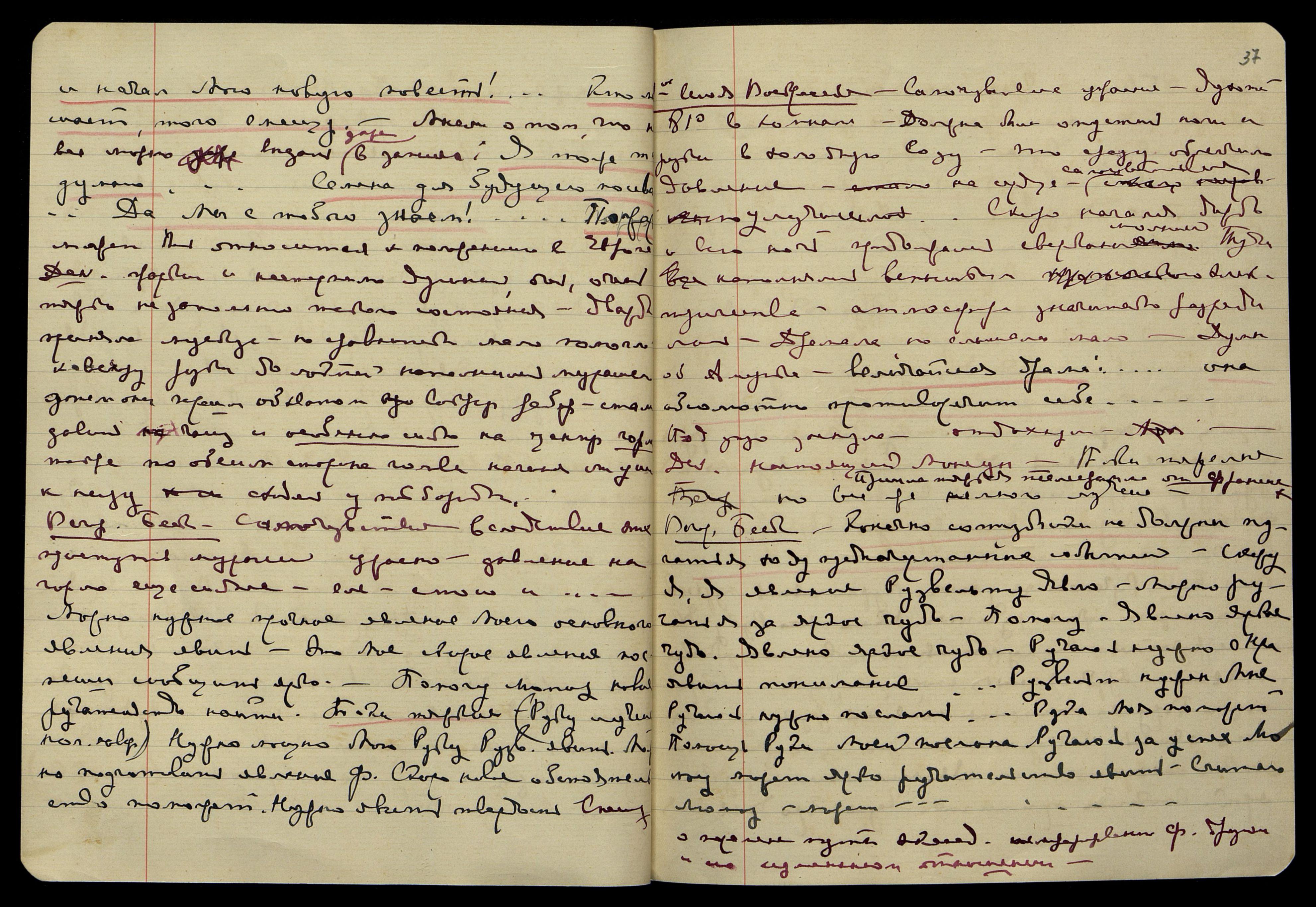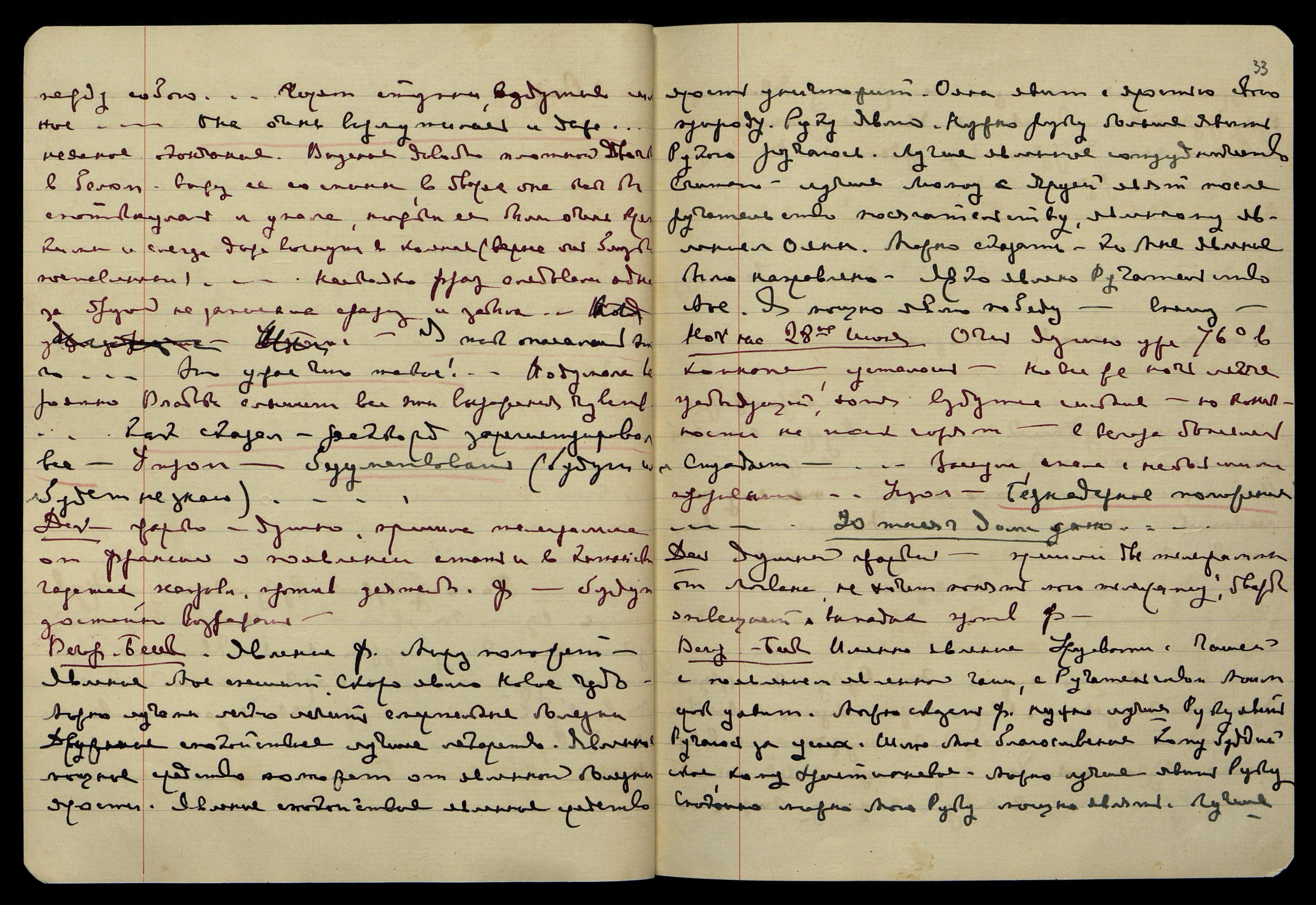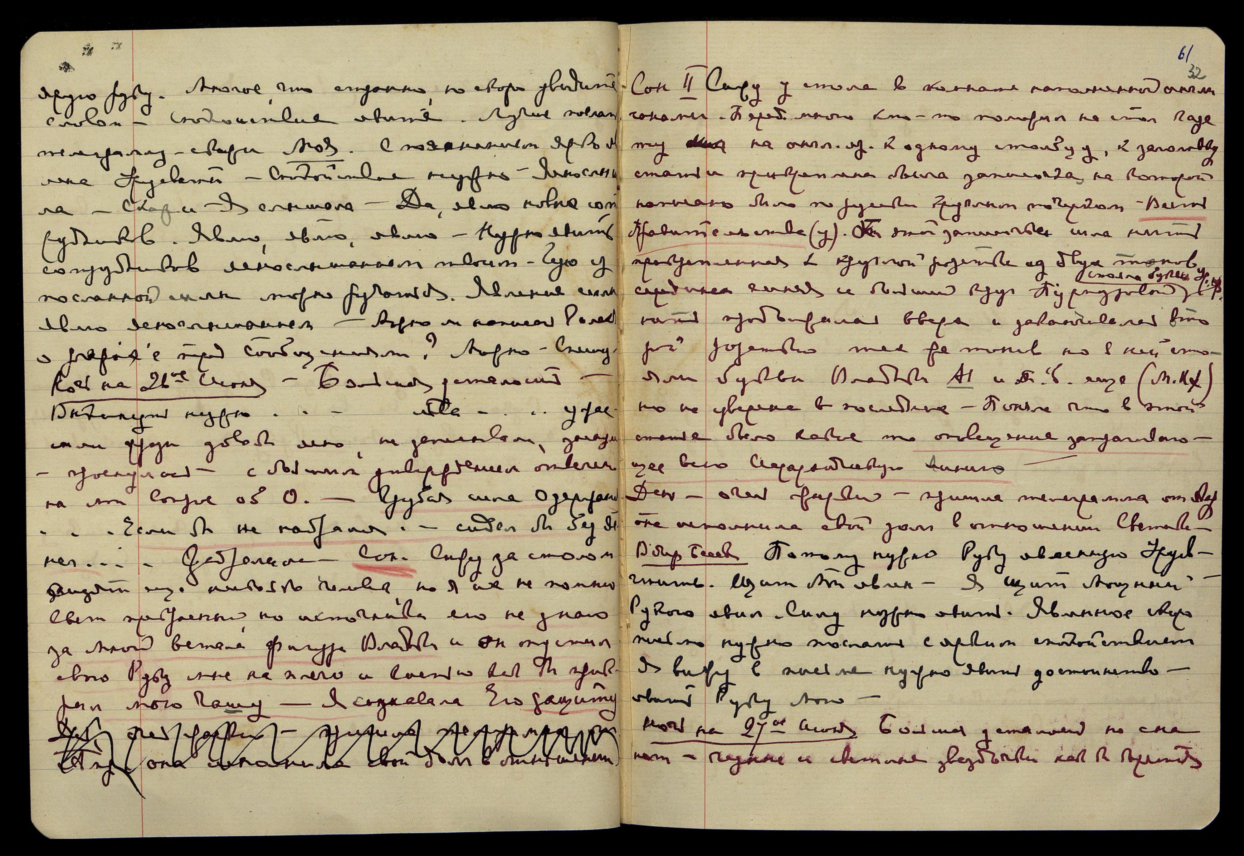 Ночь на 2-е июля. Ночь свежее, но несмотря на это, ступни горят. Сна нет. "Ой, мы не нарочно!... Что же было в этом письме?..." Думы о посылаемом мною завтра письме к нашим, и о тех перечисленных мною знаках, кот[орые] я там дала в утверждение своего права... Услышала: "Даётся весь План", − поняла, что нужно ещё вставить это. "Чтобы принять (с пониманием)", − запись неясна. "Господин пришёл", − видение лилового конверта, написанного лиловыми чернилами, кот[орые] употребл[яет] О[яна]. Думы об Ам[ерике]: "Страх... Никогда не было сказано... Такая кухня!.. Тревогу создала... страшное пережила... ты даже не можешь себе представить... Ярую, самовольную руку!... Ярая, ярая!..." Заснула, встала рано.