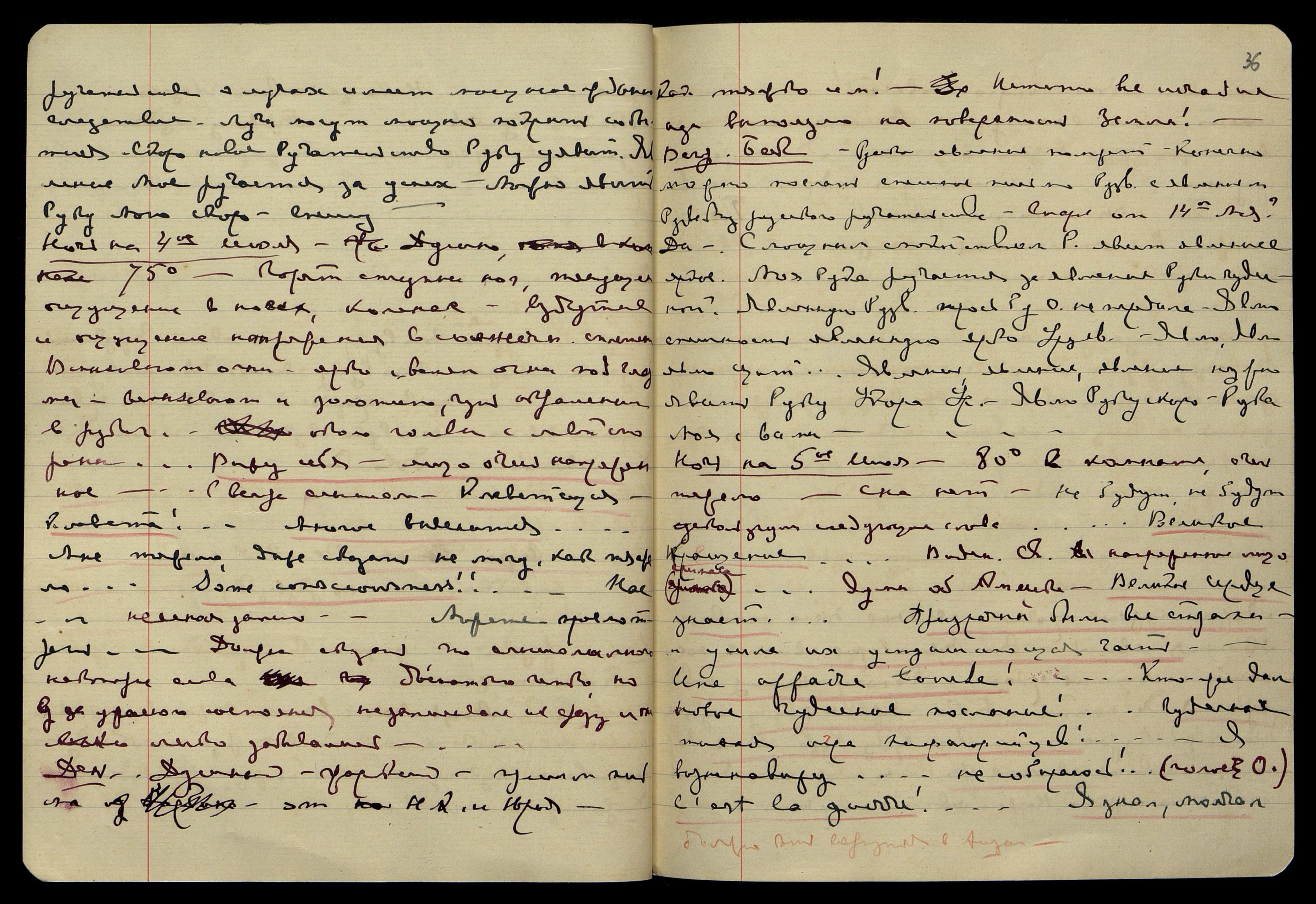 Ночь на 5-е июля. 80°F[= 26°С] в комнате, очень тяжело, сна нет. "Не будут, не будут..." − ускользнули следующие слова. "Великое крещение..." Видение Св[етика], напряженное лицо (гримаса)... Думы об Америке: "Великое Сердце знает... Призрачны были все страхи, и ушла их устрашающая часть. Une affaire louche! [фран.: Сомнительные дела!]... Кто же дал новое чудесное послание!.. Чудесная тихая игра пифагорейцев!... Я возненавижу... не собираюсь!... (голос О[яны]) C’est la guerre! [фран.: Это война!]... Я знал, молчал