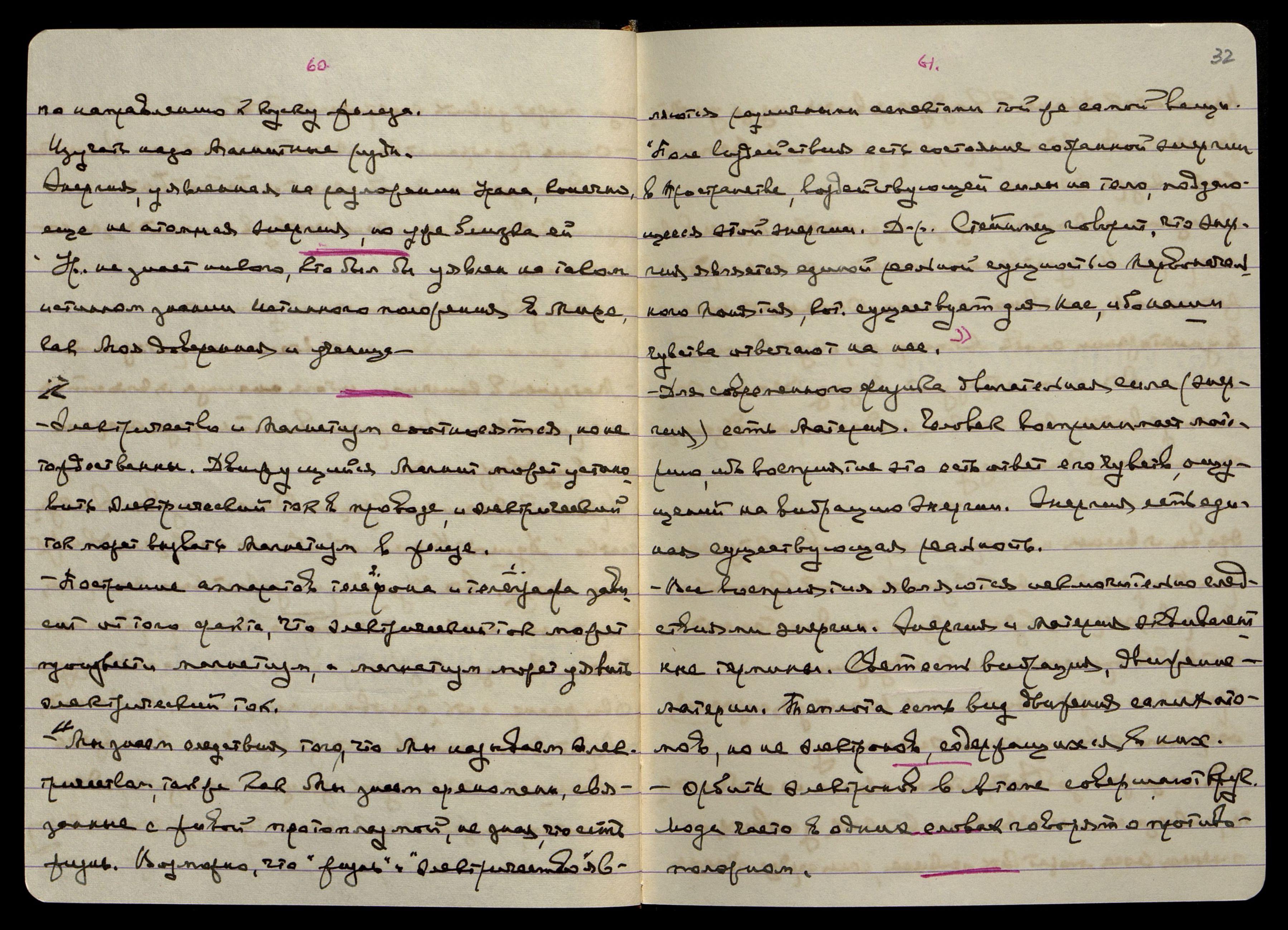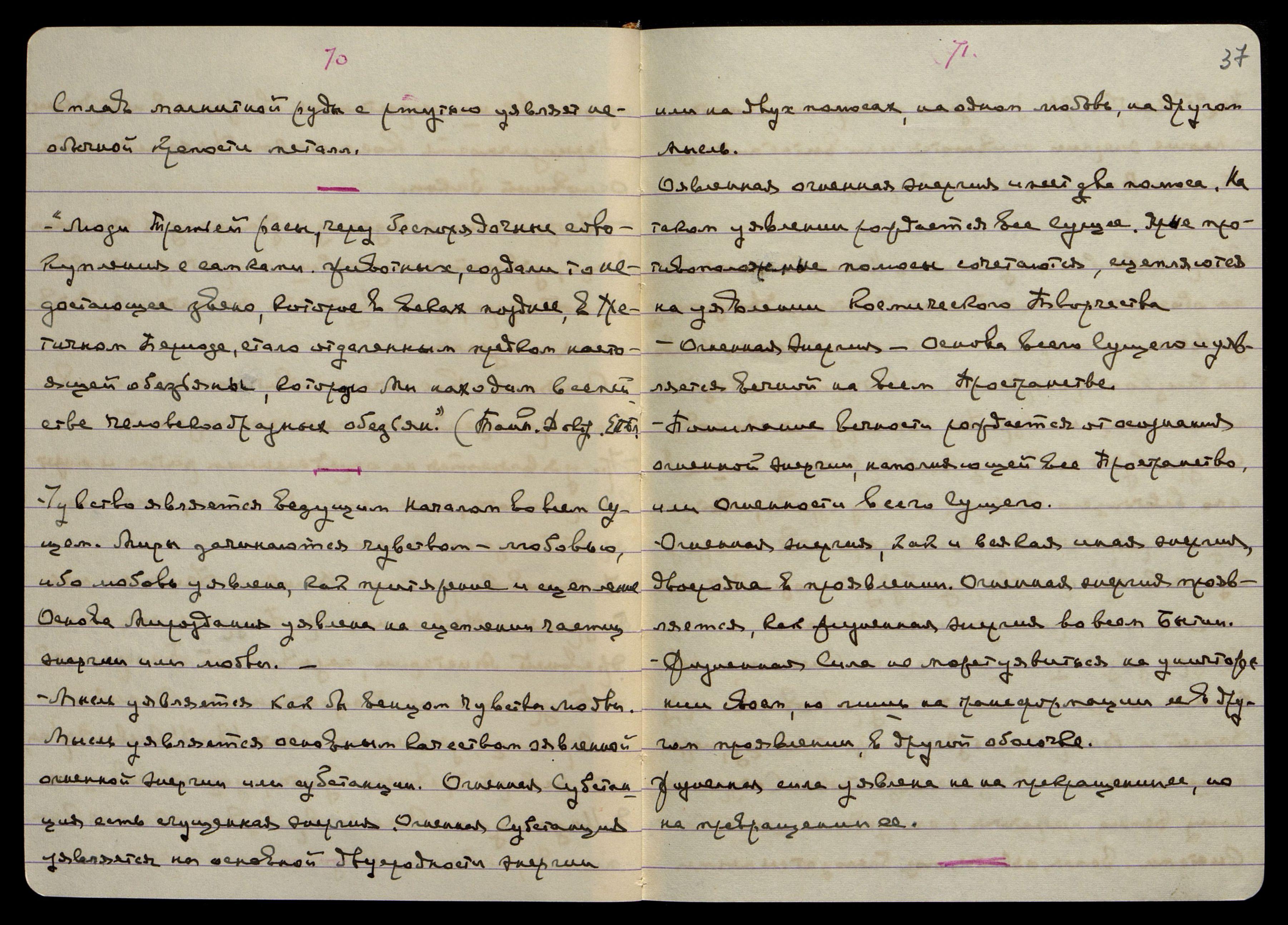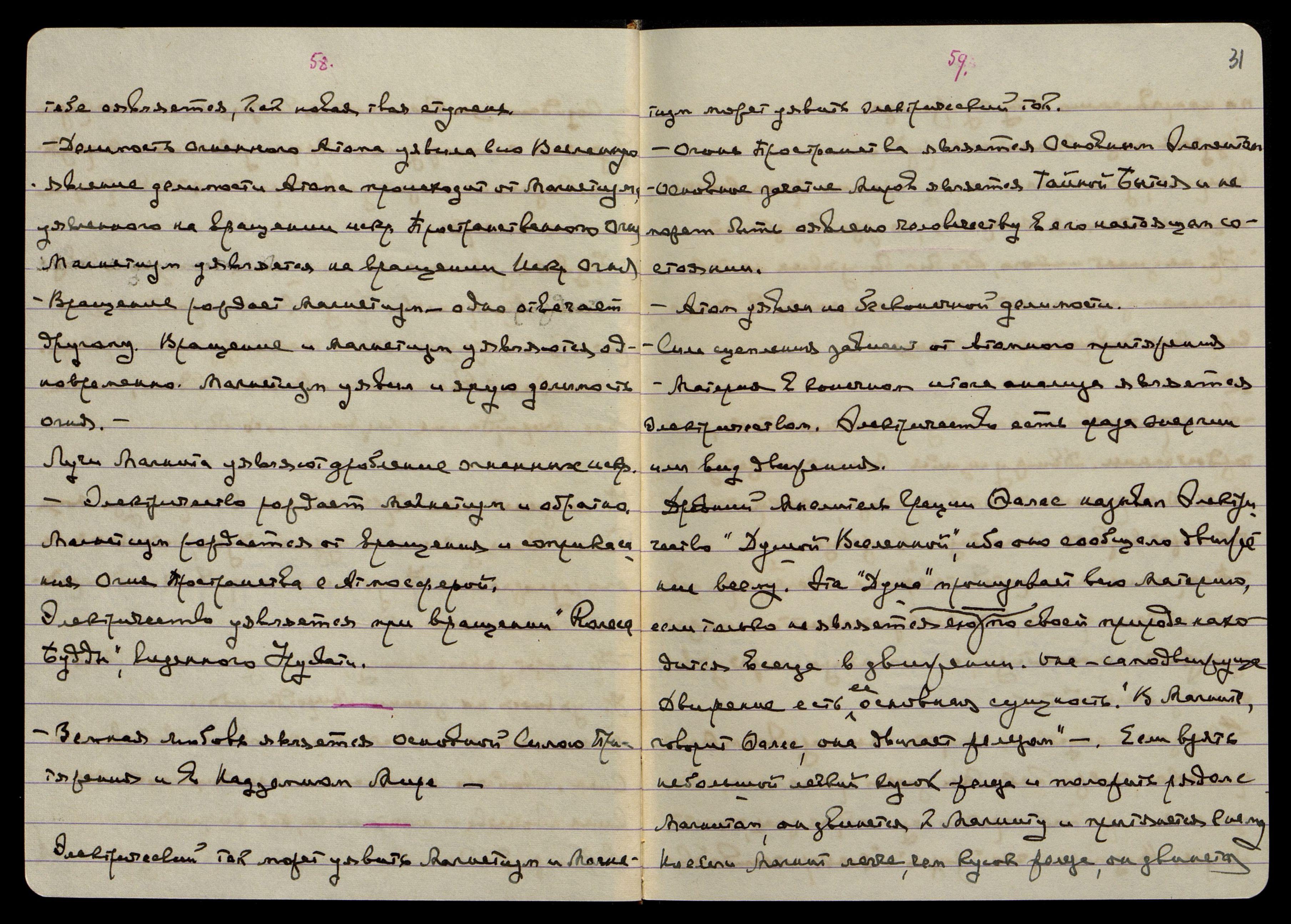 "Мы знаем следствия того, что Мы называем электричеством, так же как Мы знаем феномены, связанные с живой протоплазмой, не зная, что есть жизнь. Возможно, что "жизнь" и "электричество" являются различными аспектами той же самой вещи. Поле воздействия есть состояние собранной энергии в Пространстве, воздействующей силы на тело, поддающееся этой энергии. Д-р Стейниц говорит, что энергия является единой реальной сущностью Первоначального Понятия, кот[орое] существует для нас, ибо наши чувства отвечают на неё".