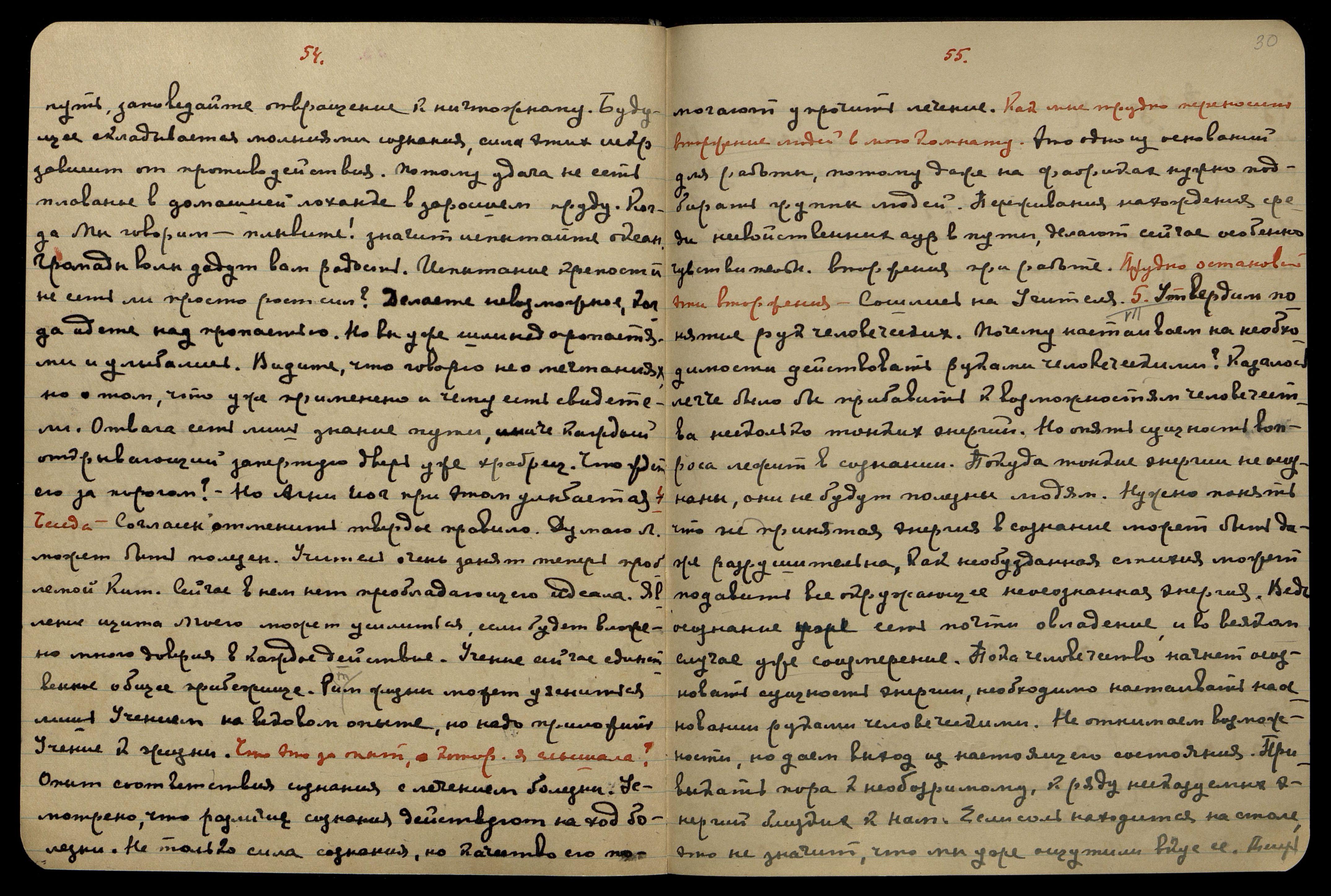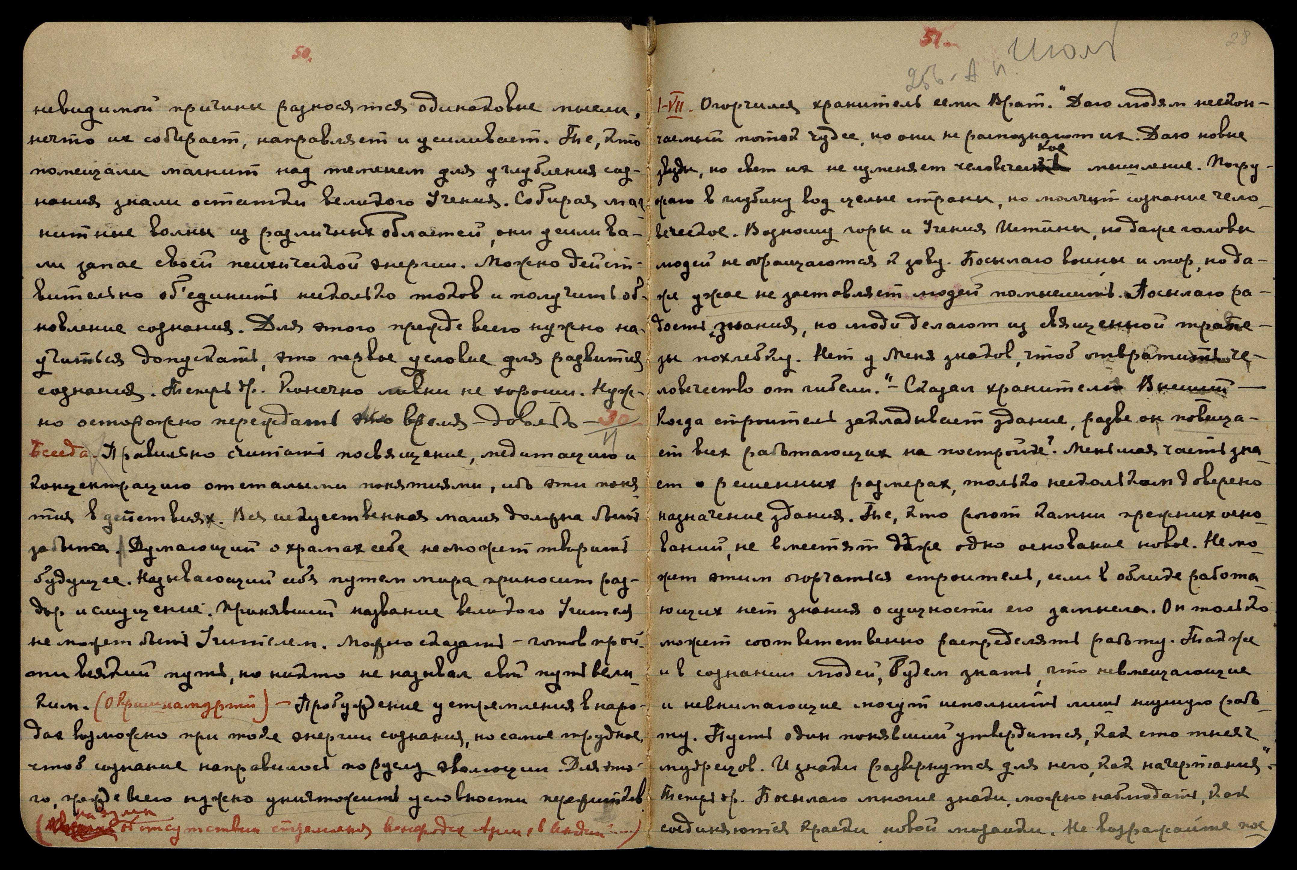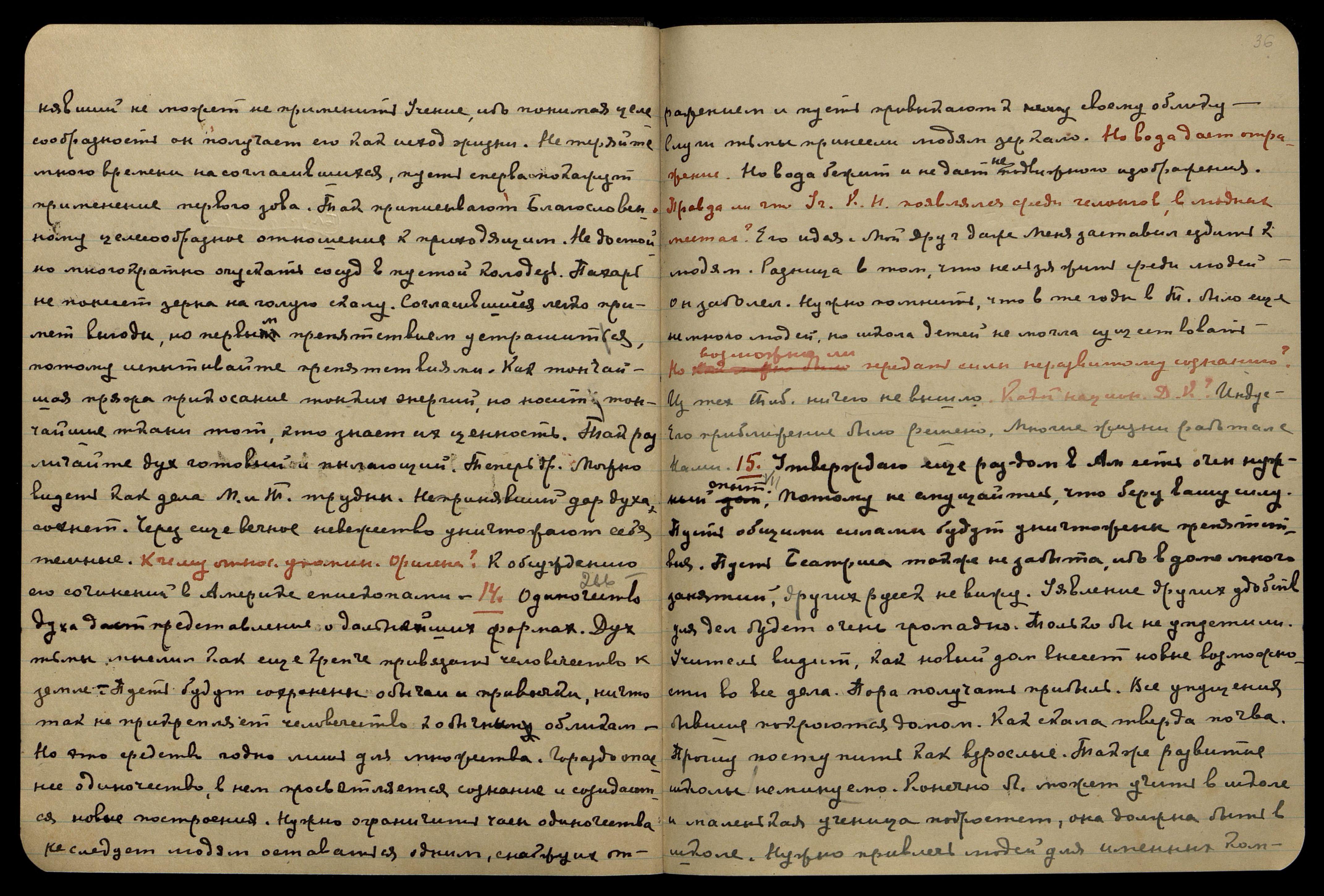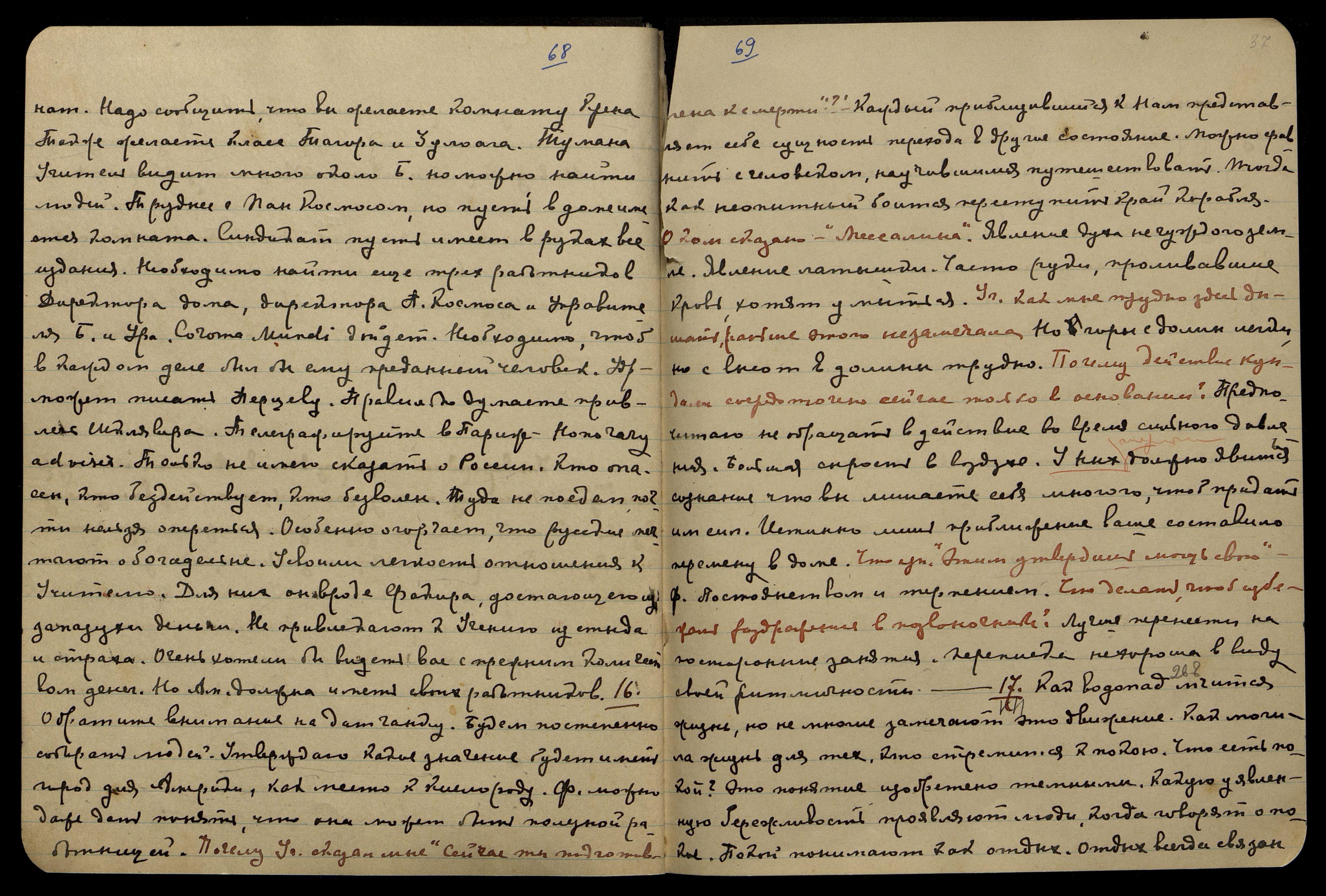 15/VII. Утверждаю еще раз − дом в Ам[ерике] есть очень нужный опыт. Потому не смущайтесь, что беру вашу силу. Пусть общими силами будут уничтожены препятствия. Пусть Беатриса также не забыта, ибо в доме много занятий, других русских не вижу. Уявление других удобств для дел будет очень громадно. Только бы не упустили. Учитель видит, как новый дом внесет новые возможности во все дела. Пора получать прибыль. Все упущения бывшие покроются домом. Как скала, тверда почва. Прошу поступить как взрослые. Также развитие школы неминуемо. Конечно, Л[юмоу] может учить в Школе, и маленькая ученица подрастет, она должна быть в школе. Нужно привлечь людей для именных ком-