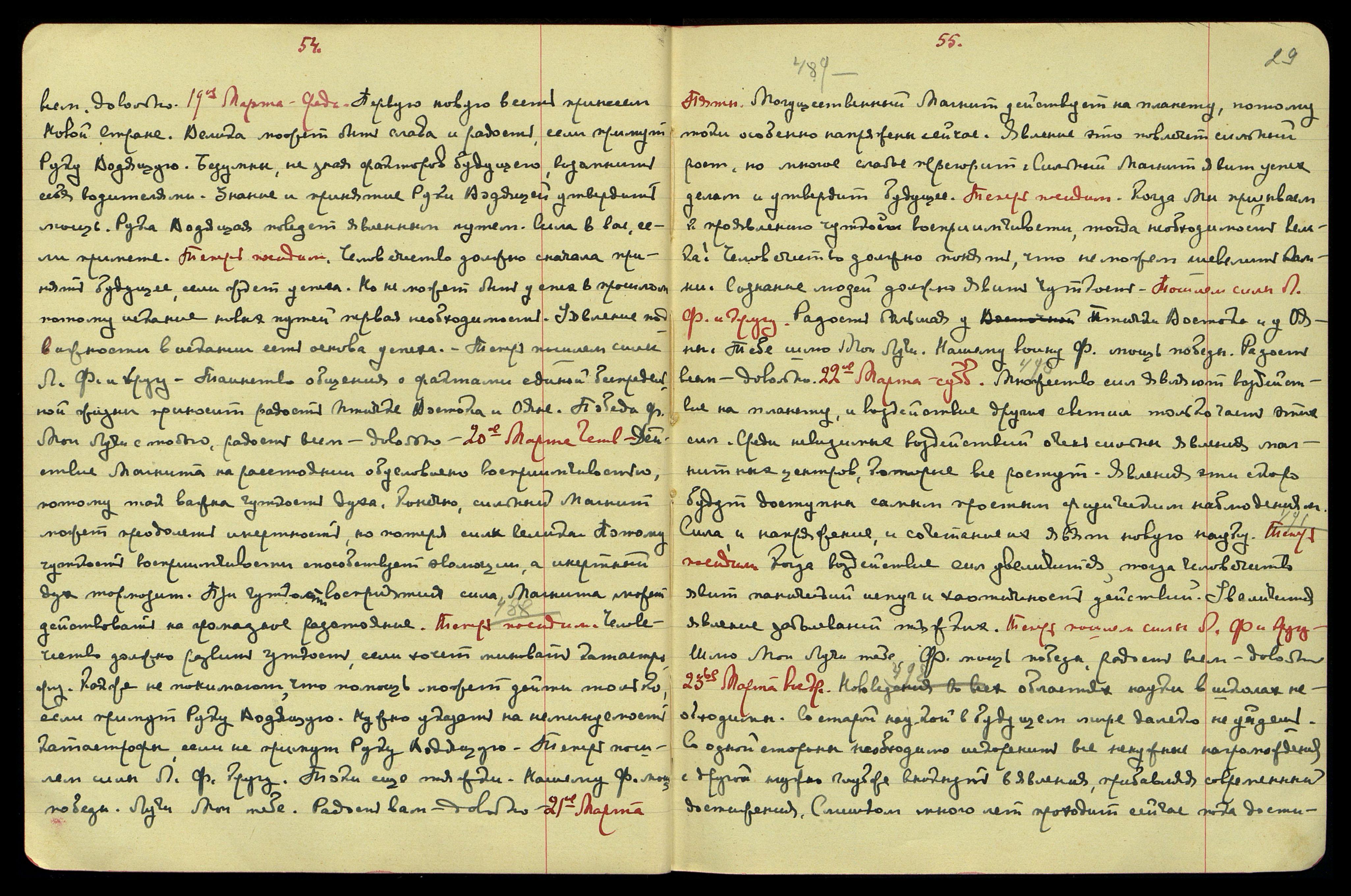 14-ое марта. Пятн[ица]. [Беспредельность] § 482. Драгоценность жизни людьми не принята, между тем явление жизни чудесно и не ограничено в возможностях подъёма духа. Человечество не любит смотреть в даль будущего, и сознание копошится в пыли непосредственной бли-