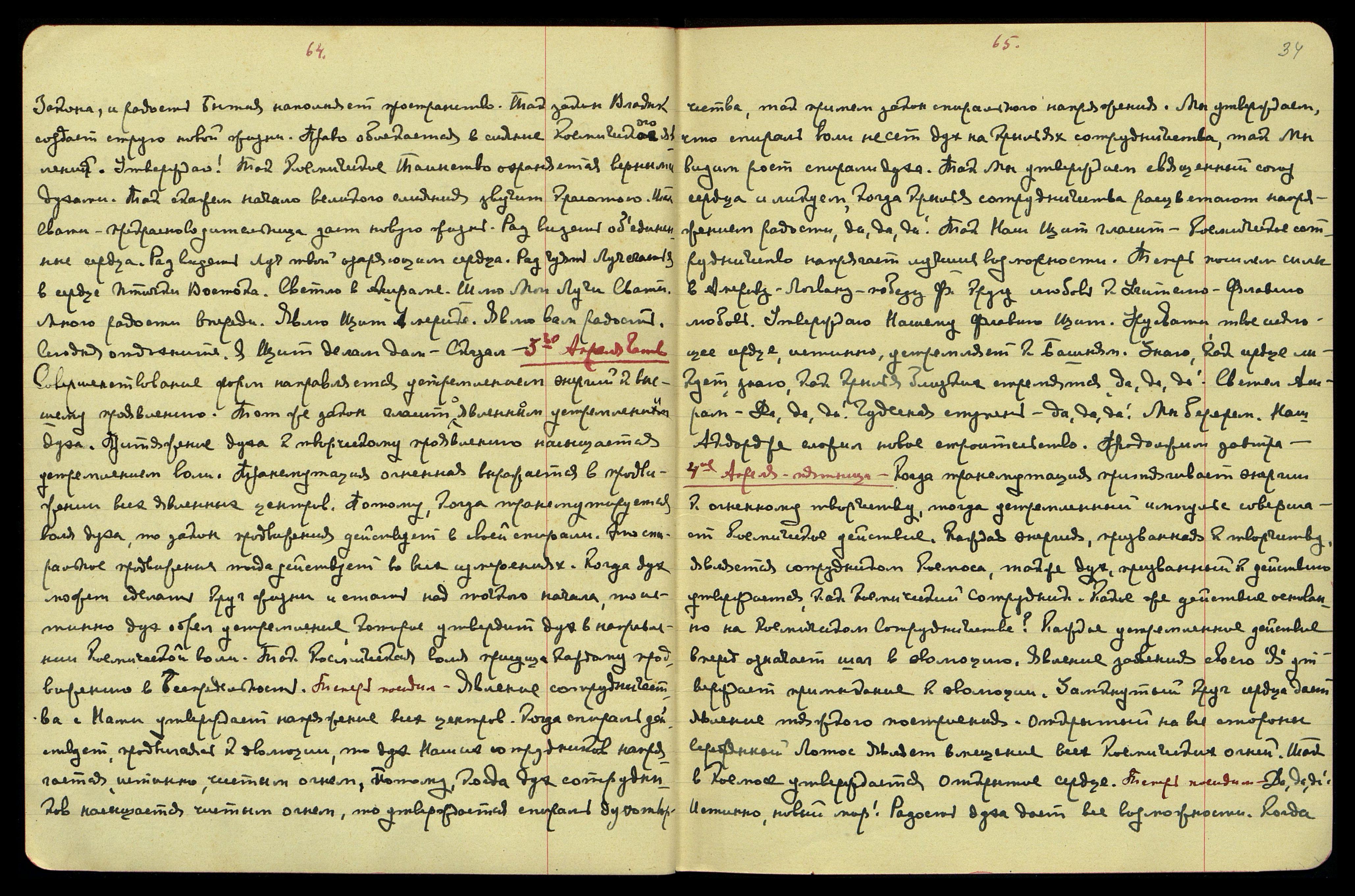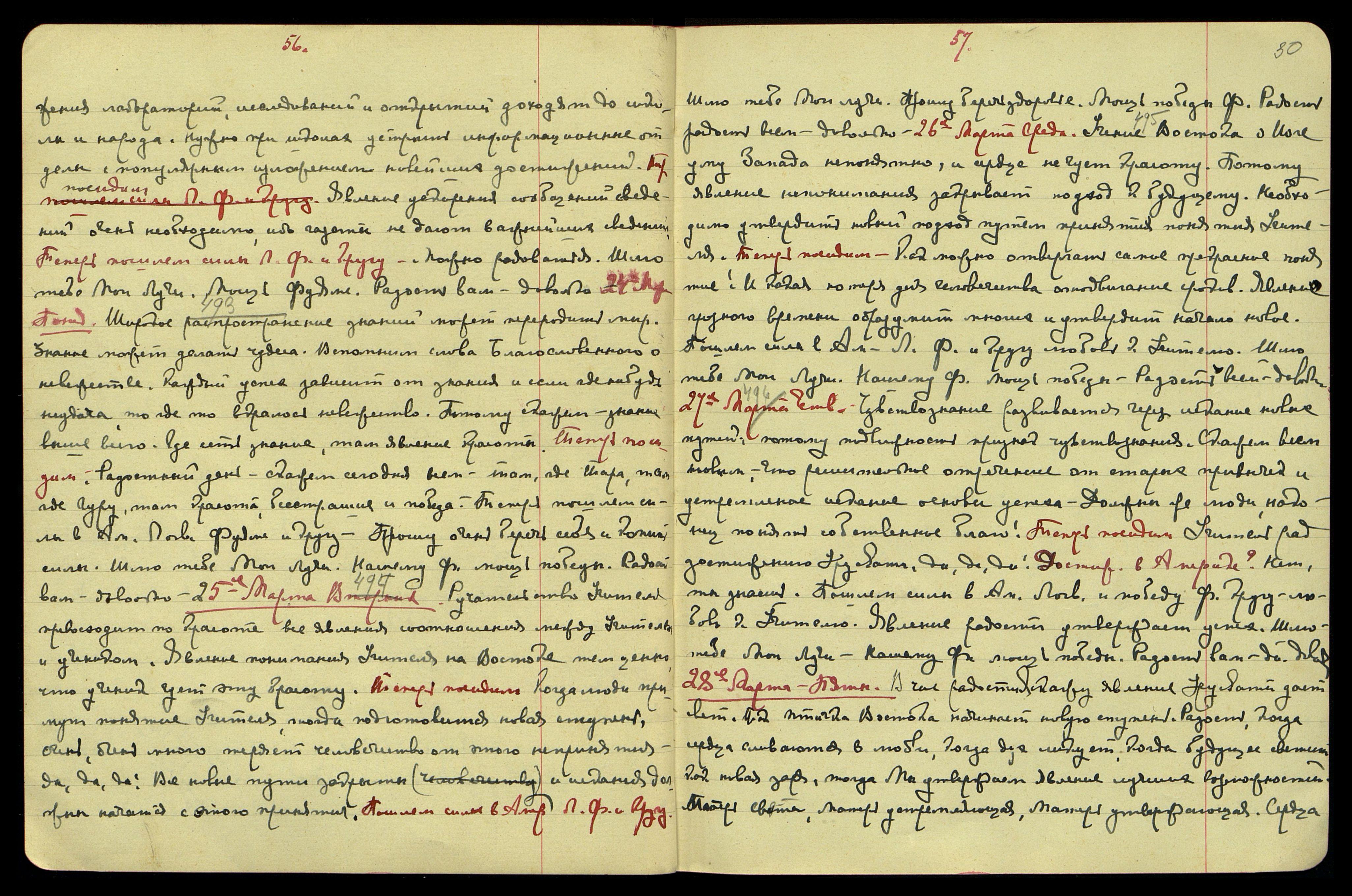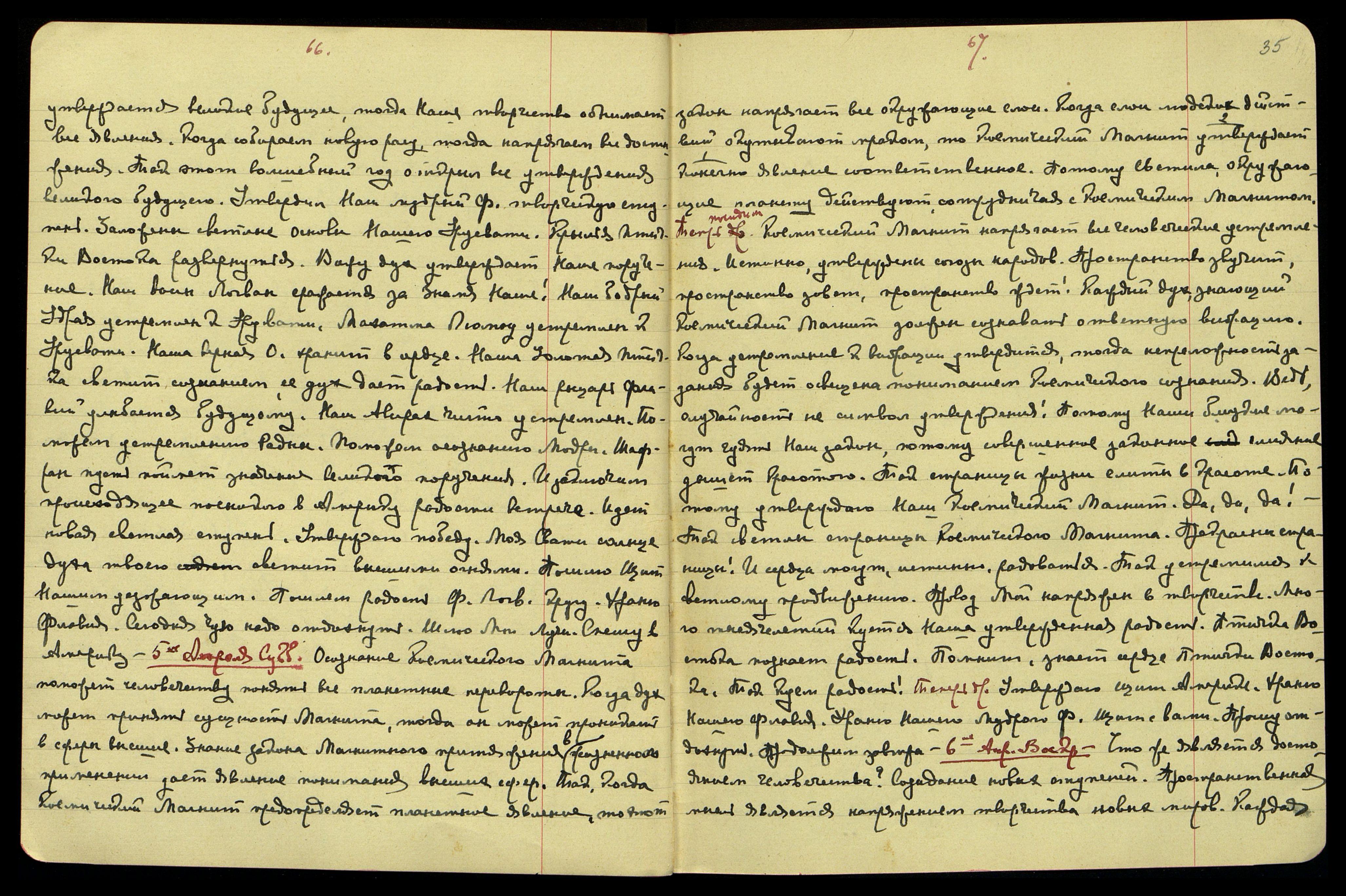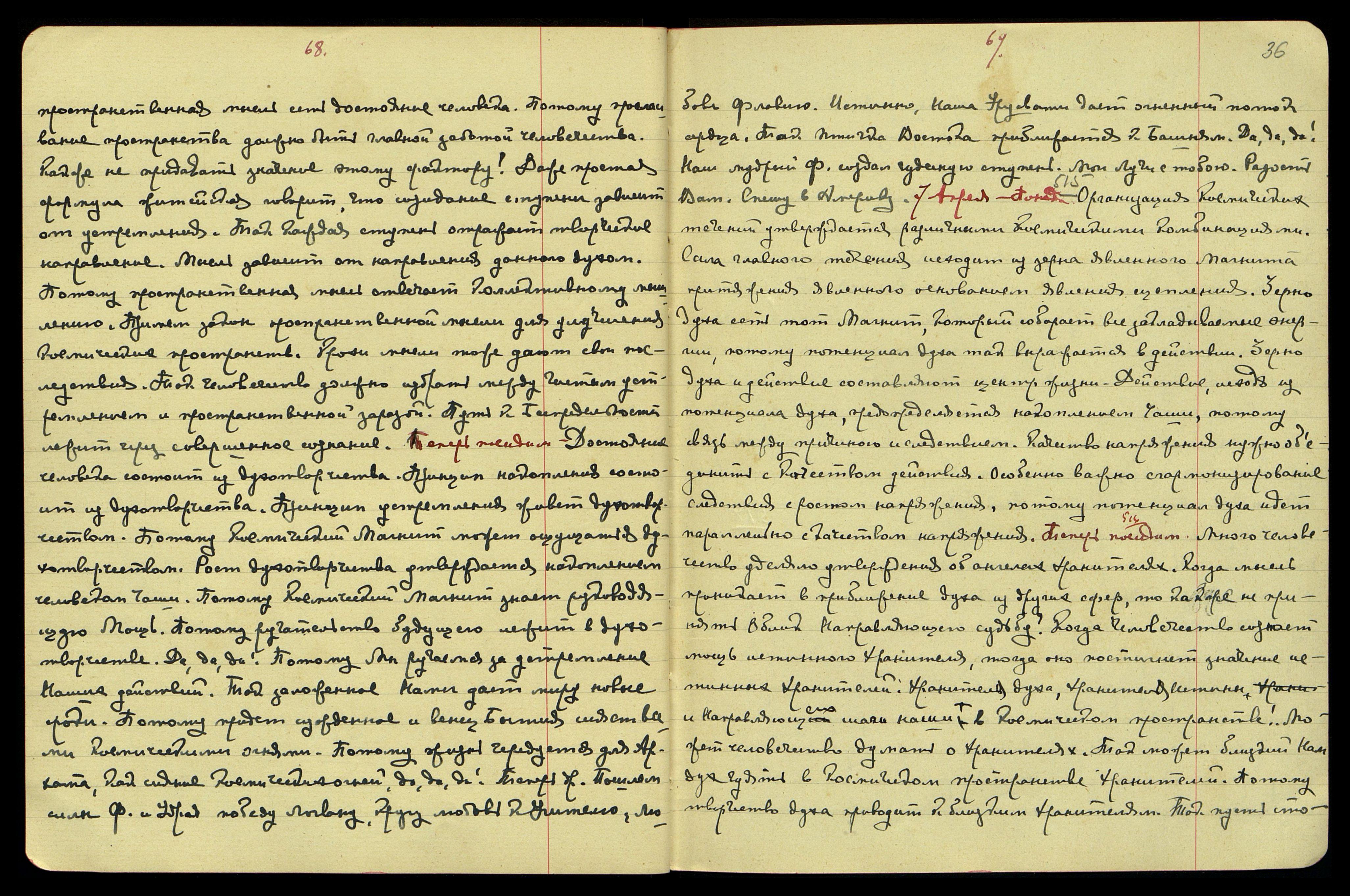 6-ое апр[еля]. Воскр[есенье]. Что же является достоянием человечества? Созидание новых ступеней. Пространственная мысль является напряжением творчества новых миров. Каждая