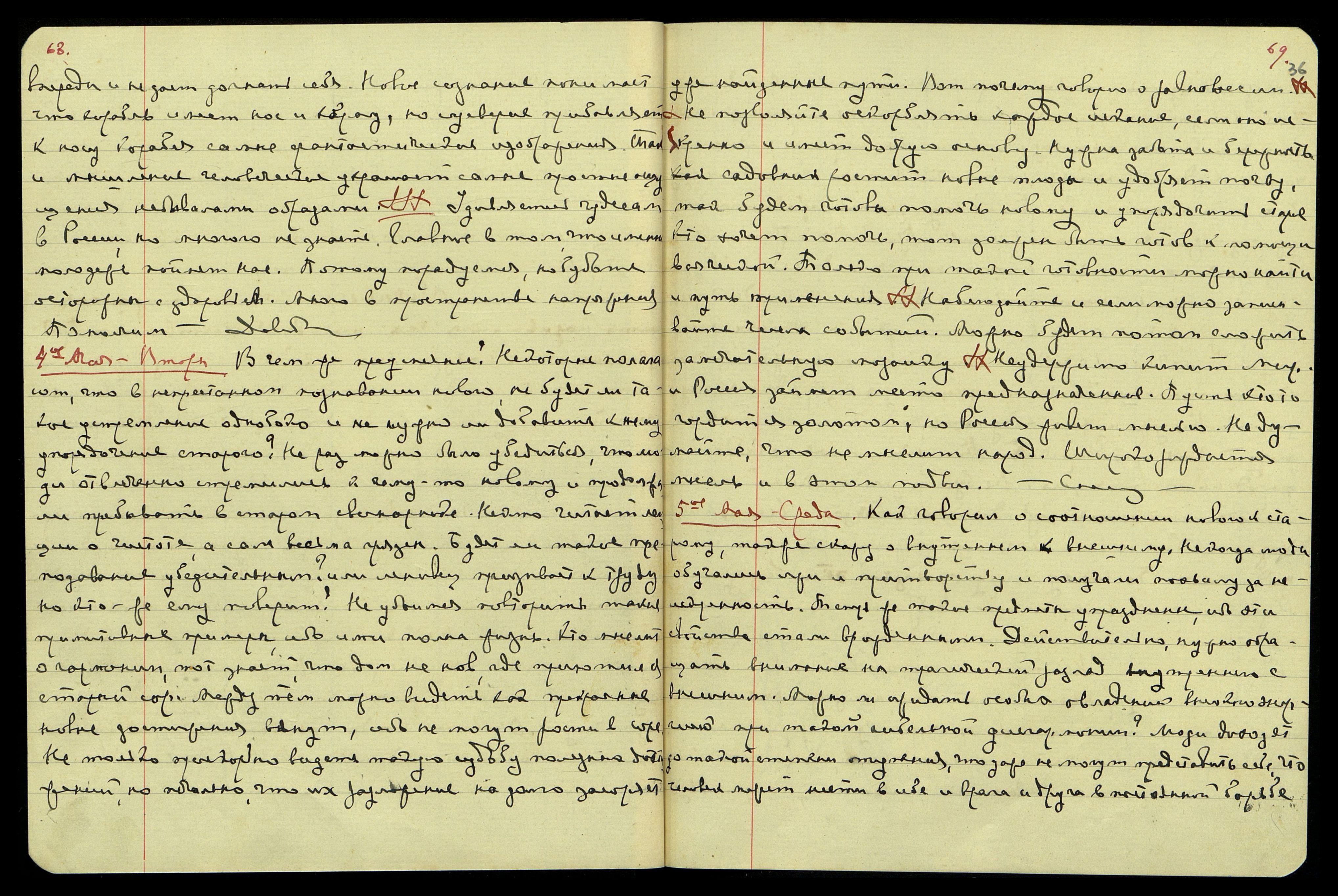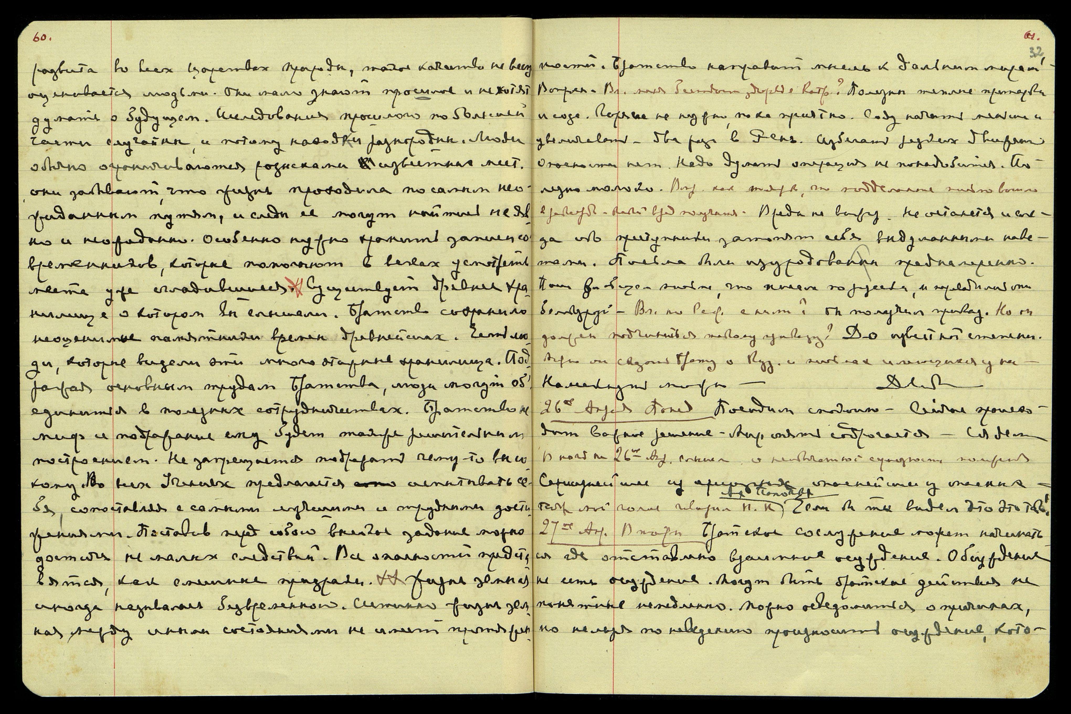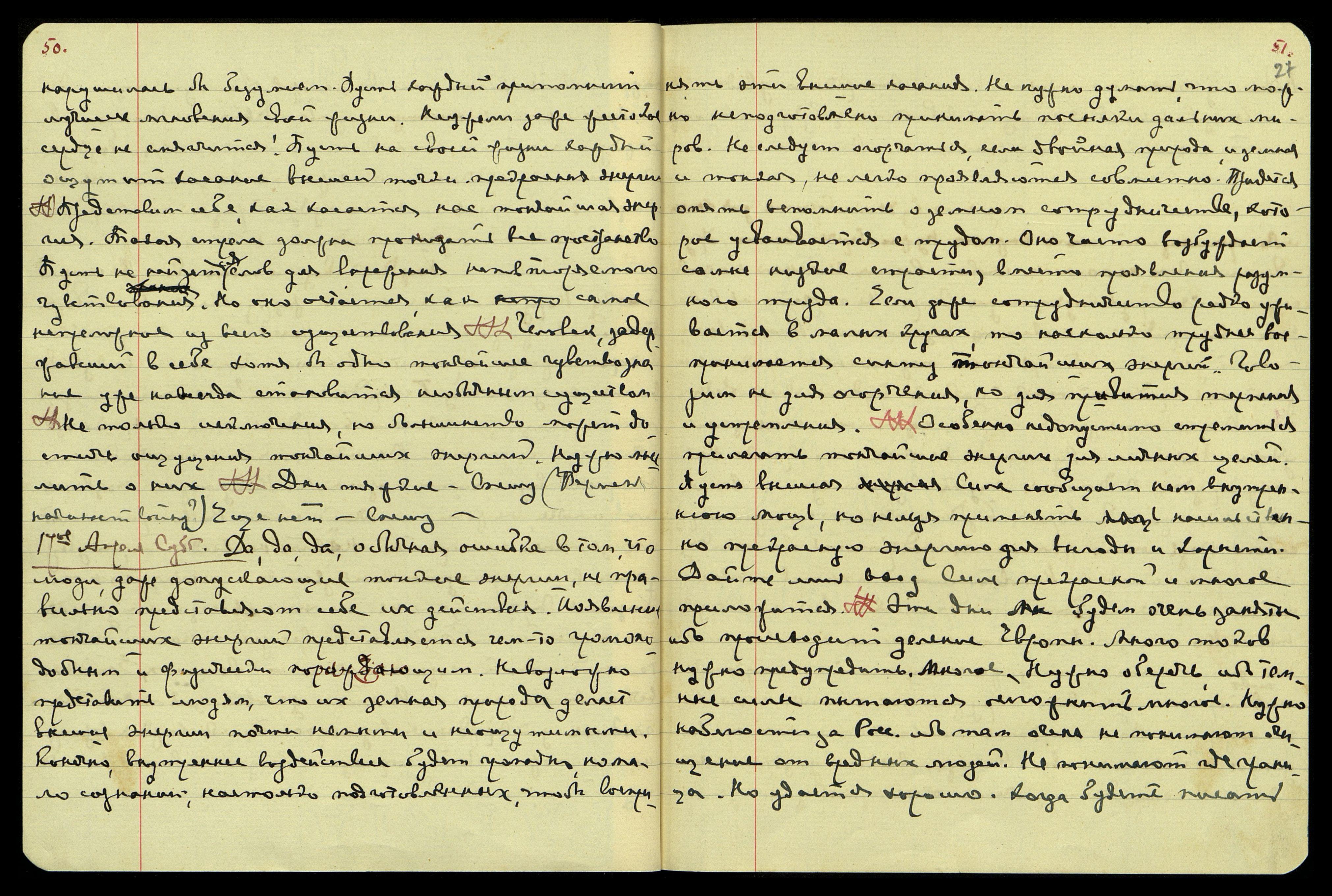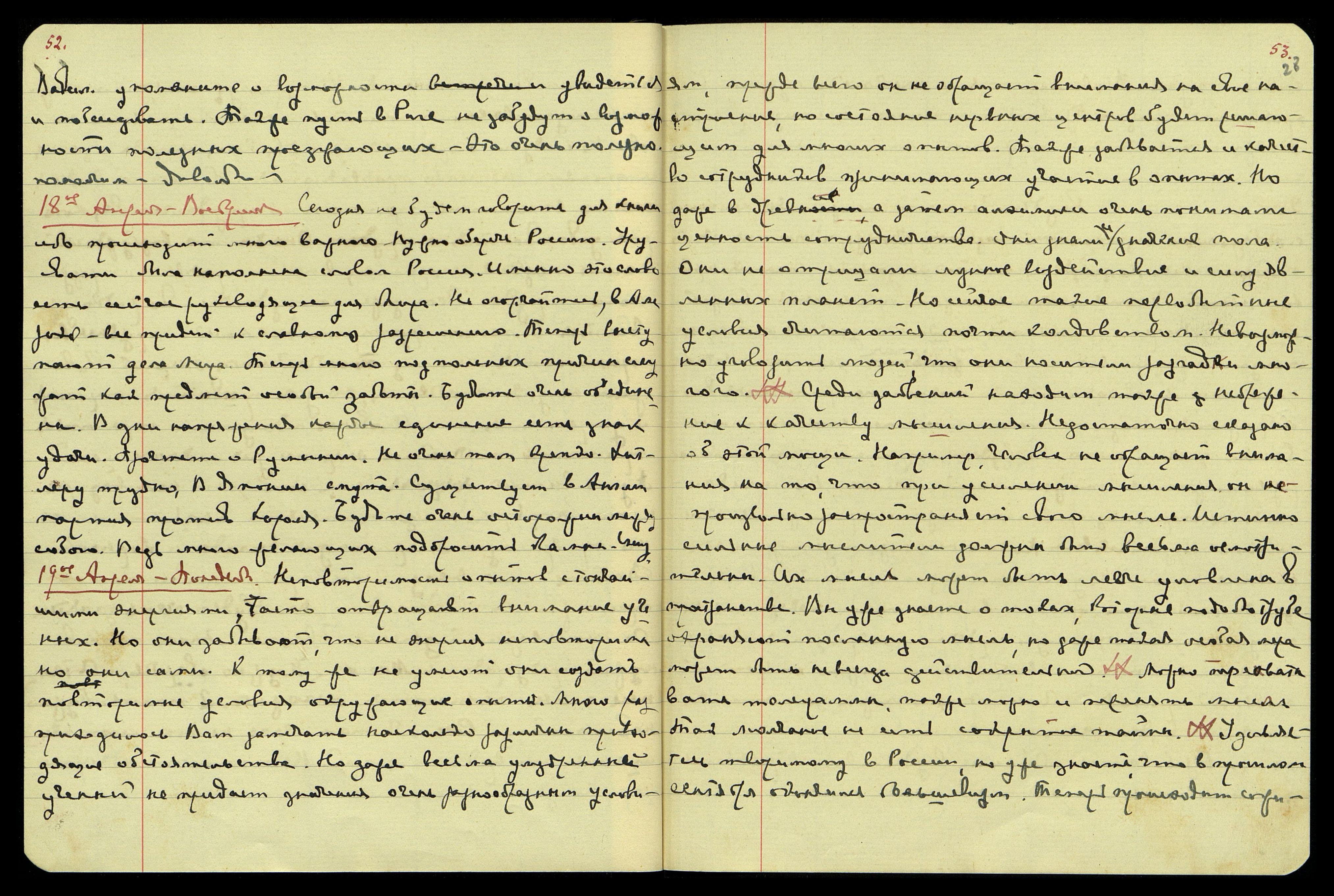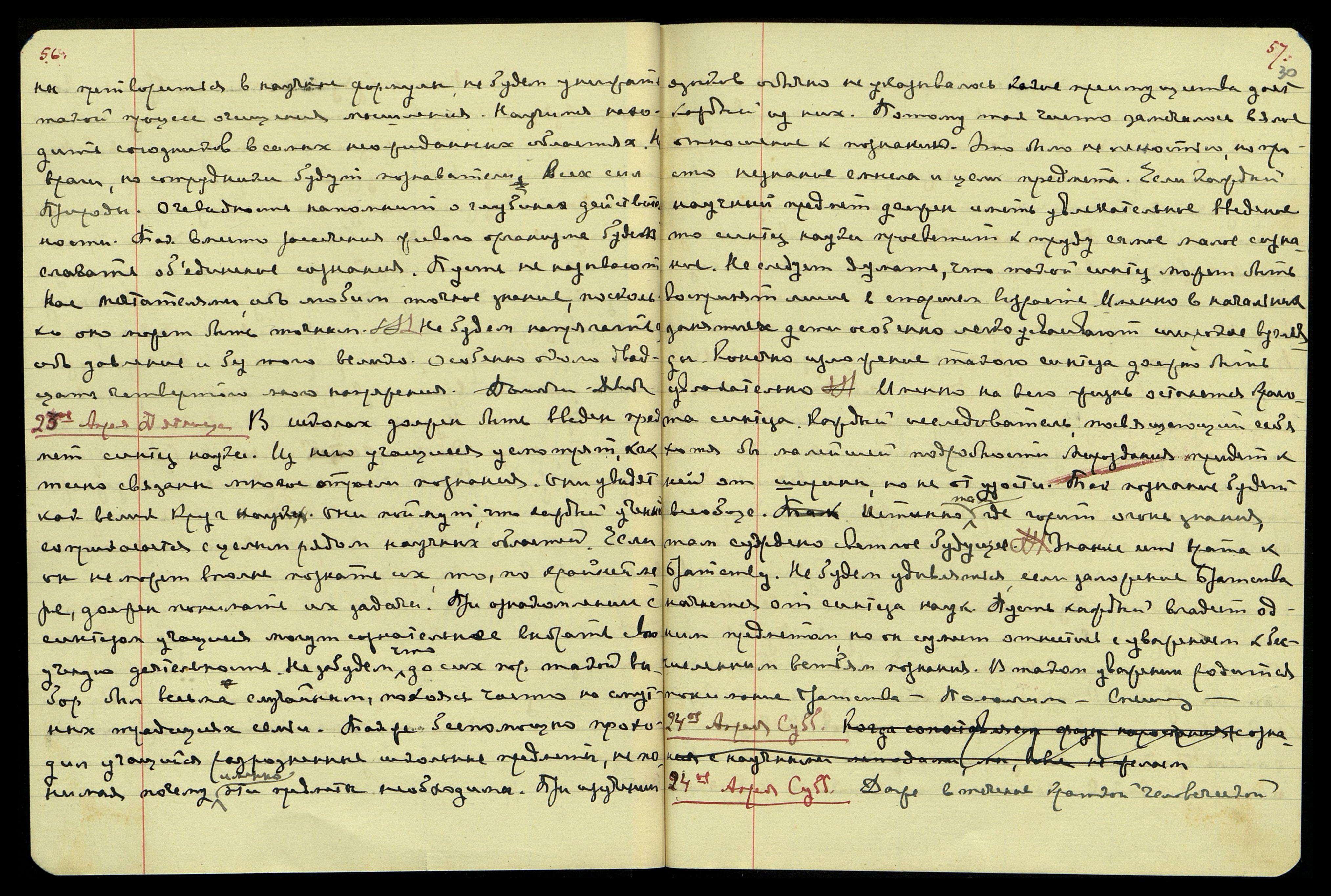 27-ое апр[еля]. Вторник. Братское сослужение может начинаться, где оставлено взаимное осуждение. Обсуждение не есть осуждение. Могут быть братские действия, не понятные немедленно. Можно осведомиться о причинах, но нельзя по неведению произносить осуждение, кото-