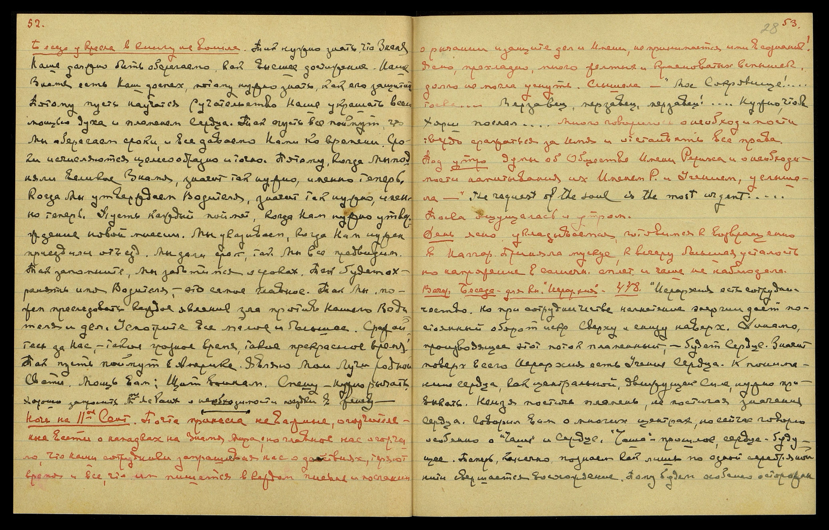 Ночь на 11-ое сент[ября]. Почта принесла неважные, огорчительные вести о нападках на Знамя Мира; но главное нас огорчало, что наши сотрудники, запрашивая нас о действиях, теряют время и всё, что им пишется в каждом письме и послании о рычании и защите дел и имени, не принимается ими в сознание! Ясно, прохладно, много жёлтых и красноватых вспышек, долго не могла уснуть. Слышала: "Моё Сокровище!" Тоска... "Мерзавец, мерзавец, мерзавец!.. Нужно, чтобы Хорш послал..." Много говорилось о необходимости твёрдо сражаться за имя и отстаивать все права. Под утро думы об Обществе имени Рериха и о необходимости напитывания их именем Р[ериха] и Учением. Услышала: "The request of the soul is the most urgent... [англ.: Просьба души − самая насущная...]" Тоска ощущалась и утром.