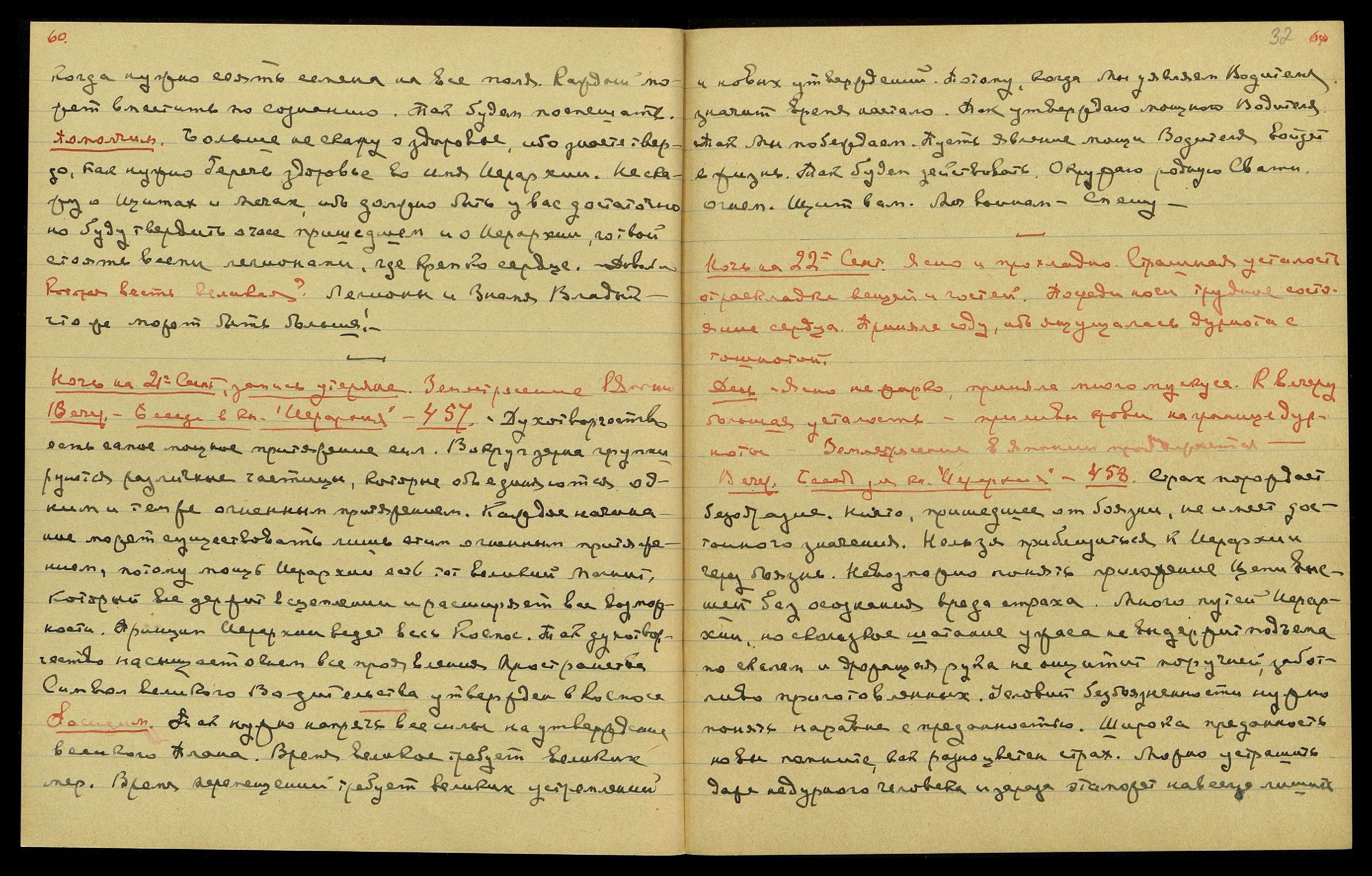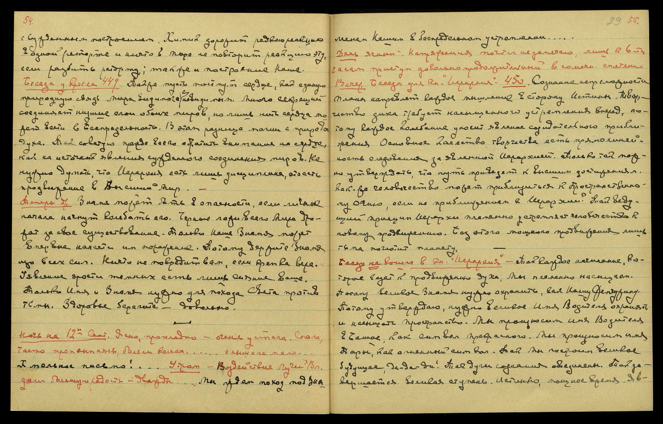 Ночь на 12-ое сент[ября]. Ясно, прохладно. Очень устала. Спала, часто просыпаясь − болели колена... Слышала мало... "Хмельное письмо!" Утром. Воздействие Лучей Вл[адыки], дали большую радость дважды... "Мы ждём поход под Знаменем Нашим в беспредельном устремлении..."