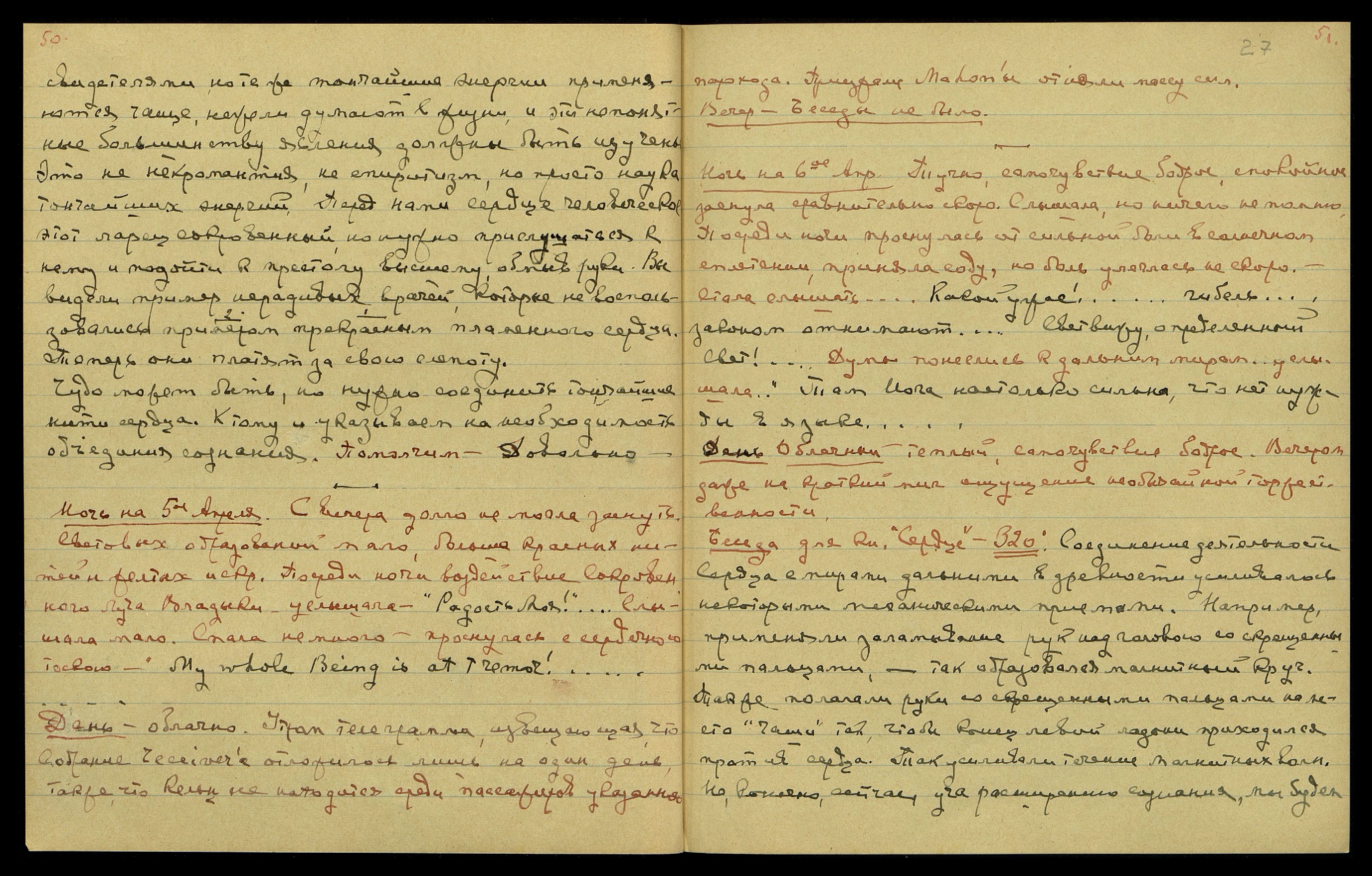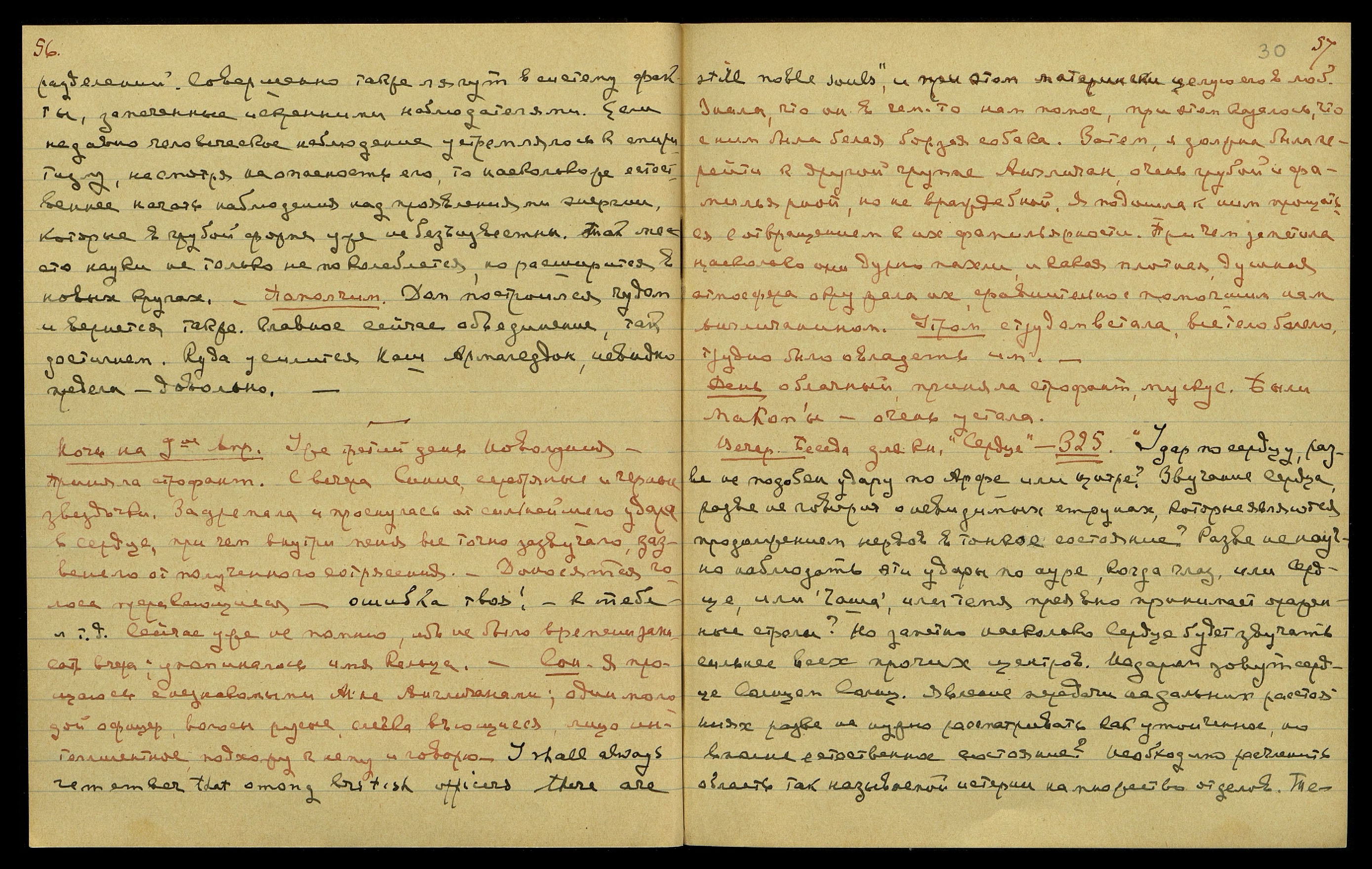 Ночь на 9-ое апр[еля]. Уже третий день новолуния. Приняла строфант. С вечера синие, серебряные и чёрные звёздочки. Задремала и проснулась от сильнейшего удара в сердце, причём внутри меня всё точно зазвучало, зазвенело от полученного сотрясения. Доносятся голоса прерывающиеся: "Ошибка твоя!... К тебе... и т.д." Сейчас уже не помню, ибо не было времени записать вчера. Упоминалось имя Кёльца. Сон. Я прощаюсь с незнакомыми мне англичанами; один молодой офицер − волосы русые, слегка вьющиеся, лицо интеллигентное. Подхожу к нему и говорю: "I shall always remember that british officers there are still noble souls [англ.: Я всегда буду помнить, что британские офицеры есть ещё остаются благородными душами]", − и при этом матерински целую его в лоб. Знала, что он в чём-то нам помог, при этом, казалось, что с ним была белая, борзая собака. Затем я должна была перейти к другой группе англичан, очень грубой и фамильярной, но не враждебной. Я подошла к ним прощаться с отвращением к их фамильярности. Причём заметила, насколько они дурно пахли и какая плотная, душная атмосфера окружала их, сравнительно с помогшим нам англичанином. Утром. С трудом встала, всё тело болело, трудно было овладеть им.