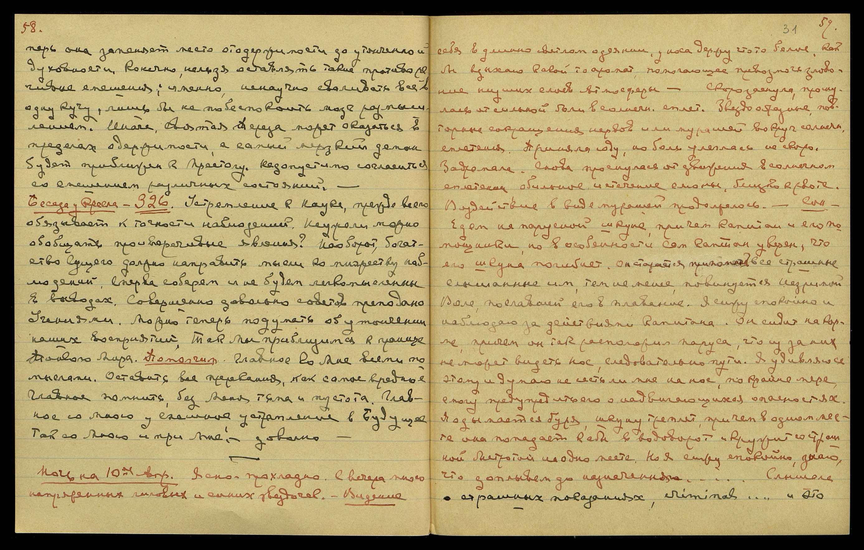 Ночь на 10-ое апр[еля]. Ясно, прохладно. С вечера много напряжённых лиловых и синих звёздочек. Видение себя в длинно[м], светлом одеянии. У носа держу что-то белое как бы вдыхаю какой-то аромат, помогающий превозмочь зловоние низших слоёв атмосферы. Скоро заснула, проснулась от сильной боли в солнечн[ом] сплет[ении]. Звездообразные, повторные сокращения нервов или мурашей вокруг солнечн[ого] сплетения. Приняла соду, но боль улеглась нескоро. Задремала. Снова проснулась от движения в солнечном сплетении, обильное истечение слюны, близко к рвоте. Воздействие в виде мурашей продолжалось. Сон. Едем на парусной шхуне, причём капитан и его помощники, но в особенности сам капитан, уверен, что его шхуна погибнет. Он старается припомнить все страшные слышанные им [пророчества], те не менее, повинуется незримой Воле, пославшей его в плавание. Я сижу спокойно и наблюдаю за действиями капитана. Он сидит на корме, причём он так расположил паруса, что из-за них не может видеть нос, следовательно, пути. Я удивляюсь этому и думаю, не сесть ли мне на нос, по крайней мере, смогу предупредить его о надвигающихся опасностях. Подымается буря, шхуну треплет, причём, в одном месте она попадает как бы в водоворот и [её] кружит со страшной быстротой на одно[м] месте. Но я сижу спокойно, знаю, что доплывём до назначения... Слышала: "О страшных показаниях, criminal... и это