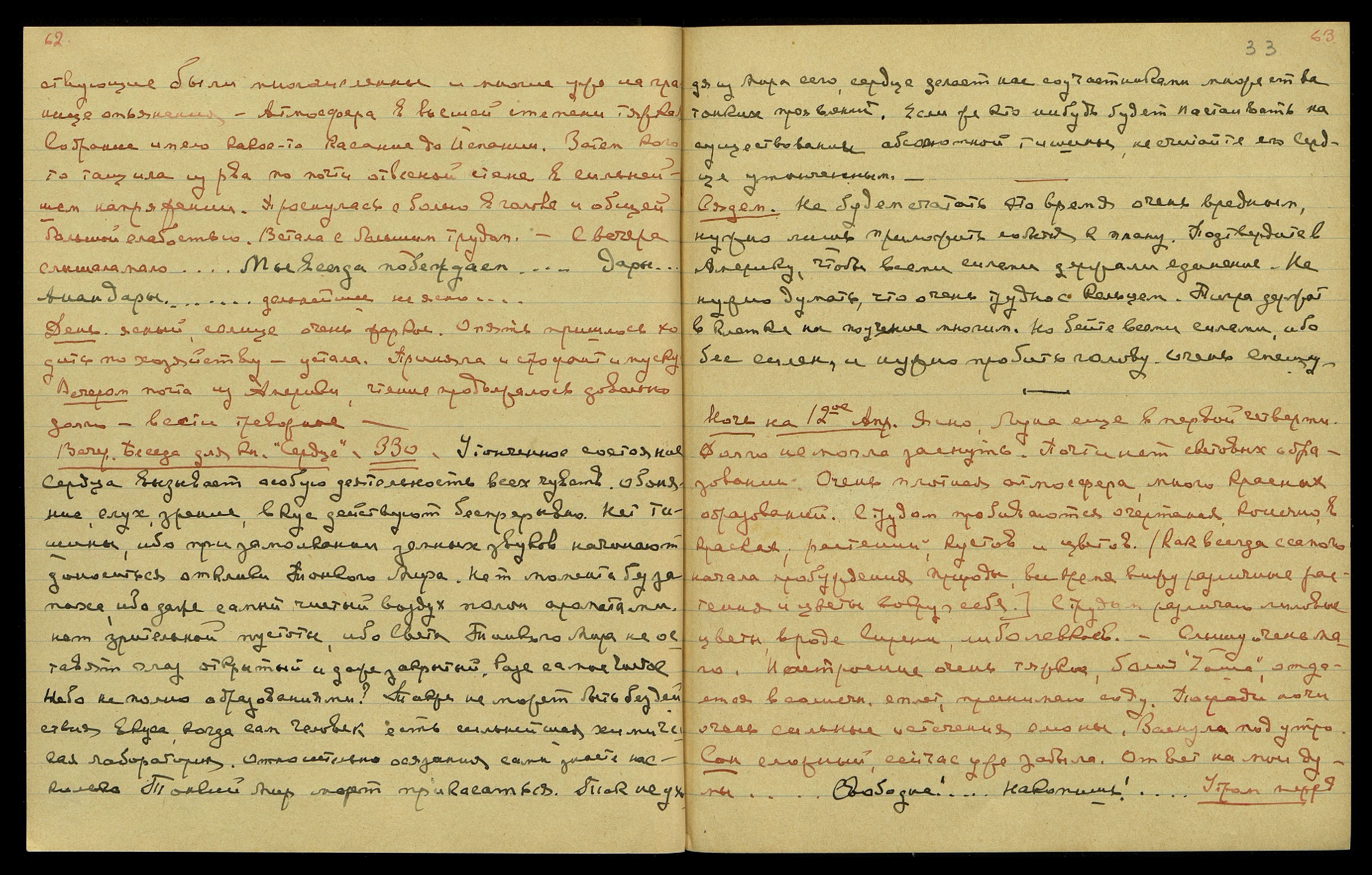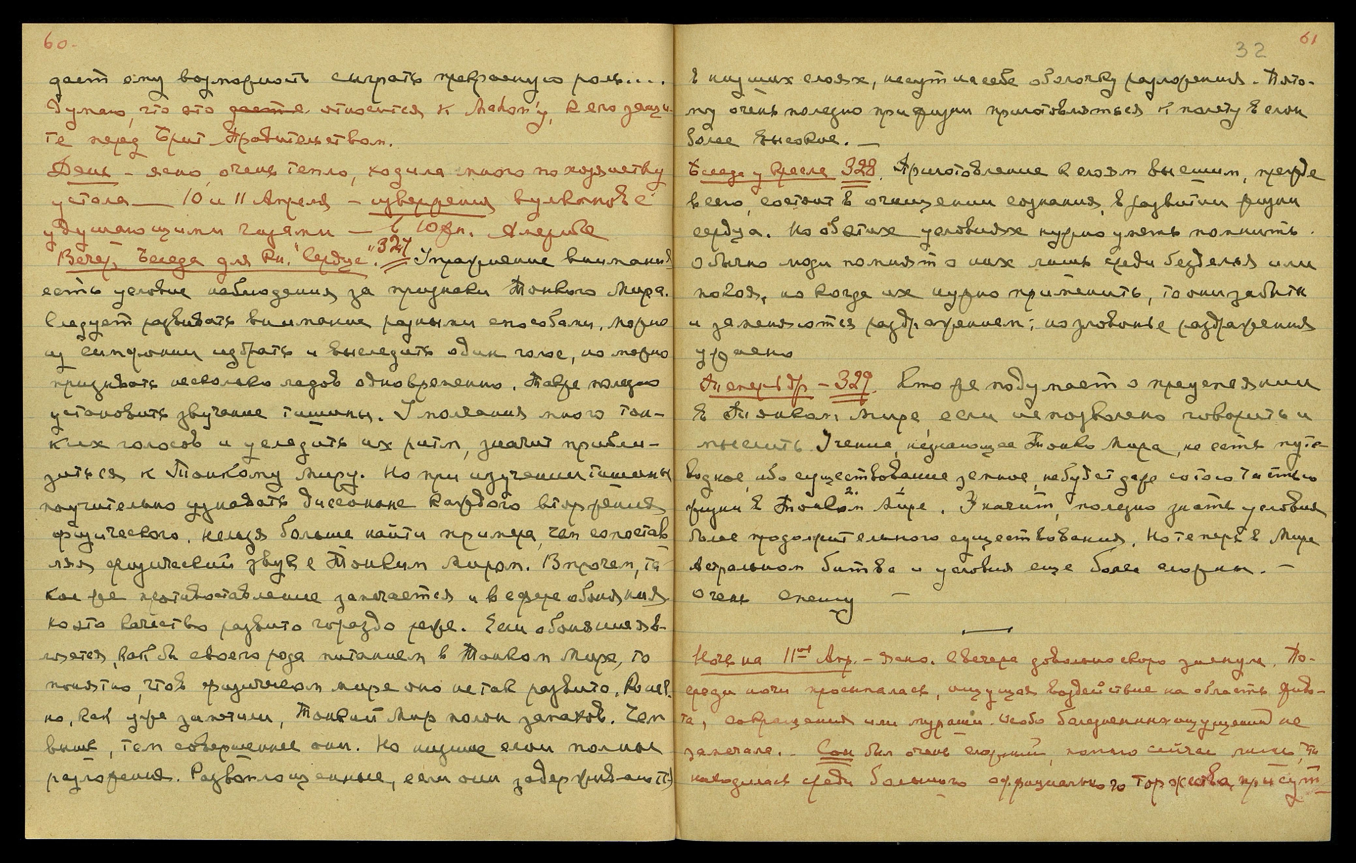 Ночь на 11-ое апр[еля]. Ясно. С вечера довольно скоро заснула. Посреди ночи просыпалась, ощущая воздействие на область живота, сокращения или мураши. Особо болезненных ощущений не замечала. Сон был очень сложный. Помню сейчас лишь, что находилась среди большого, официального торжества, присут-