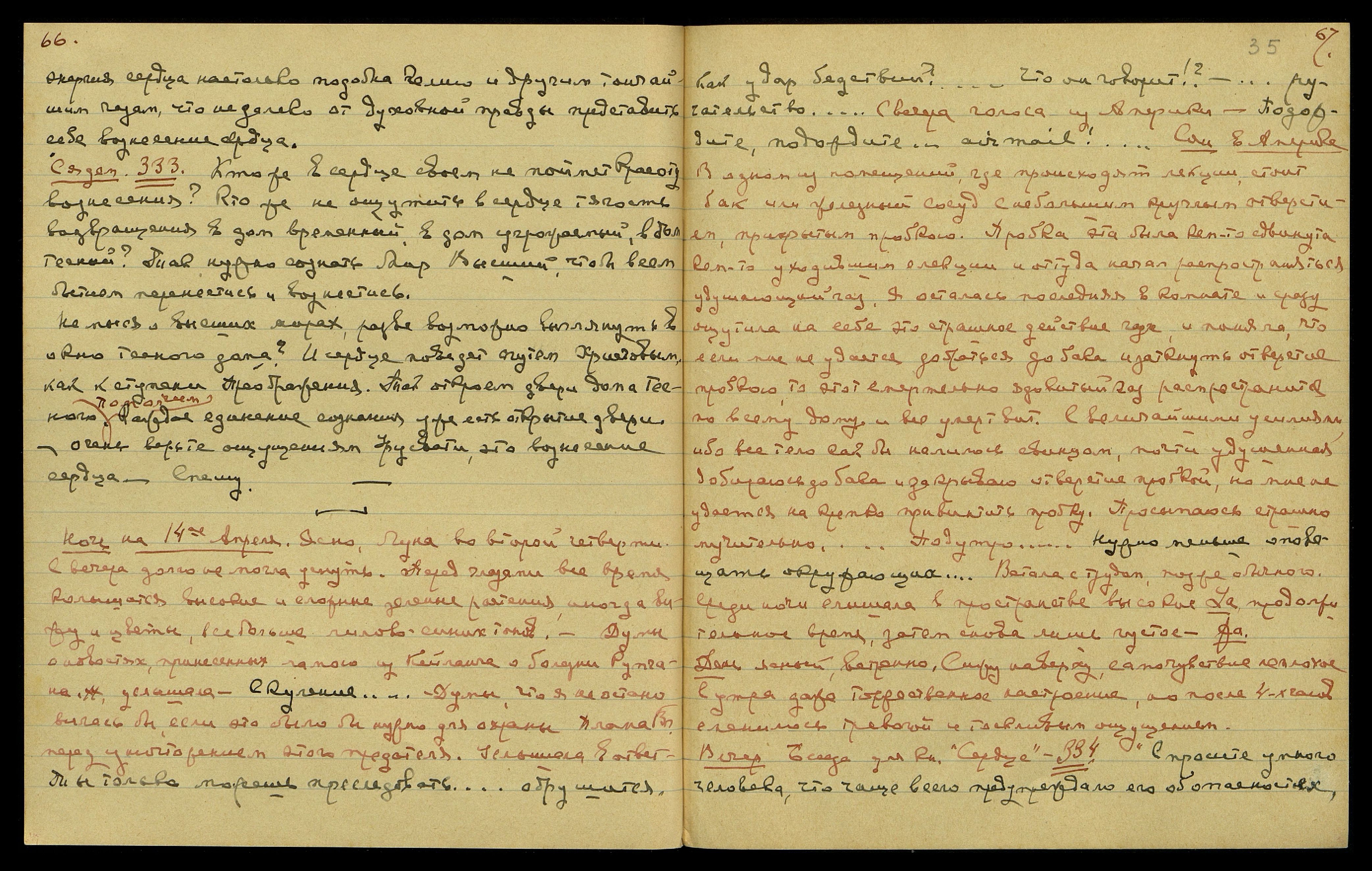 Ночь на 14-ое апреля. Ясно. Луна во второй четверти. С вечера долго не могла уснуть. Перед глазами всё время колышатся высокие и сложные зелёные растения. Иногда вижу и цветы, всё больше лилово-синих тонов. Думы о новостях, принесённых ламою из Кейланга о болезни Рупчана, услышала: "Скуление..." Думы, что я не остановилась бы, если это было бы нужно для охраны Плана Вл[адыки] перед уничтожением этого предателя. Услышала в ответ: "Ты только можешь преследовать... обрушится, как удар бедствий!... Что он говорит?... ручательство..." С вечера голоса из Америки: "Подождите, подождите... air mail [англ.: воздушная почта!]" Сон в Америке. В одном из помещений, где происходят лекции, стоит бак или железный сосуд с небольшим, круглым отверстием, прикрытым пробкою. Пробка эта была кем-то сдвинута, кем-то уходившим с лекции, и оттуда начал распространяться удушающий газ. Я осталась последняя в комнате и сразу ощутила на себе это страшное действие газа и поняла, что если мне не удастся добраться до бака и заткнуть отверстие пробкой, то этот смертельно ядовитый газ распространится по всему дому и всё умертвит. С величайшими усилиями, ибо всё тело как бы налилось свинцом, почти удушенная, добираюсь до бака и закрываю отверстие пробкой, но мне не удаётся накрепко привинтить пробку. Просыпаюсь страшно мучительно. Под утро. "Нужно меньше оповещать окружающих..." Встала с трудом, позже обычного. Среди ночи слышала в пространстве высок[ую ноту] La, продолжительное время, затем снова лишь густое Фа.