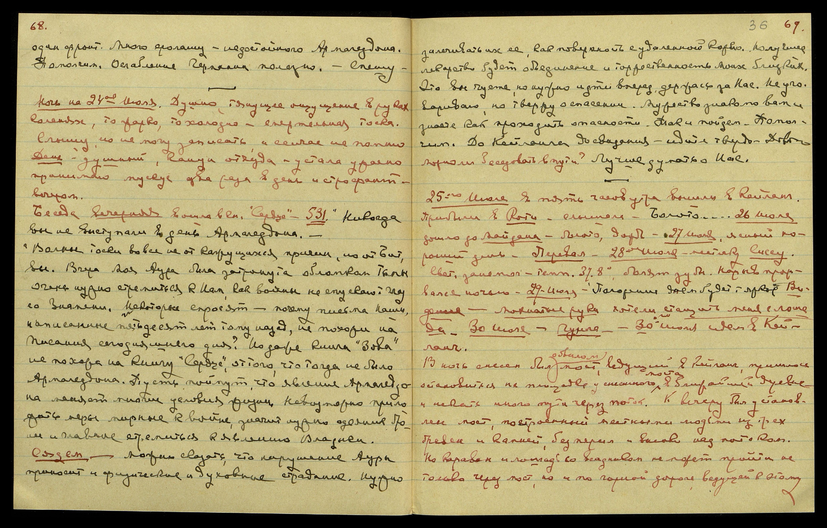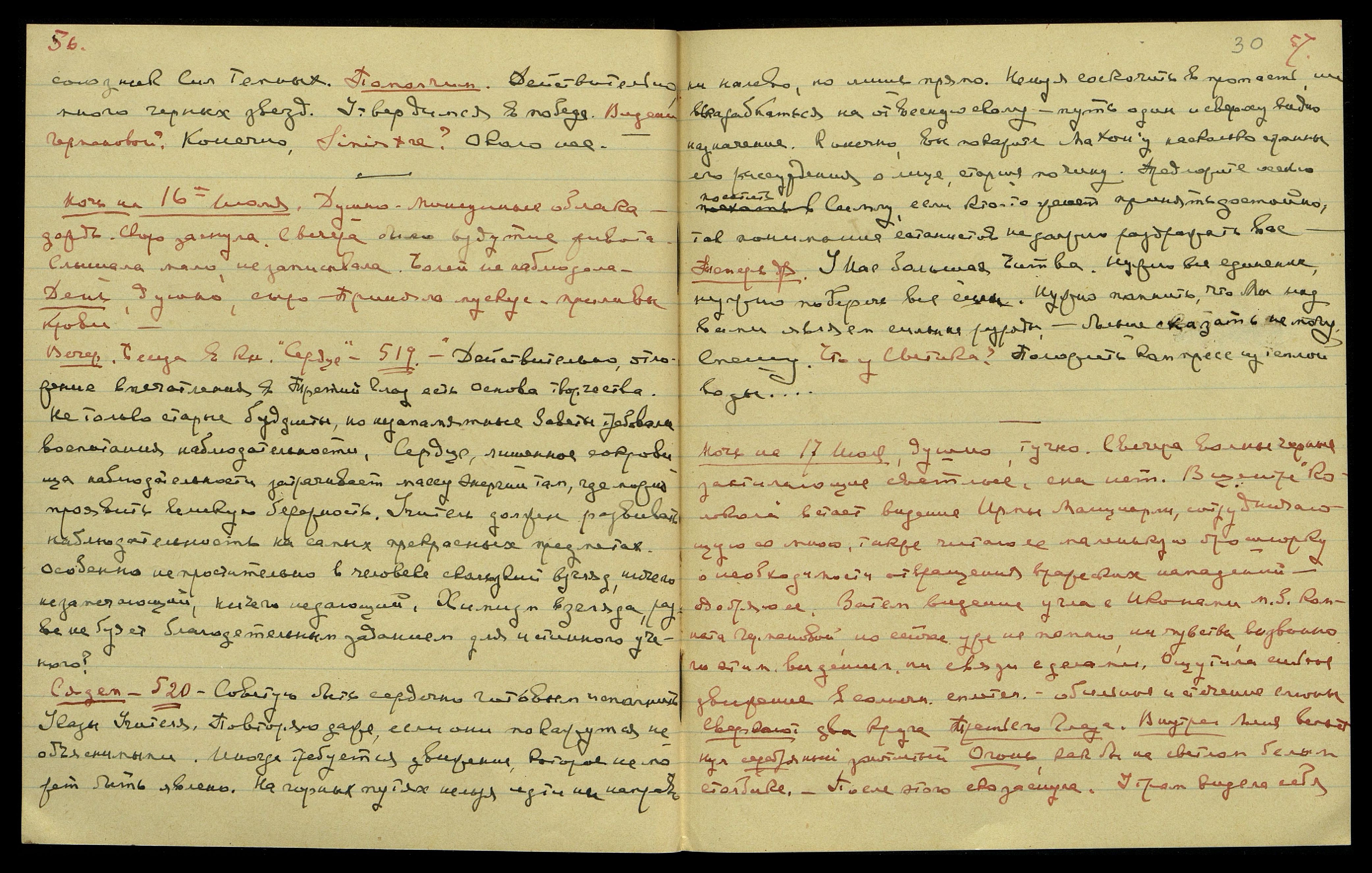 Ночь на 18-ое июля. Душно, дождь. Воздействие вибраций на сердце... Спала больше обычного. Просыпаясь, каждый раз видела столбец русской газеты, должно быть, очередная клевета! С вечера слышала, м[ожет] б[ыть], ответ на думы: "Хвалю!..." Остальное не помню.