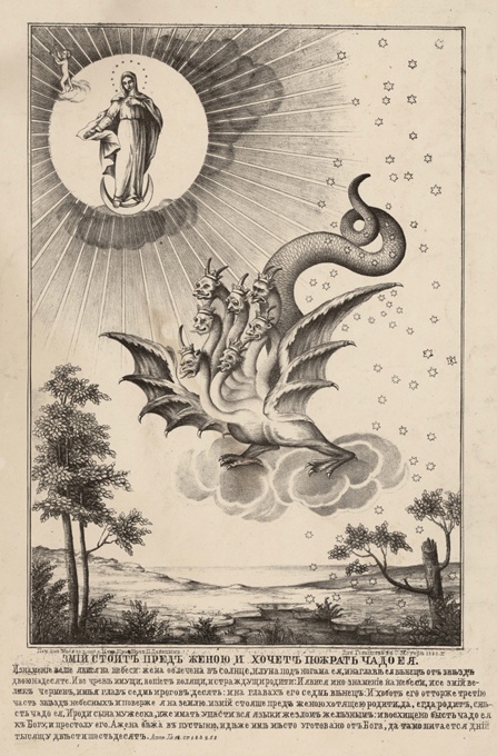 «Самым справедливым мнением может быть признано то, которое принимается большинством толкователей и которое состоит в понимании под образом жены Христианской Церкви и притом на всем протяжении ея истории, от первых дней Апостолов и кончая временем господства антихриста. Жена, это — именно святая и славная Христова Церковь, какою она была с самаго своего начала и какою она должна остаться до конца мира». «Жена имела во чреве и кричала, так наступило время ея родов. Эти мучения — муки и труды Христианской Церкви, которыя испытывает она при рождении, — приобретении каждаго новаго члена, при обращении заблуждающихся, при раскаянии грешника 1), и относятся вообще по всему времени существования Христ. Церкви. Знамение дракона Иоанн также видит на небе, что означает лишь то, его образ был замечен на небесном своде, где явился и образ жены. Дракон, будучи морским чудовищем (Ис. LI, 34), обратился в символ изображения земной силы, владыки мира. Поэтому диавол как князь мира сего является в Апокалипсисе под образом дракона».