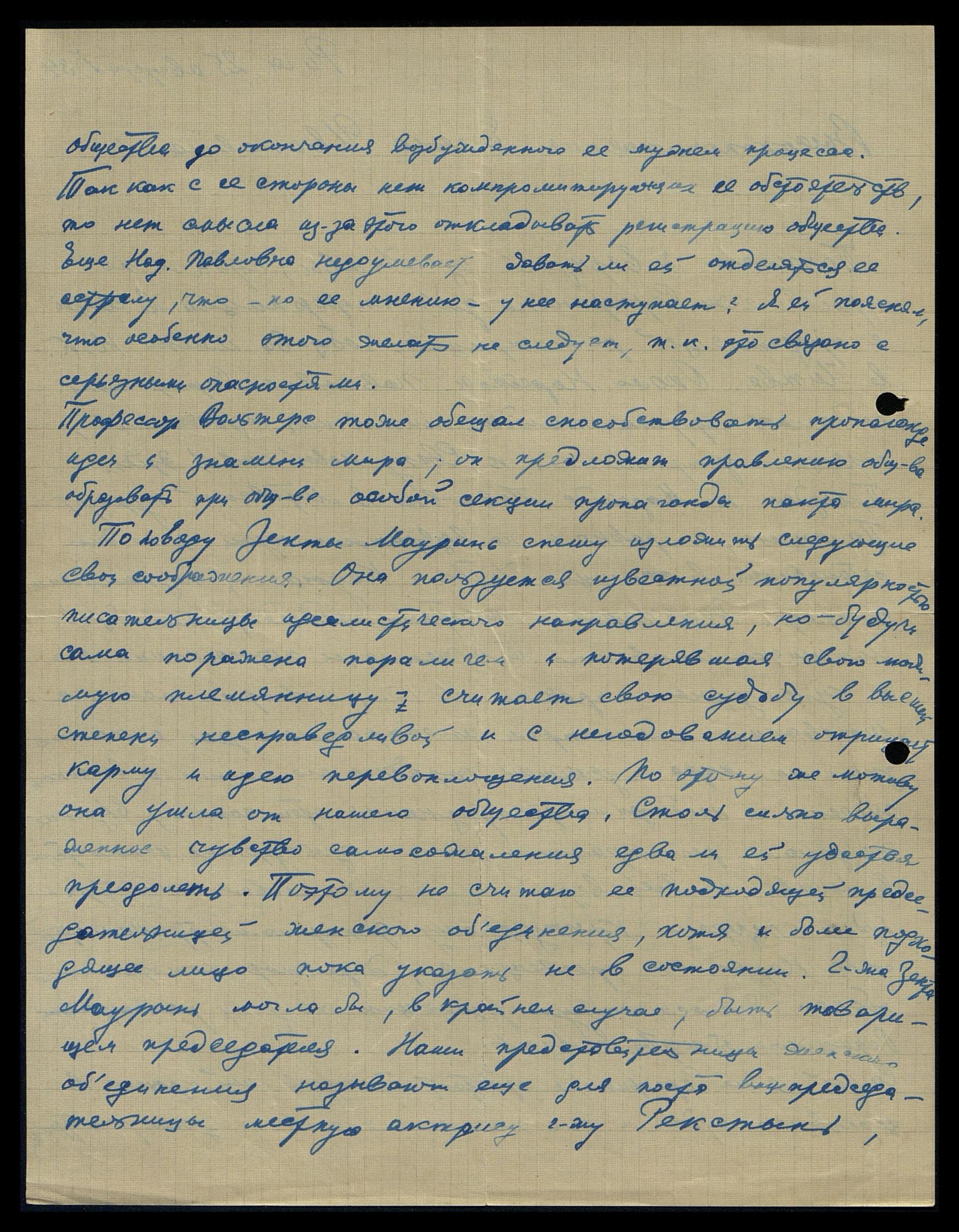 Профессор Волтерс тоже обещал способствовать пропаганде идеи знамени мира; он предложит правлению общества образовать при обществе особой секции пропаганды пакта мира. По поводу Зенты Мауринь* спешу изложить следующие свои соображения. Она пользуется известной популярностью писательницы идеалистического направления, но, будучи сама поражена параличом и потерявшая свою мощную племянницу, считает свою судьбу в высшей степени несправедливой и с негодованием отрицает карму и идею перевоплощения. По этому же мотиву она ушла от нашего общества. Столь сильно выраженное чувство самосожаления едва ли ей удастся преодолеть. Поэтому не считаю её подходящей председательницей женского объединения, хотя и более подходящее лицо пока указать не в состоянии. Г-жа Зента Мауринь могла бы, в крайнем случае, быть товарищем председателя. Наши представительницы женского объединения называют ещё для поста вице председательницы местную актрису г-жу Рекстынь,