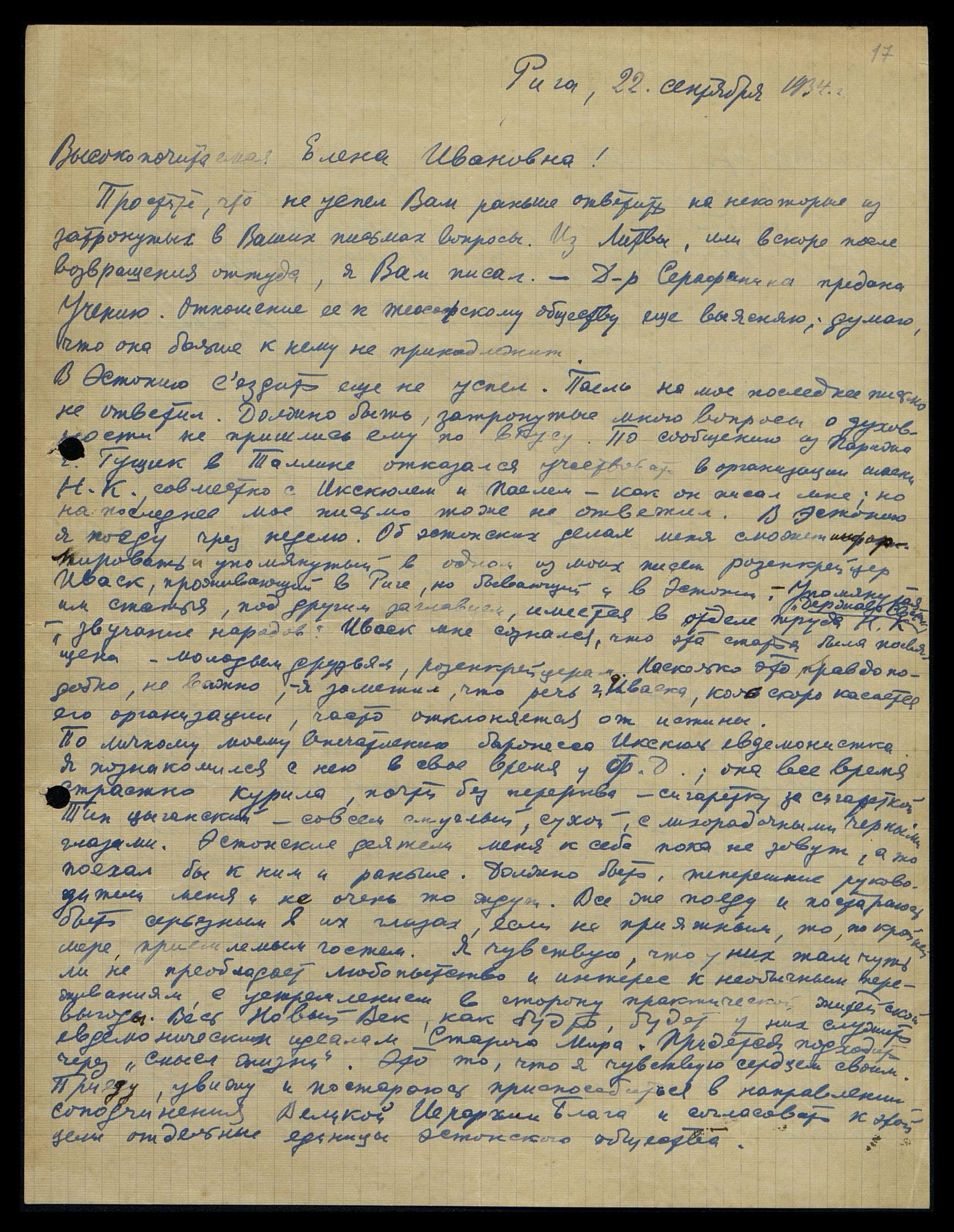 Простите, что не успел Вам раньше ответить на некоторые из затронутых в Ваших письмах вопросы. Из Литвы, или вскоре после возвращения оттуда, я Вам писал, [что] д-р Серафинина предана Учению. Отношение её к теософскому обществу ещё выясняю; думаю, что она больше к нему не принадлежит.