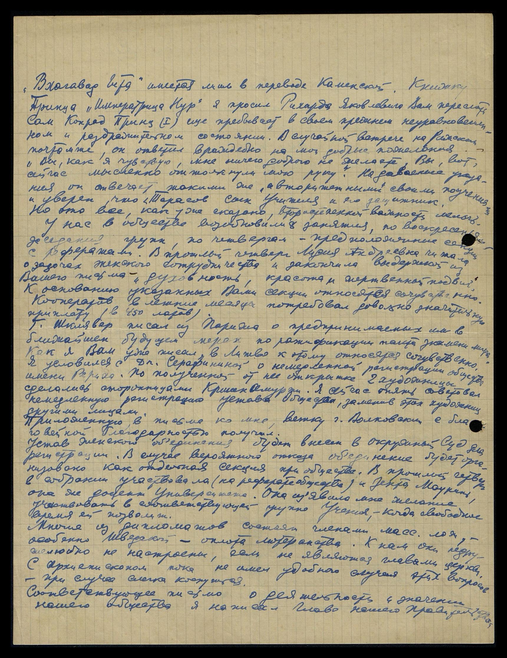 "Бхагавад Гита" имеется лишь в переводе Каменской. Книжку Принца "Императрица Нур" я просил Рихарда Яковлевича Вам переслать. Сам Конрад Принц ещё пребывает в своём прежнем неуравновешенном и раздражительном состоянии. При случайной встрече на Рижском почтамте он ответил враждебно на мои добрые пожелания: "Вы, как я чувствую, мне ничего доброго не желаете. Вы, вот, сейчас мысленно оттолкнули мою руку". На даваемые указания он отвечает такими же "авторитетными" своими поучениями и уверен, что г. Тарасов — сын Учителя и его защитник. Но это всё, как уже сказано, второстепенной важности мелочь.