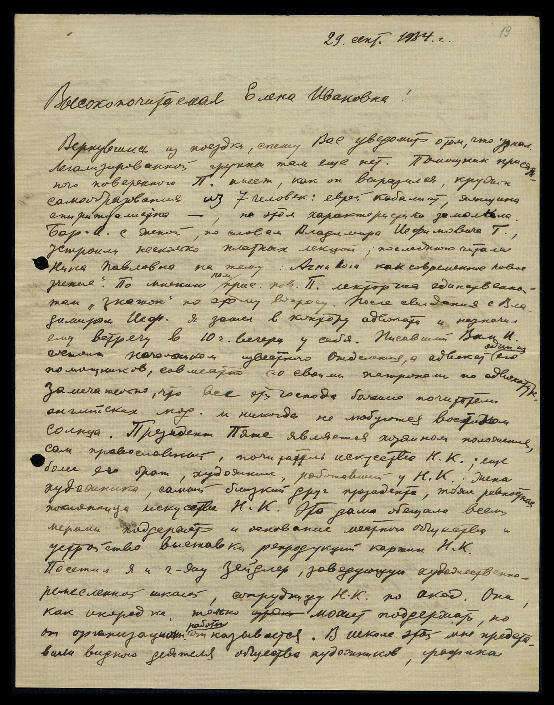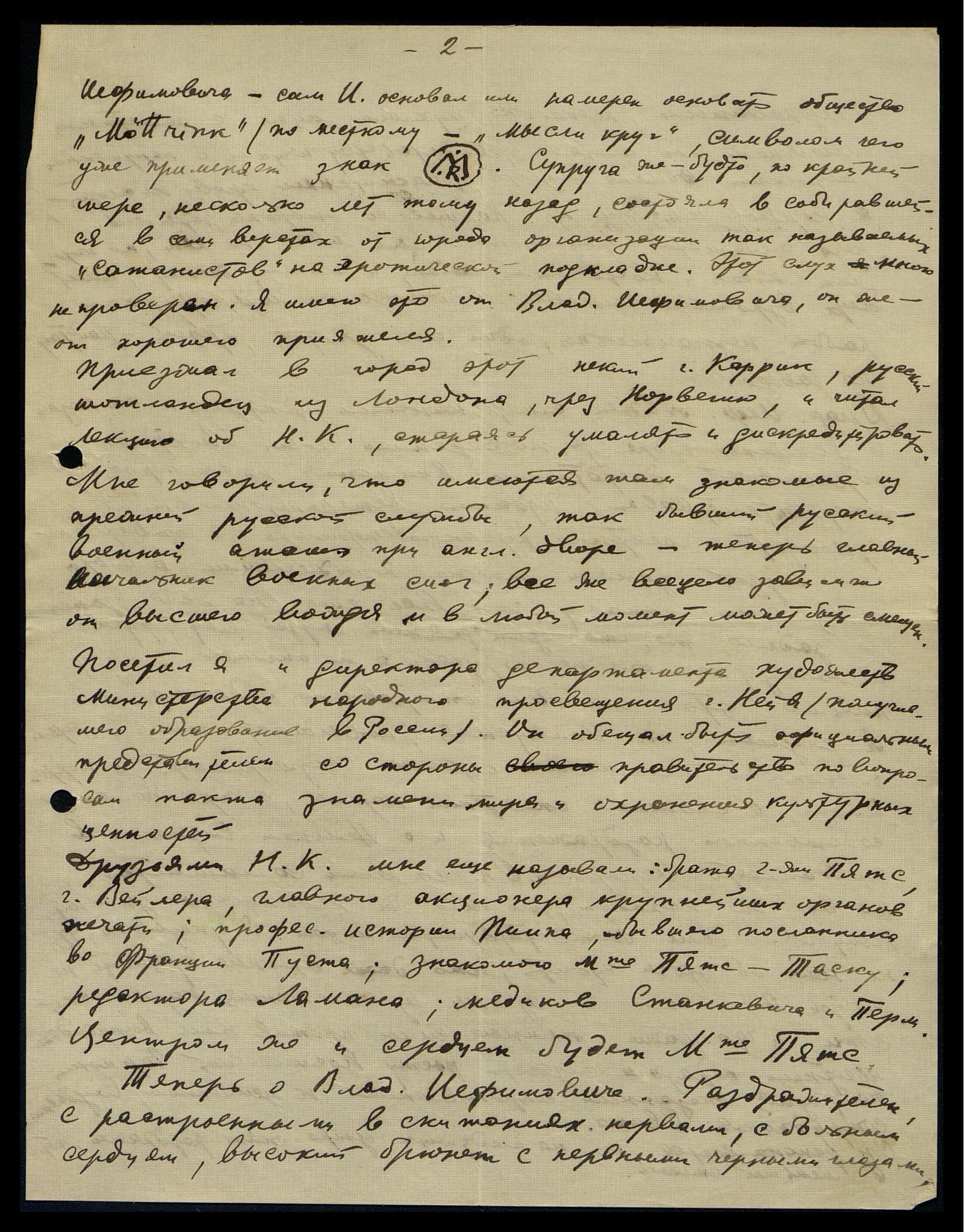 Вернувшись из поездки, спешу Вас уведомить о том, что узнал. Легализированной группы там ещё нет. Помощник присяжного поверенного Пеаль имеет, как он выразился, кружок самообразования из 7 человек: еврей каббалист, женщина-спиритуалистка, на этом характеристика замолкла, Барон Икскуль с женой, по словам Владимира Ефимовича Гущика*, устроили несколько платных лекций; последнюю читала Нина Павловна на тему: "Агни Йога как современное новое учение". По мнению помощника присяжного поверенного Пеаля лекторша единственный там "знаток" по этому вопросу. После свидания с Владимиром Ефимовичем [Гущиком] я зашёл в контору адвоката и назначил ему встречу в 10 ч. вечера у себя. Писавший Вам И. состоит начальником известного отделения, а адвокат - один из его помощников, совместно со своим патроном по адвокатуре. Замечательно, что все эти господа - большие почитатели Солнца. Президент Пяте является хозяином положения, сам - православный, почитатель искусства Н.К.; ещё более его брат, художник, работавший у Н.К. Жена художника, самый близкий друг президента, тоже ревностная поклонница искусства Н.К. Эта дама обещала всеми мерами поддержать и основание местного общества, и устройство выставки репродукций картин Н.К.