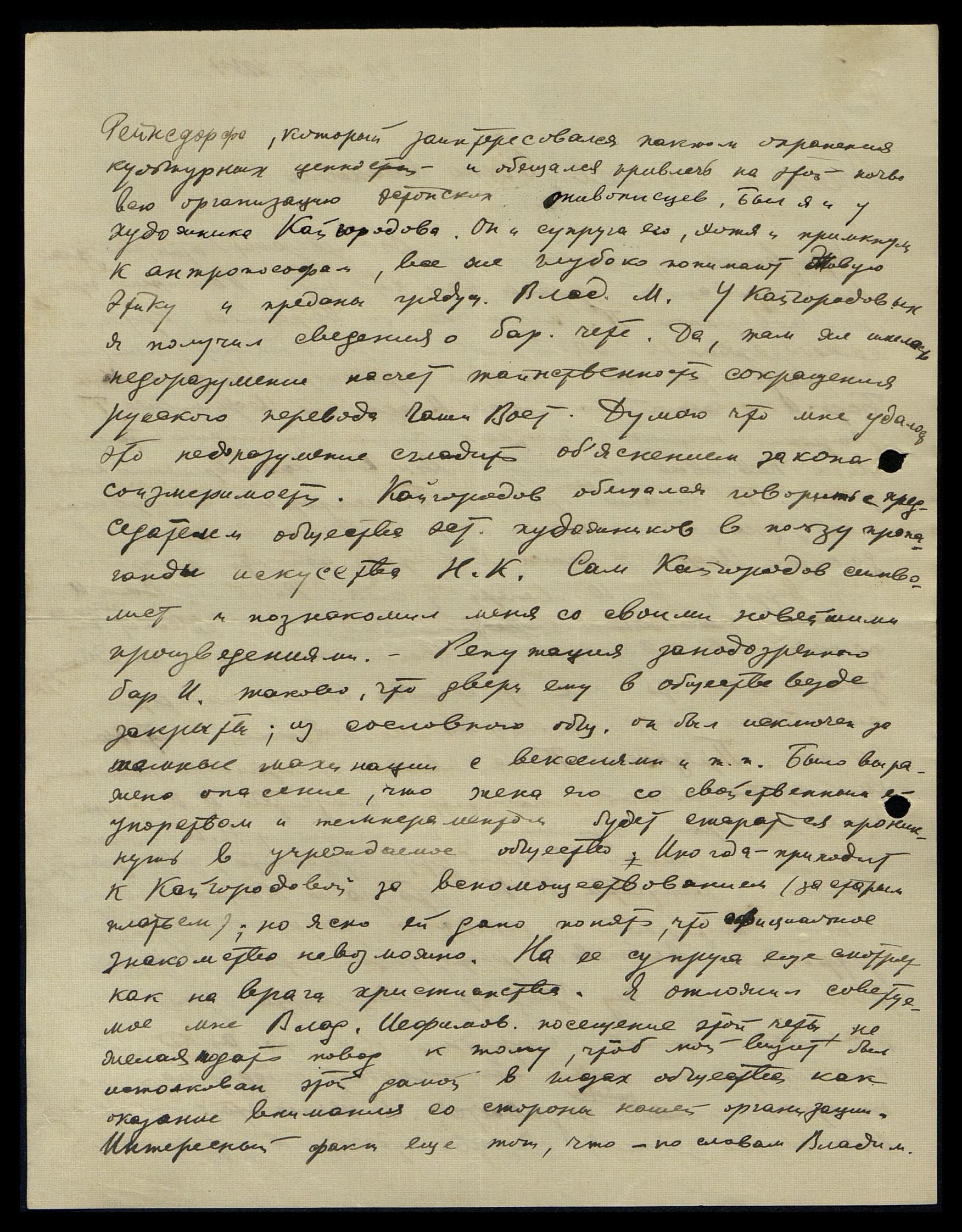 Рейнсдорфа, который заинтересовался пактом охранения культурных ценностей и обещался привлечь на этой почве всю организацию эстонских живописцев. Был я и у художника Кайгородова. Он и супруга его, хотя и примкнули к антропософам, всё же глубоко понимают Живую Этику и преданы грядущему Владыке М[айтрейе]. У Кайгородовых я получил сведения о баронской чете. Да, там же имелось недоразумение насчёт таинственности сокращения русского перевода "Чаши Востока". Думаю, что мне удалось это недоразумение сгладить объяснением закона соизмеримостей. Кайгородов обещался говорить с председателем общества эстонских художников в пользу пропаганды искусства Н.К. Сам Кайгородов - символист и познакомил меня со своими новейшими произведениями. Репутация заподозренного барона Икскуля такова, что двери ему в обществе везде закрыты; из сословного общества он был исключён за тёмные махинации с векселями и т.п. Было выражено опасение, что жена его, со свойственным ей упорством и темпераментом, будет стараться проникнуть в учреждаемое общество. Иногда приходит к Кайгородовой за вспоществованием (за старым платьем); но ясно ей дано понять, что официальное знакомство невозможно. На её супруга ещё смотрят как на врага христианства. Я отклонил советуемое мне Владимиром Ефимовичем [Гущиком] посещение этой четы, чтоб мой визит был истолкован этой дамой в глазах общества как оказание внимания со стороны нашей организации. Интересный факт ещё тот, что по словам Владимира