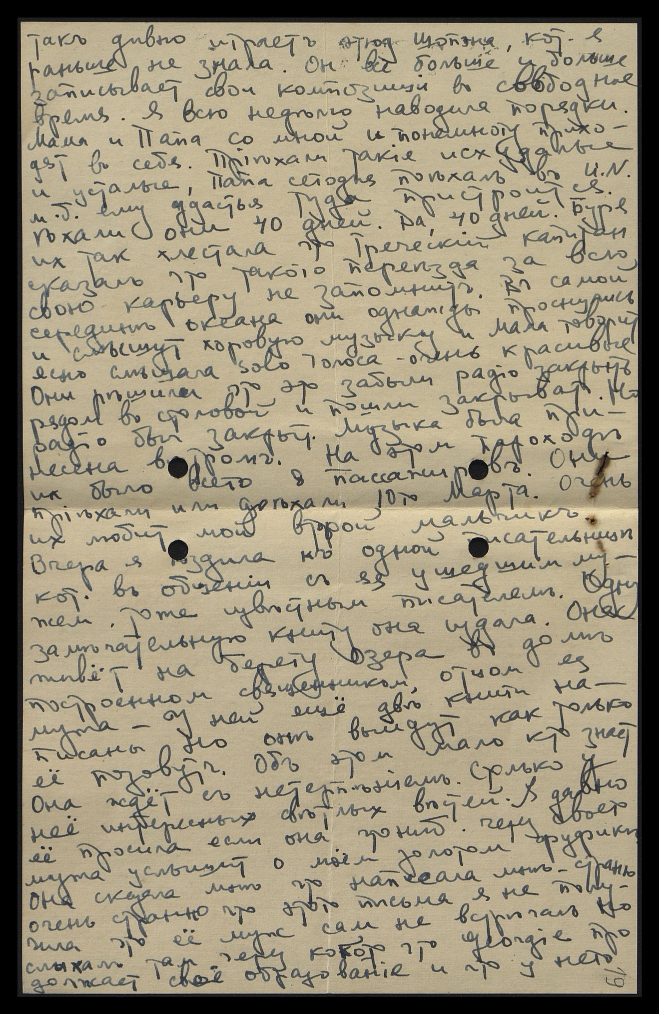 так давно играет этюд Шопена, кот[орый] я раньше не знала. Он всё больше и больше записывает свои композиции в свободное время. Я всю неделю наводила порядки. Мама и Папа со мной и понемногу приходят в себя. Приехали такие исхудалые и усталые, Папа сегодня поехал в U.N., м[ожет] б[ыть], ему удастся туда пристроиться. Ехали они 40 дней. Да, 40 дней. Буря их так хлестала, что греческий капитан сказал, что такого переезда за всю свою карьеру не запомнил. В самой середине океана они однажды проснулись и слышат хоровую музыку, и Мама говорит, ясно слышала Solo голоса очень красивые. Они решили, что это забыли радио закрыть рядом со столовой и пошли закрывать. Но радио был закрыт, музыка была принесена ветром. На этом пароходе их было всего 8 пассажиров. Они приехали, или доехали, 10-го марта. Очень их любит мой второй мальчик. Вчера я ездила к одной писательнице, кот[орая] в общении с ея ушедшим мужем, тоже известным писателем. Одну замечательную книгу она издала. Она живёт на берегу озера в доме, построенном священником, отцом ея мужа. У ней ещё две книги написаны, но они выйдут, как только её позовут. Об этом мало кто знает. Она ждёт с нетерпением. Столько у неё интересных, светлых вестей. Я давно её просила, если она что-ниб[удь] через своего мужа услышит о моём золотом фуфике. Она сказала мне, что написала мне. Странно, очень странно, что этого письма я не получила, что её муж сам не встречал, но слыхал там через кого-то, что Georgie продолжает своё образование, и что у него