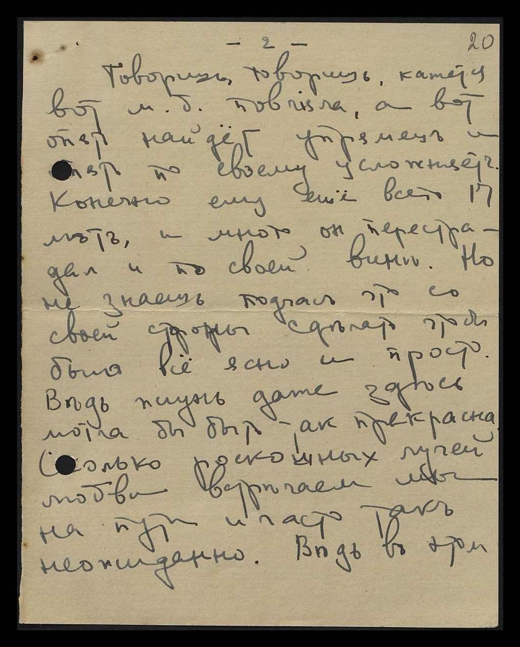 Говоришь, говоришь, кажется, вот, м[ожет] б[ыть], [одно слово неразборчиво], а вот опять найдёт упрямец и опять по-своему усложняет. Конечно, ему ещё всего 17 лет, и много он перестрадал и по своей вине. Но не знаешь подчас, что со своей стороны сделать, чтобы было всё ясно и просто. Ведь жизнь даже здесь могла бы быть так прекрасна. Сколько роскошных лучей любви встречаем мы на пути и часто так неожиданно. Ведь в этом