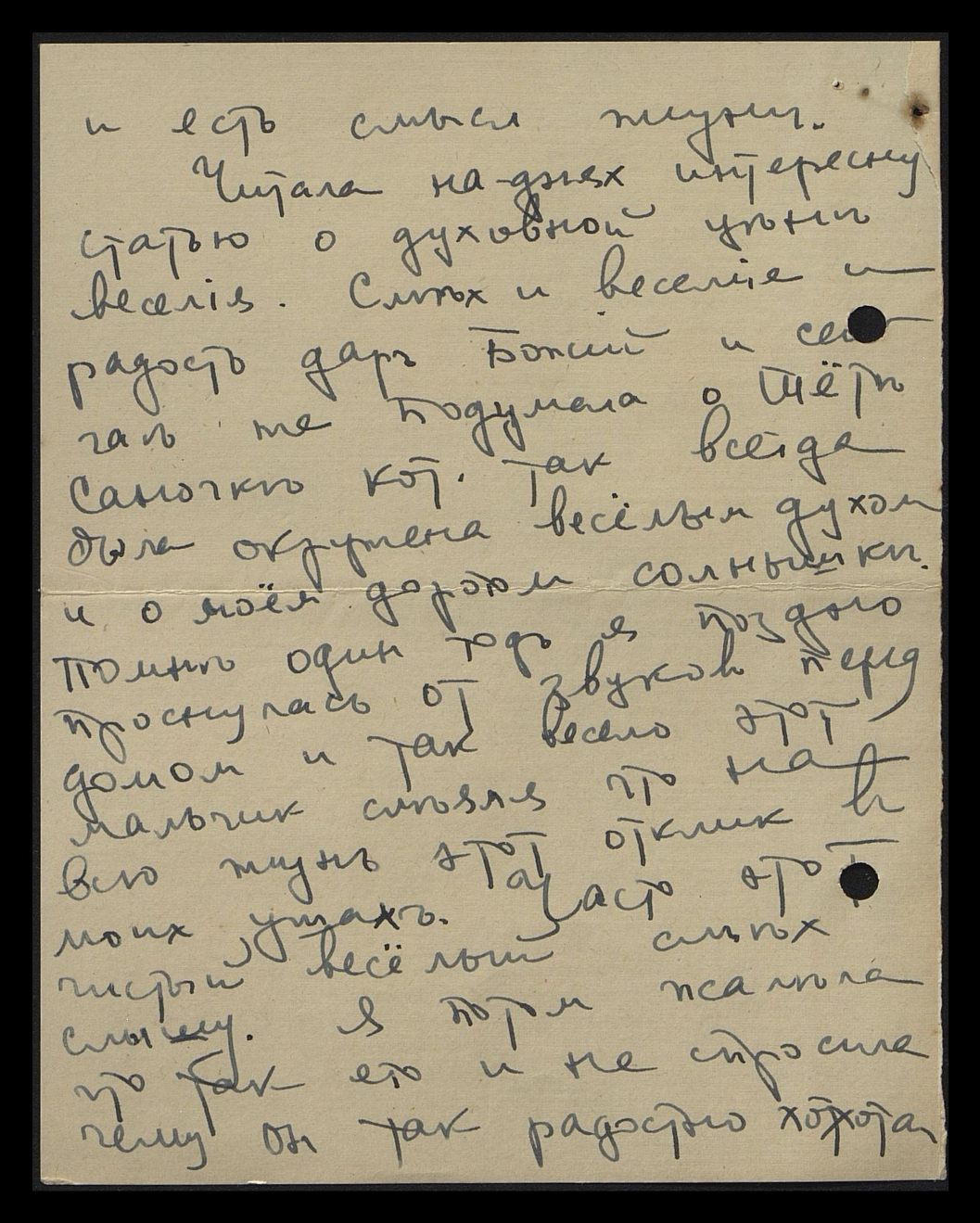 Читала на днях интересную статью о духовной цене веселья. Смех и веселье? и радость - дар Божий? и сейчас же подумала о Тёте Саночке, кот[орая] так всегда была окружена весёлым духом и о моём дорогом солнышке. Помню один год я поздно проснулась от звуков перед домом, и так весело этот мальчик смеялся, что на всю жизнь этот отклик в моих ушах. Часто этот чистый, весёлый смех слышу. Я потом писала, что так его и не спросила, чему он так радостно хохотал