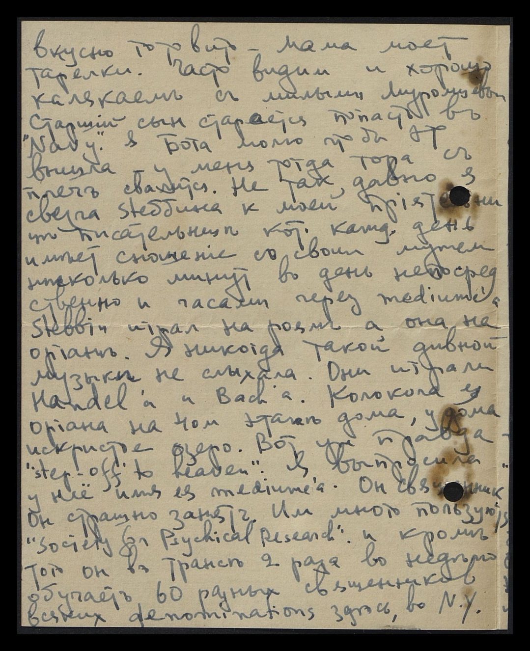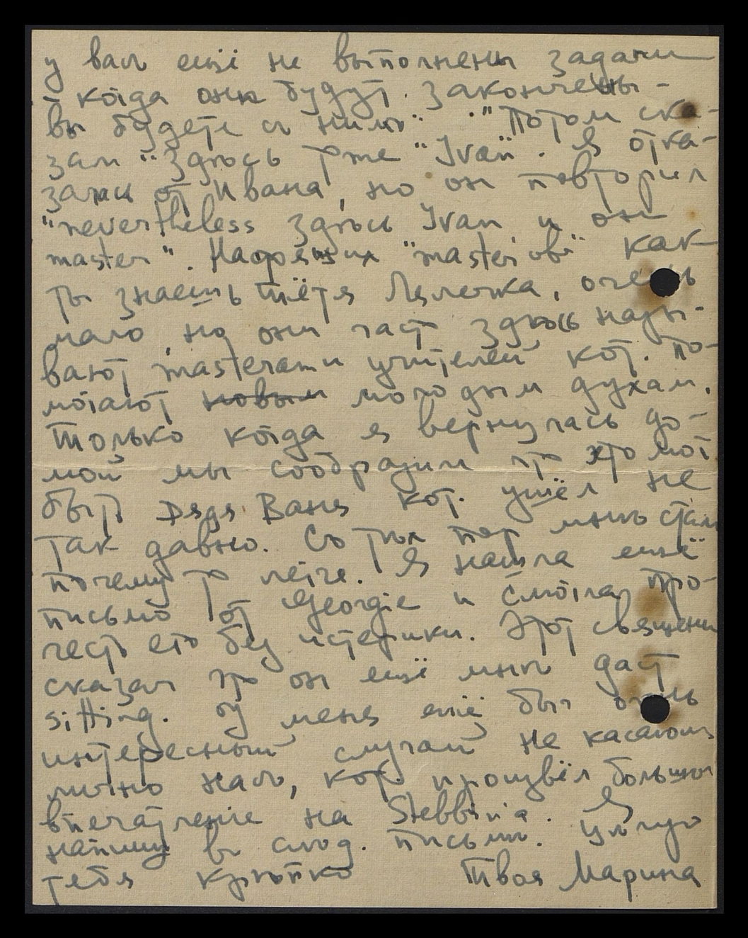 у вас ещё не выполнены задачи, когда они будут закончены — вы будете с ним". Потом сказал: "Здесь тоже "Ivan". Я отказалась от Ивана, но он повторил: "Never theless [тем не менее] здесь Ivan и он master". Настоящих "master'ов", как ты знаешь, Тётя Лялечка, очень мало, но они часто здесь называют master'ами и учителей, кот[орые] помогают новым молодым духам. Только когда я вернулась домой, мы сообразили, что это мог быть Дядя Ваня, кот[орый] ушёл не так давно. С тех пор мне стало почему-то легче. Я нашла ещё письмо Georgie и смогла прочесть его без истерики. Этот священник сказал, что он ещё мне даст sitiing [англ.: расположение]. У меня ещё был очень интересный случай, не касающийся лично нас, кот[орый] произвёл большое впечатление на Stebbin'a. Я напишу в след[ующем] письме. Целую тебя крепко.