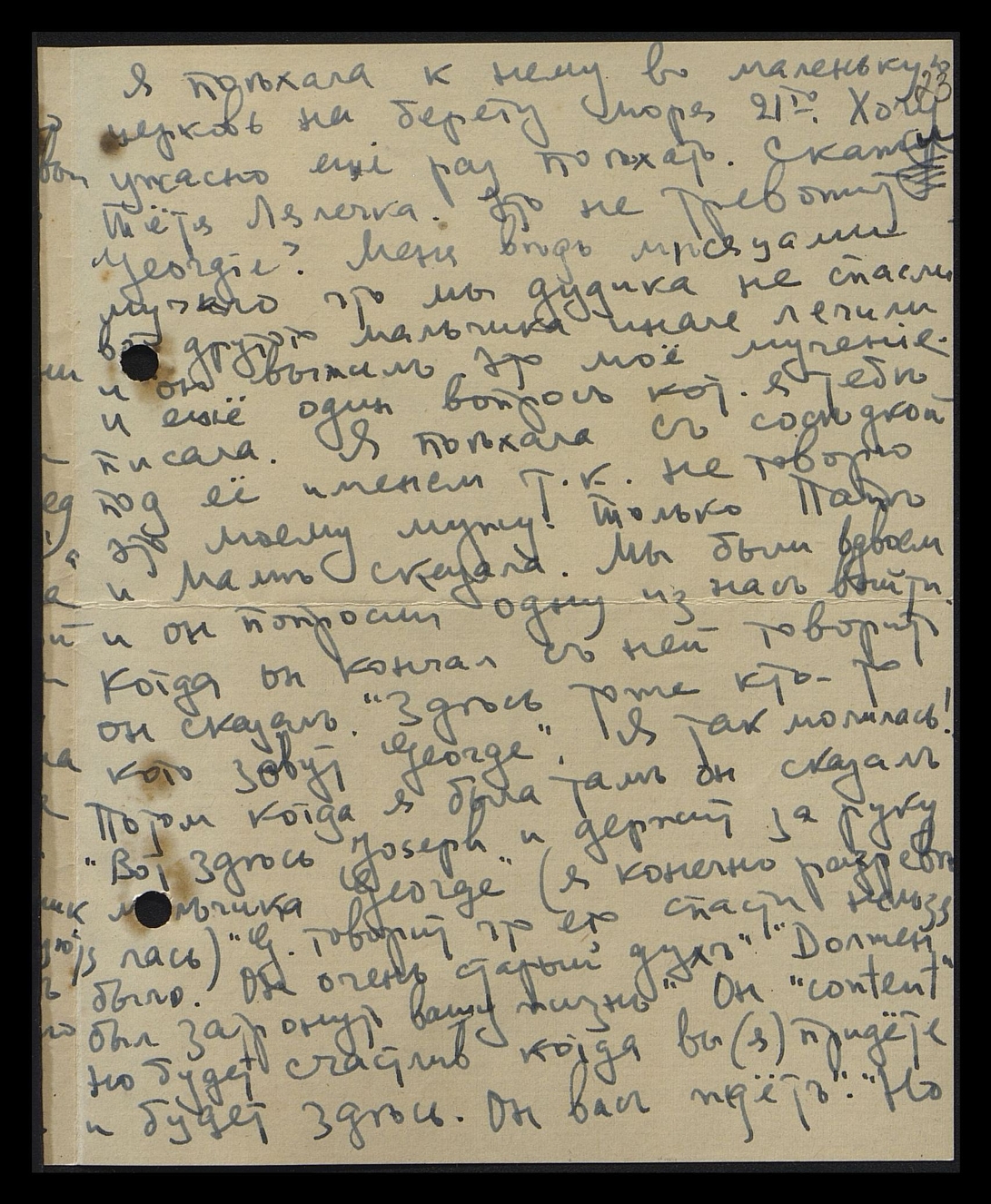 Я поехала к нему в маленькую церковь на берегу моря 21-го. Хочу ужасно ещё раз поехать. Скажи, Тётя Лялечка, это не тревожит Georgie? Меня ведь месяцами мучило, что мы дудика не спасли, вот другого мальчика иначе лечили, и он выжил. Это моё мучение. И ещё один вопрос, кот[орый] я тебе писала. Я поехала с соседкой под её именем т.к. не говорю это моему мужу. Только Папе и Маме сказала. Мы были вдвоём, и он попросил одну из нас выйти. Когда он кончал с ней говорить, он сказал: "Здесь тоже кто-то, кого зовут Georgie". Я так молилась! Потом, когда я была там, он сказал: "Вот здесь Joseph и держит за руку мальчика Georgie (я конечно разревелась). G[eorgie] говорит, что его спасти нельзя было. Он очень старый дух. Должен был затронуть вашу жизнь. Он "content", но будет счастлив, когда вы (я) придёте, и будет здесь. Он вас ждёт". Но
