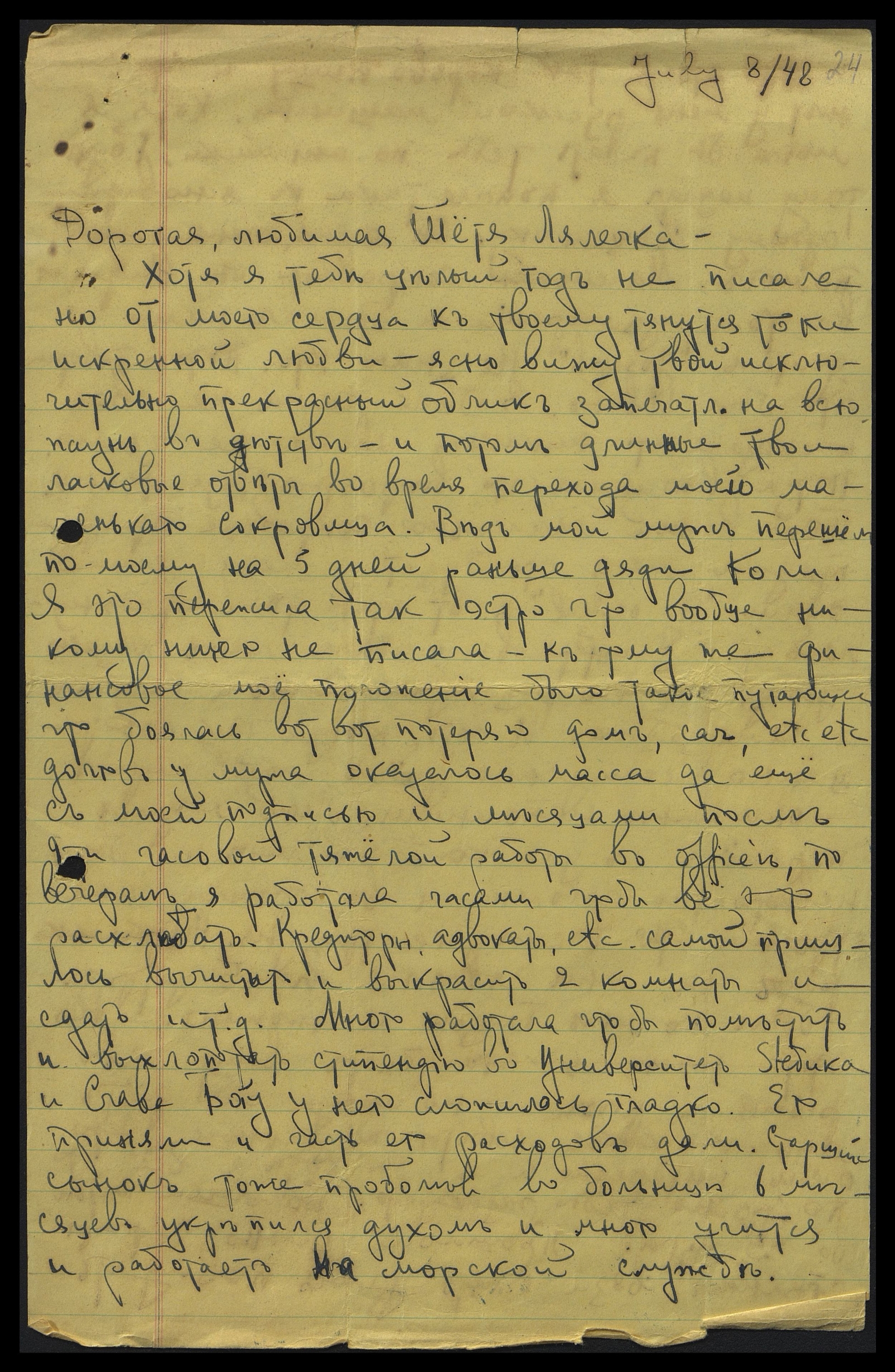 Хотя я тебе целый год не писала, но от моего сердца к твоему тянутся токи искренней любви. Ясно вижу твой исключительно прекрасный облик, запечатл[енный] на всю жизнь в детстве, и потом длинные твои ласковые ответы во время перехода моего маленького сокровища. Ведь мой муж перешёл, по-моему, на 5 дней раньше дяди Коли. Я это пережила так остро, что вообще никому ничего не писала, к тому же финансовое моё положение было такое пугающее, что боялась вот-вот потеряю дом, car, etc etc. Долгов у мужа оказалось масса, да ещё с моей подписью, и месяцами после 9-ти часовой тяжёлой работы в office, по вечерам, я работала часами, чтобы всё это расхлебать. Кредиторы, адвокаты, etc. Самой пришлось вычистить и выкрасить 2 комнаты и сдать и т.д. Много работала, чтобы поместить и выхлопотать стипендию от Университета Ste'бика и? Cлава Богу, у него сложилось гладко. Его приняли и часть его расходов дали. Старший сынок тоже? проболев в больнице? укрепился духом и много учится? и работает на морской службе.