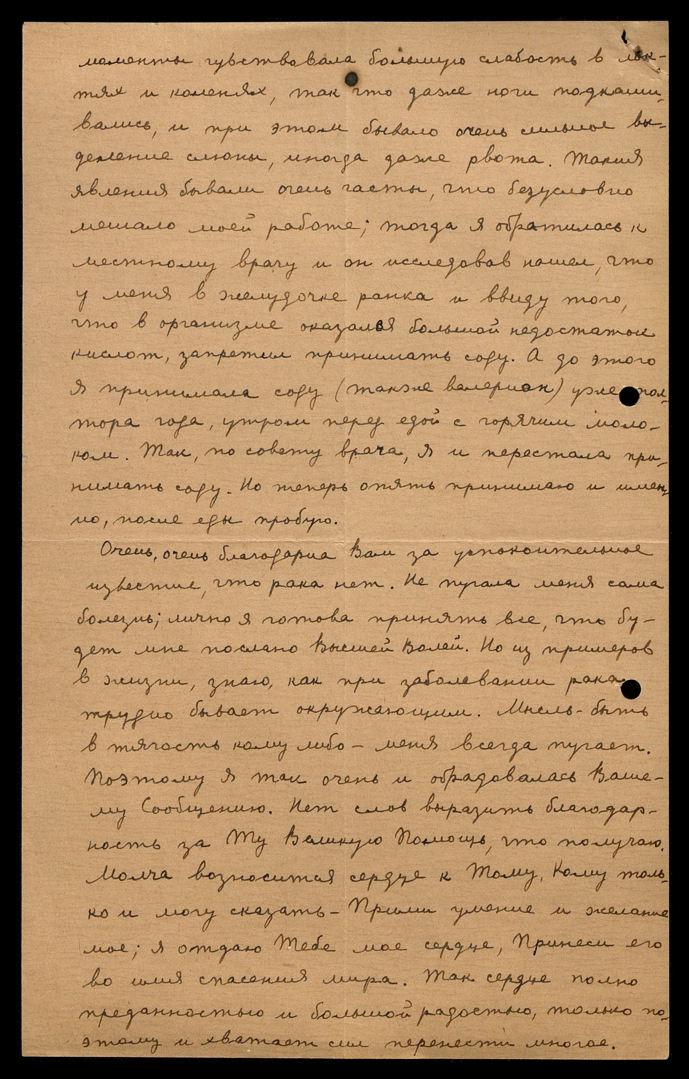 Очень, очень благодарна Вам за успокоительное известие, что рака нет. Не пугала меня сама болезнь; лично я готова принять всё, что будет мне послано Высшей Волей. Но из примеров в жизни, знаю, как при заболевании рака трудно бывает окружающим. Мысль — быть в тягость кому-либо — меня всегда пугает. Поэтому я так очень и обрадовалась Вашему Сообщению. Нет слов выразить благодарность за Ту Великую Помощь, что получаю. Молча возносится сердце к Тому, Кому только и могу сказать — Прими умение и желание моё; я отдаю Тебе моё сердце, Принеси его во имя спасения мира. Так сердце полно преданностью и большой радостью, только поэтому и хватает сил перенести многое.