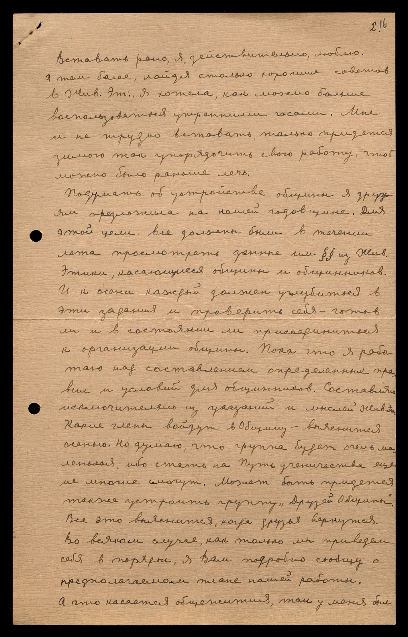 Подумать об устройстве общины я друзьям предложила на нашей годовщине. Для этой цели все должны были в течении лета просмотреть данные им §§ из Жив[ой] Этики, касающиеся общины и общинников. И к осени каждый должен углубиться в эти задания и проверить себя — готов ли и в состоянии ли присоединиться к организации общины. Пока что я работаю над составлением определённых правил и условий для общинников. Составляю исключительно из указаний и мыслей Жив[ой] Эт[ики]. Какие члены войдут в Общину — выяснится осенью. Но, думаю, что группа будет очень маленькая, ибо стать на Путь ученичества ещё немногие смогут. Может быть, придётся также устроить группу "Друзей Общины". Всё это выяснится, когда друзья вернутся. Во всяком случае, как только мы приведём себя в порядок, я Вам подробно сообщу о предполагаемом плане нашей работы. А что касается общежития, так у меня был